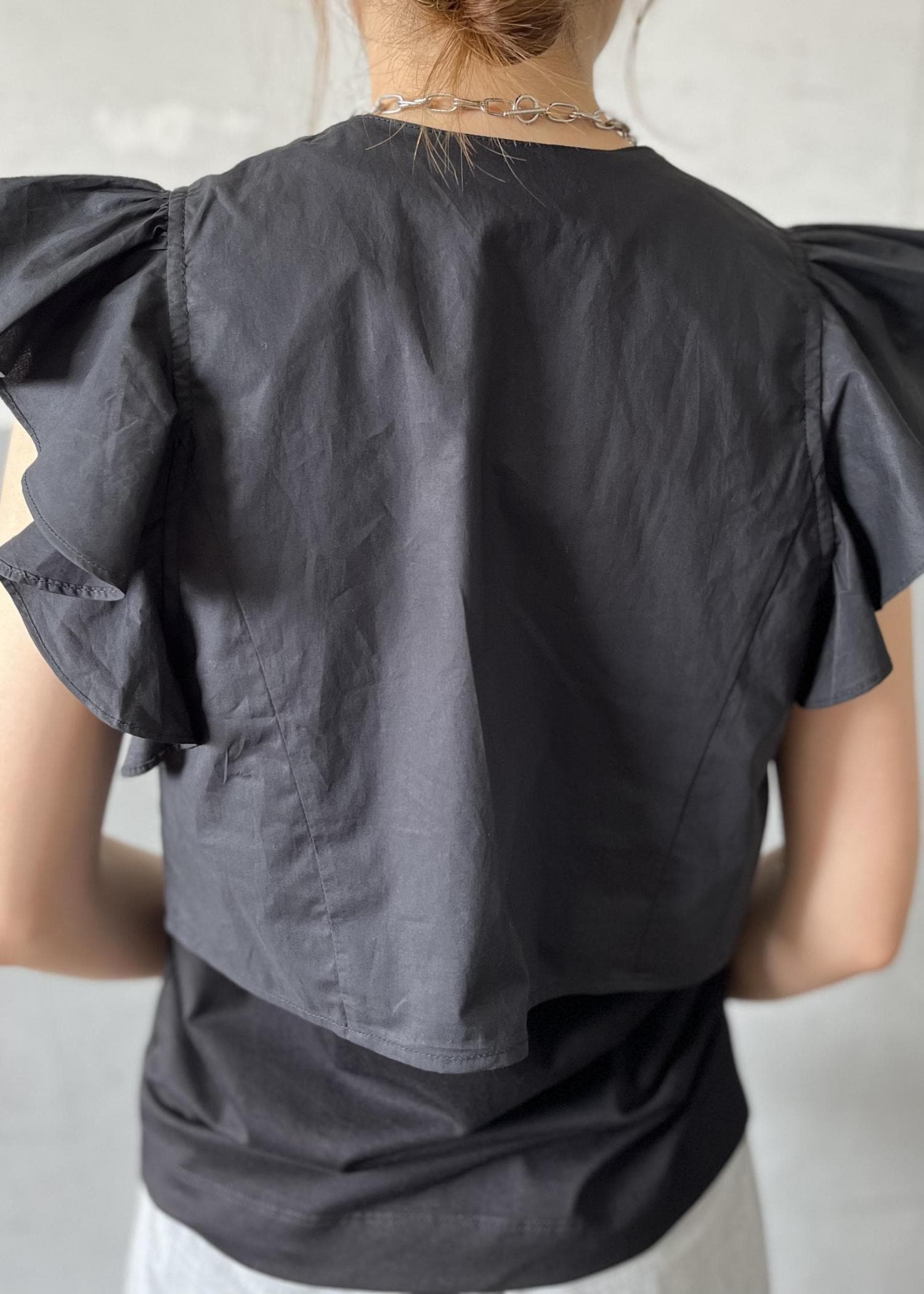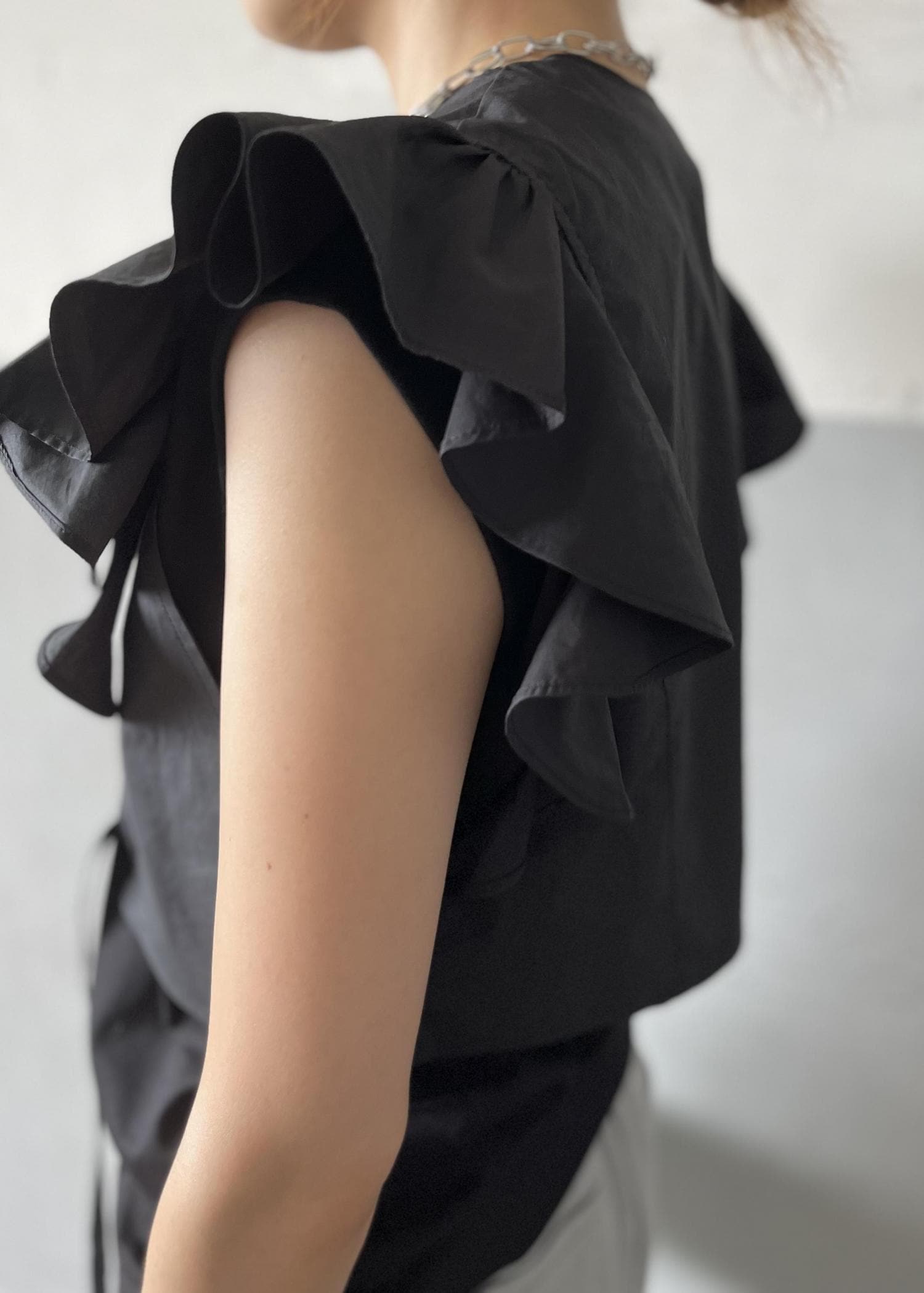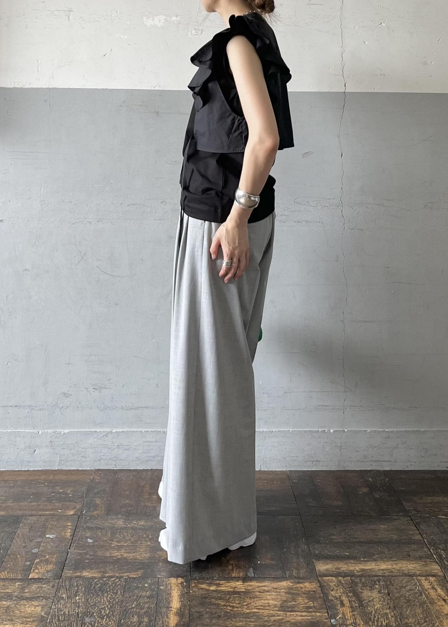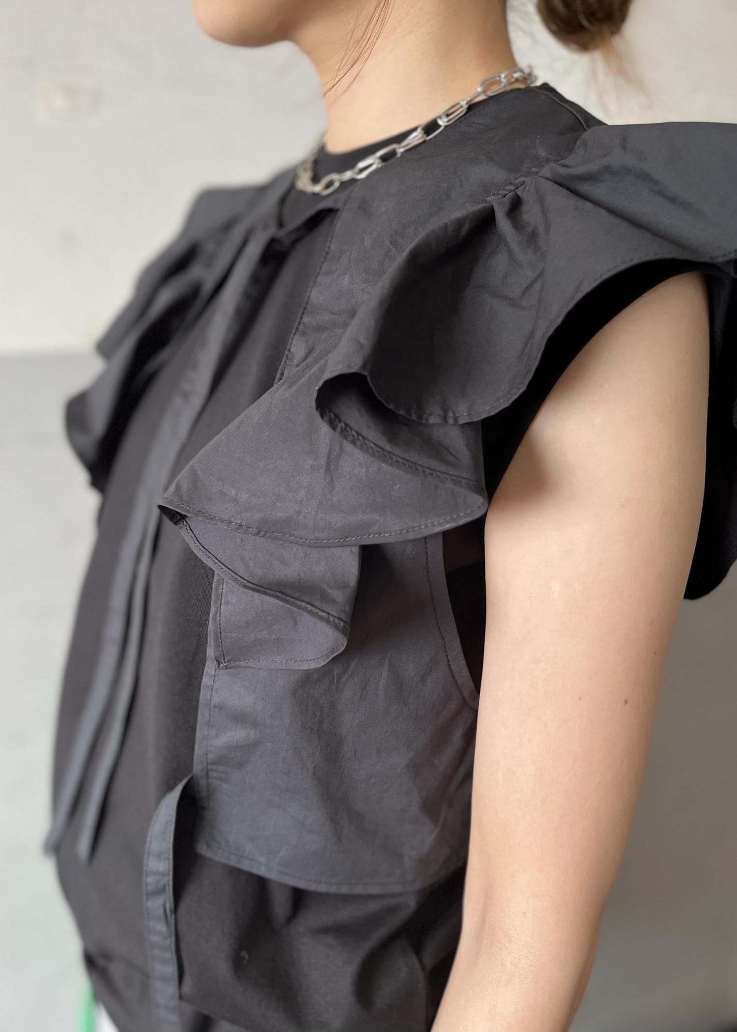 肌触りの良いシンプルなノースリーブカットソー(←こちら単体でもスッキリきれいなカタチ!)に、印象的なフリルデザインのジレをオン!肩にボリュームがあるので二の腕カバーも出来ます◎