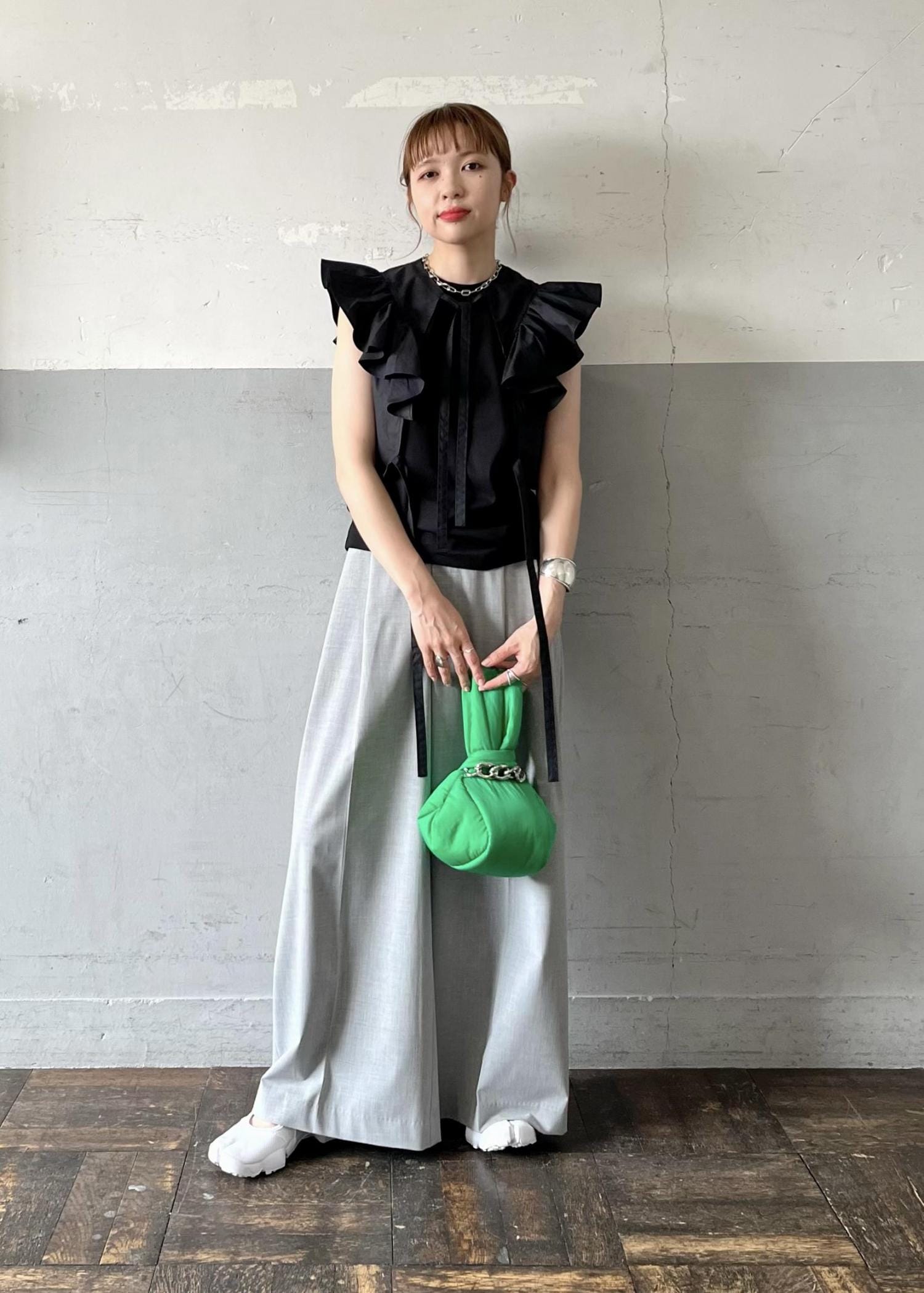 甘めな印象なのでマニッシュなスラックスとハズしでスニーカーをコーディネート。