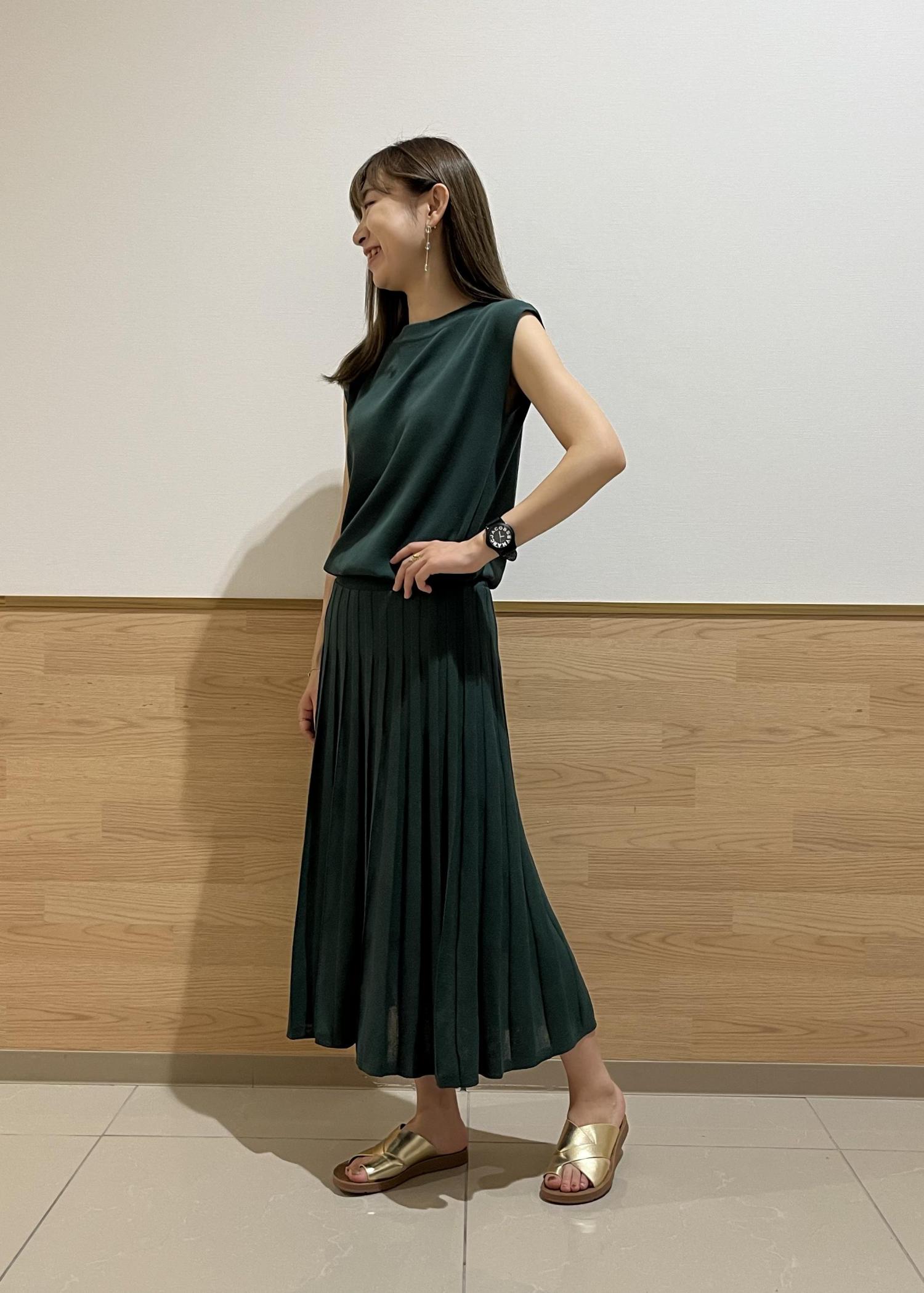 スカート部がプリーツになっているグリーンワンピースとブラウンのジャケットを組合せ上品に仕上げました。