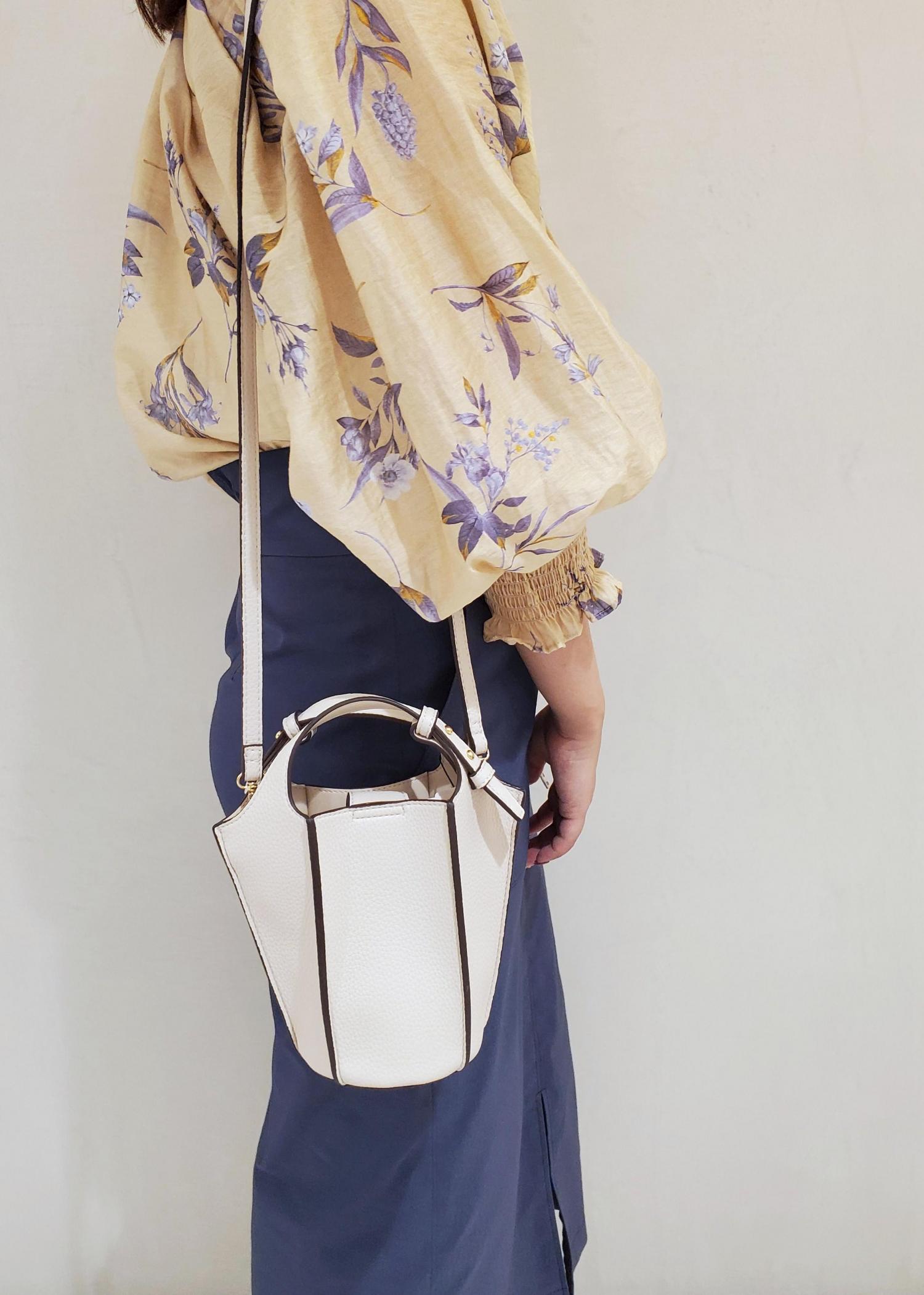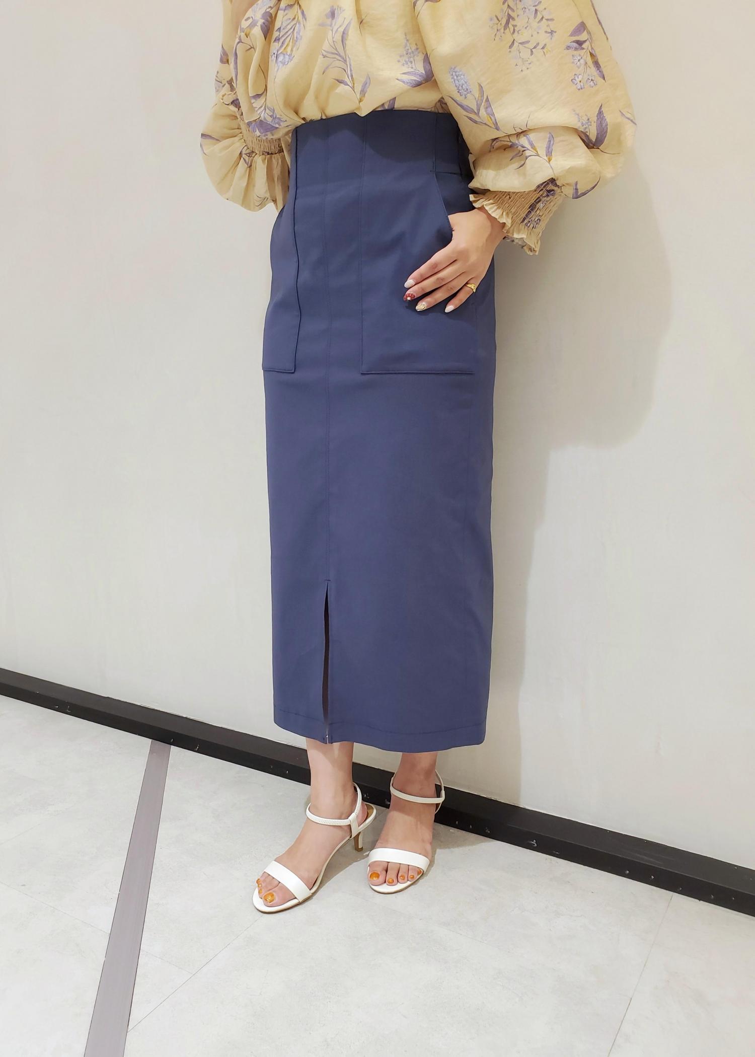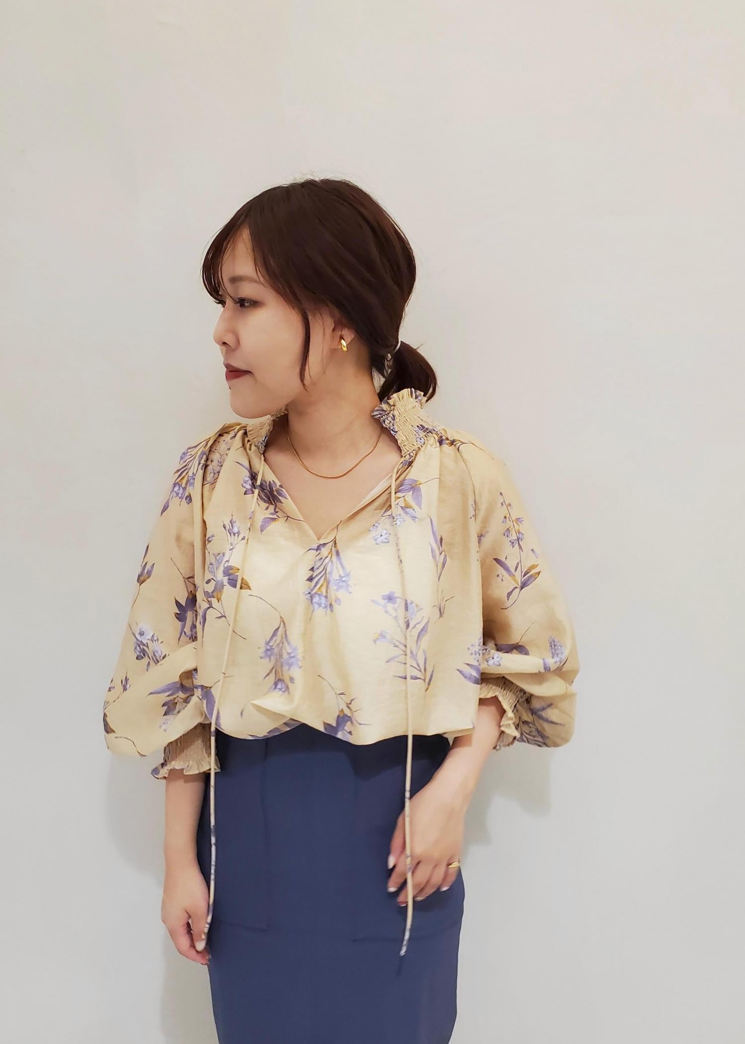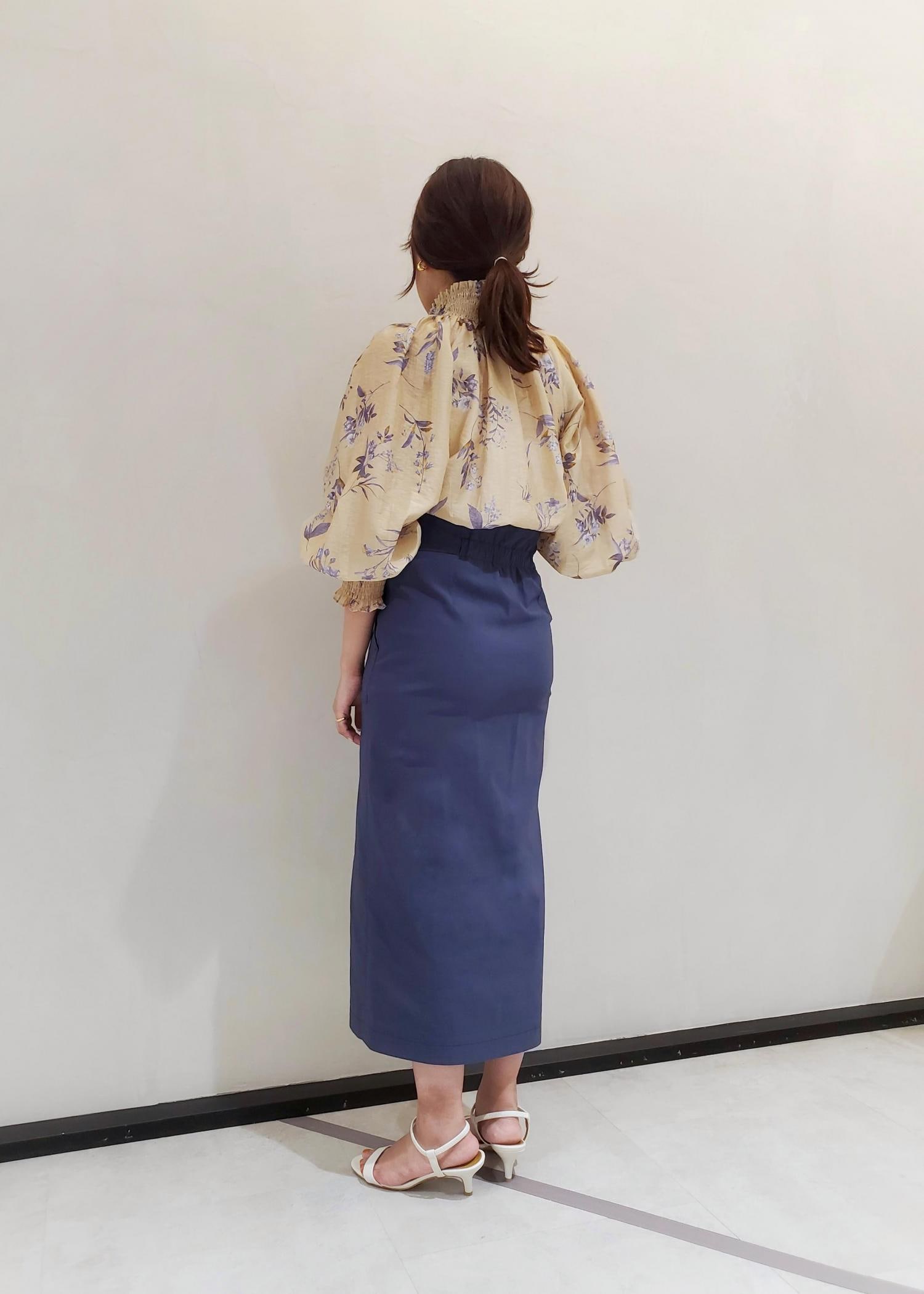 首元をあけたスキッパー風の着方とすっきりとしたシルエットのタイトスカートをあわせ、甘さの中にシャープさと抜け感が出るようにスタイリングしました。