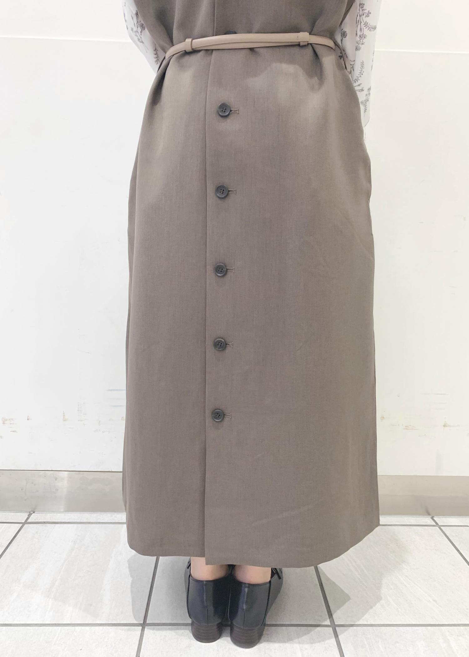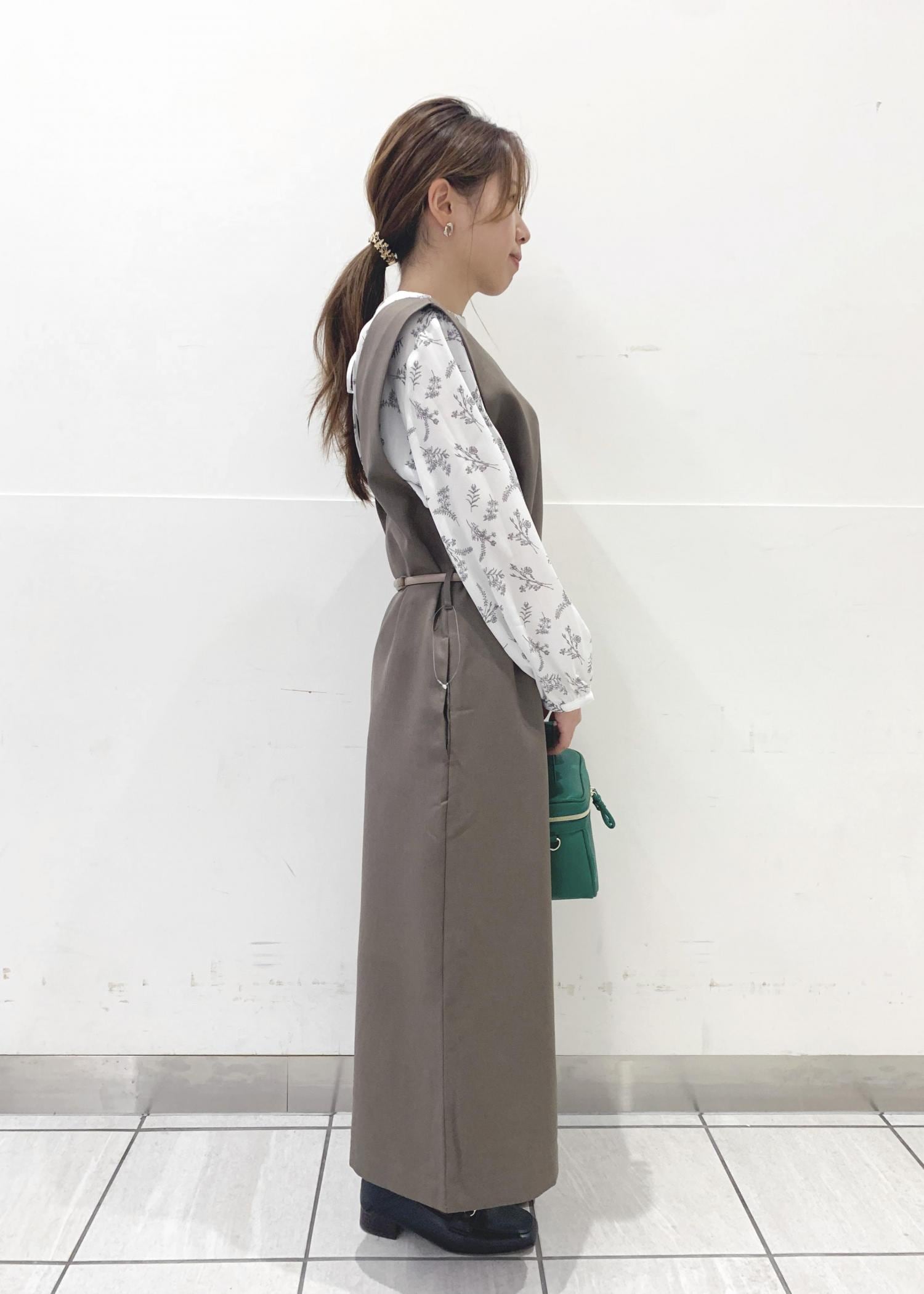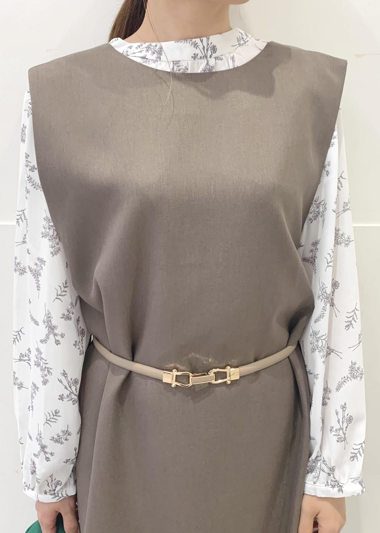 ジャンパースカートのボタンを後ろにしてベルトを付け変えることで、キチンと感が出て上品な印象に。