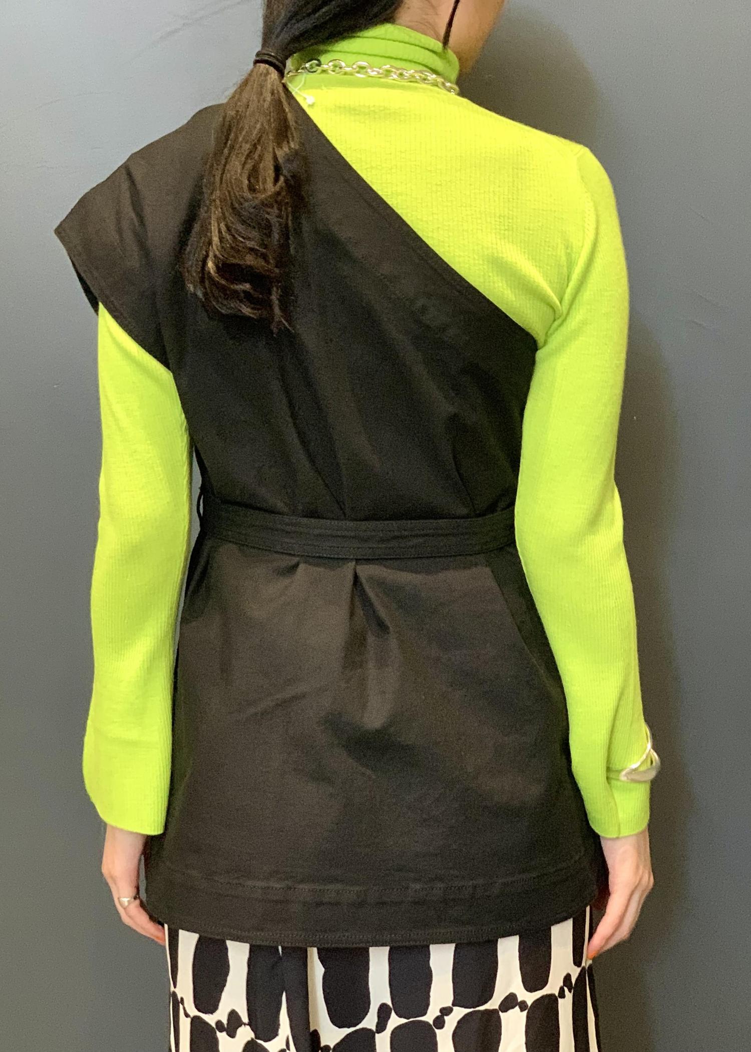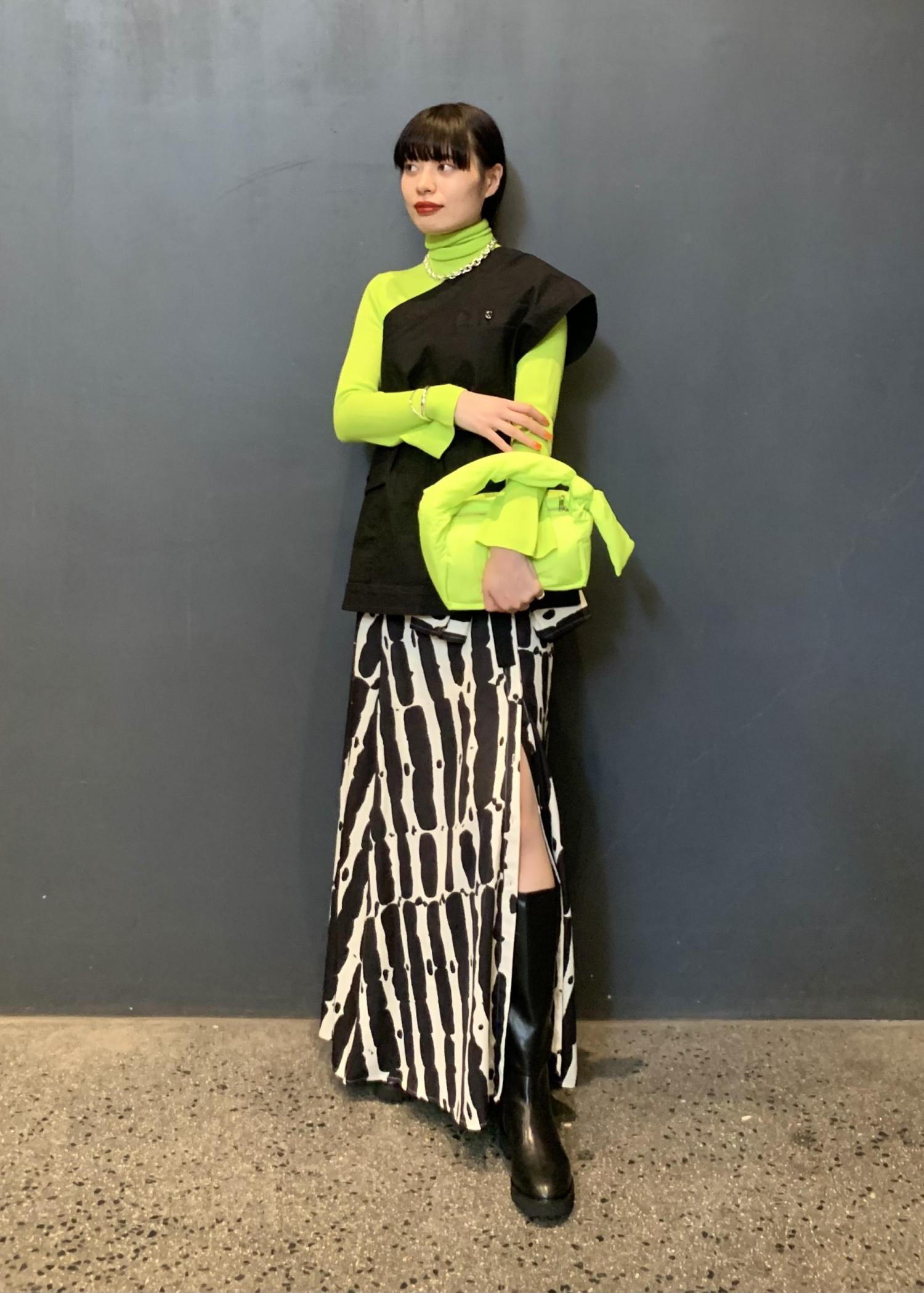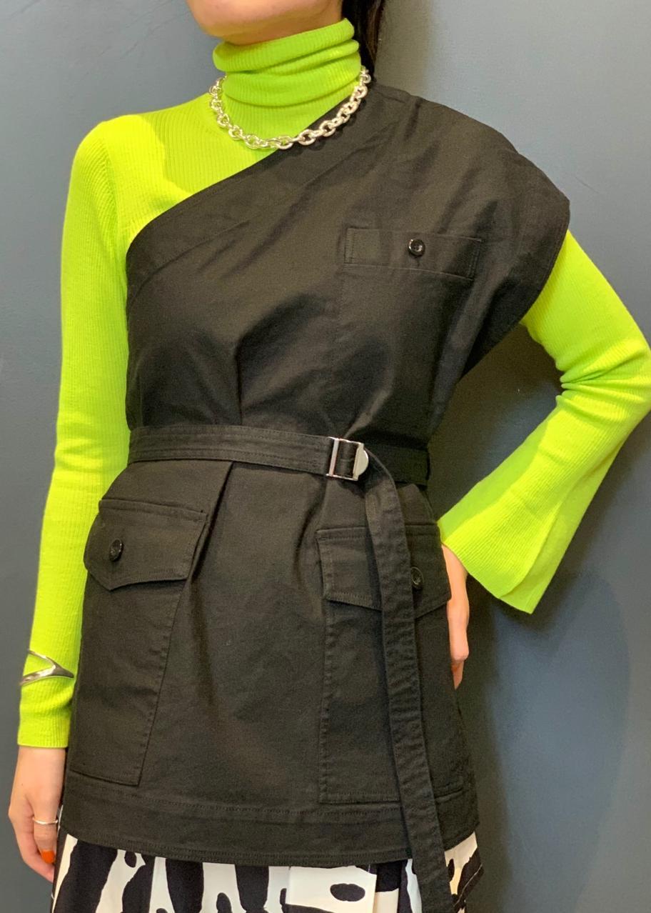 今回秋の装いでタートルニットと合わせておりますが、今から着て頂く際はノースリーブや半袖のカットソーと組み合わせてお使い頂けます。