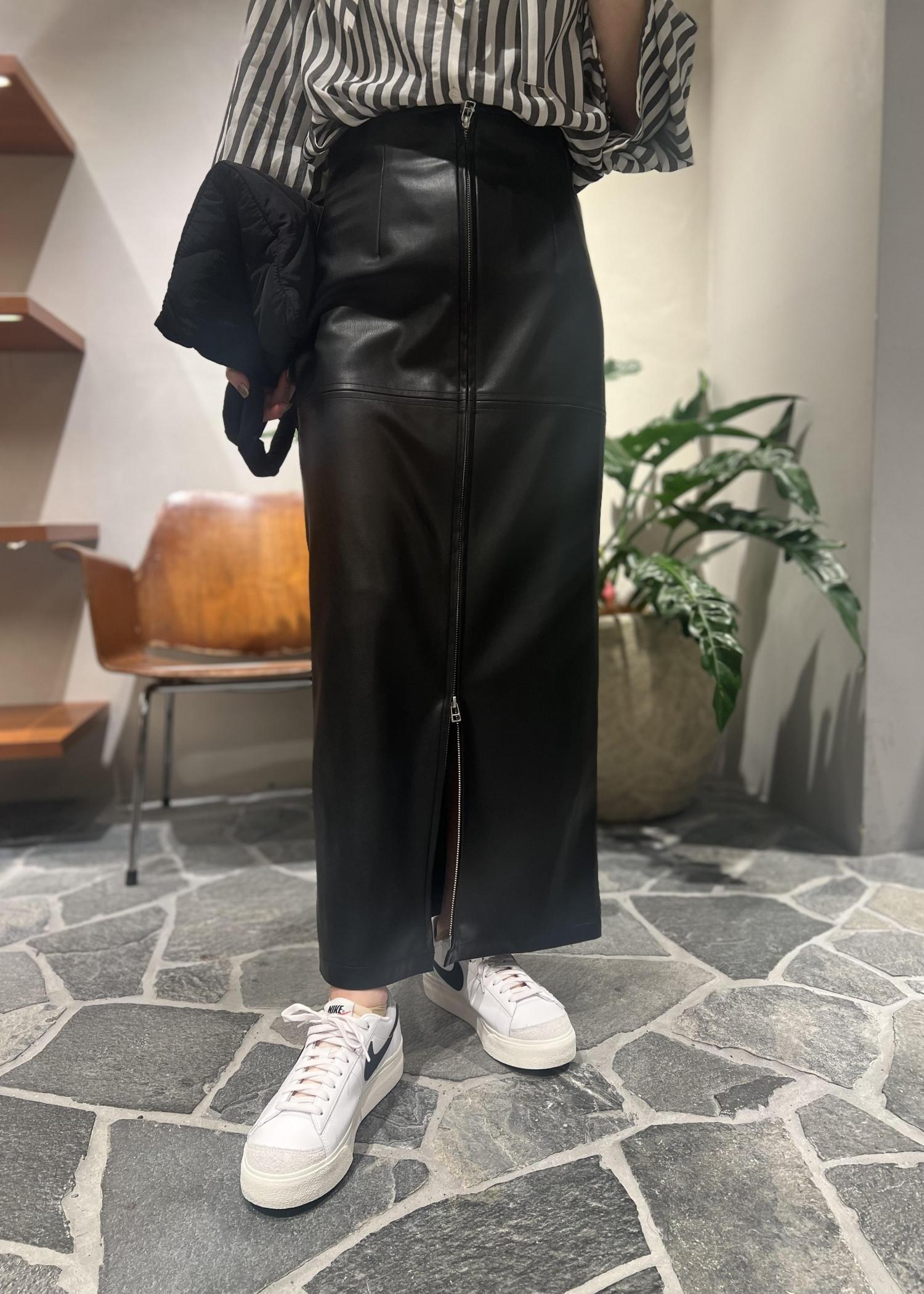 ボトムはすっきりシルエットのレザースカートを合わせてみました。