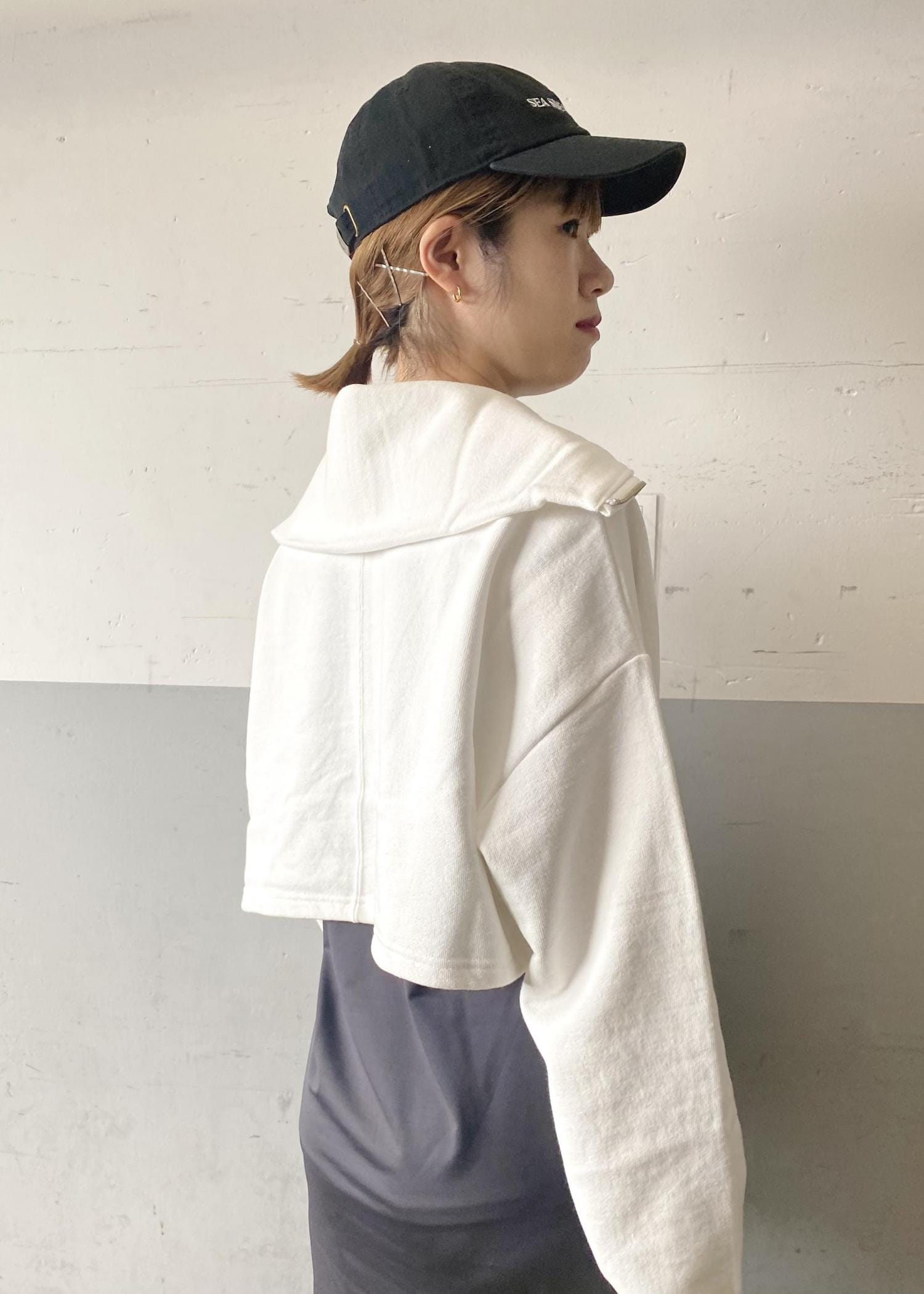 トップス:着丈は短めで、みぞおちのあたり。身幅、袖幅は広めで、インナーをレイヤードしてもごわつかず、スッキリと着れます。