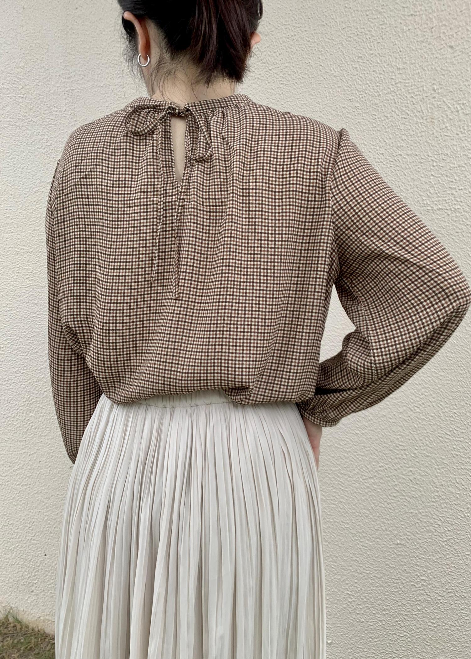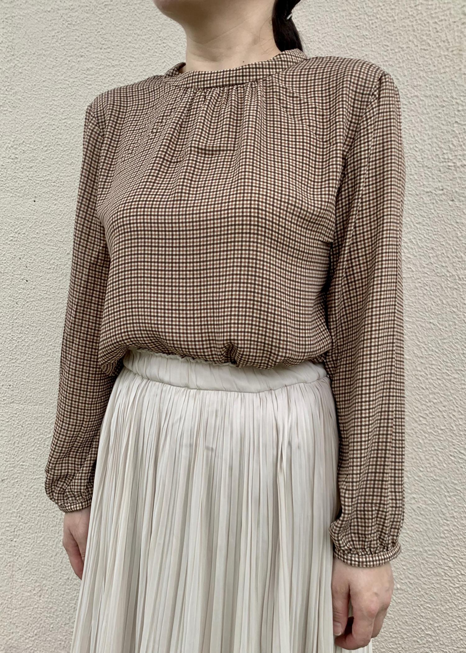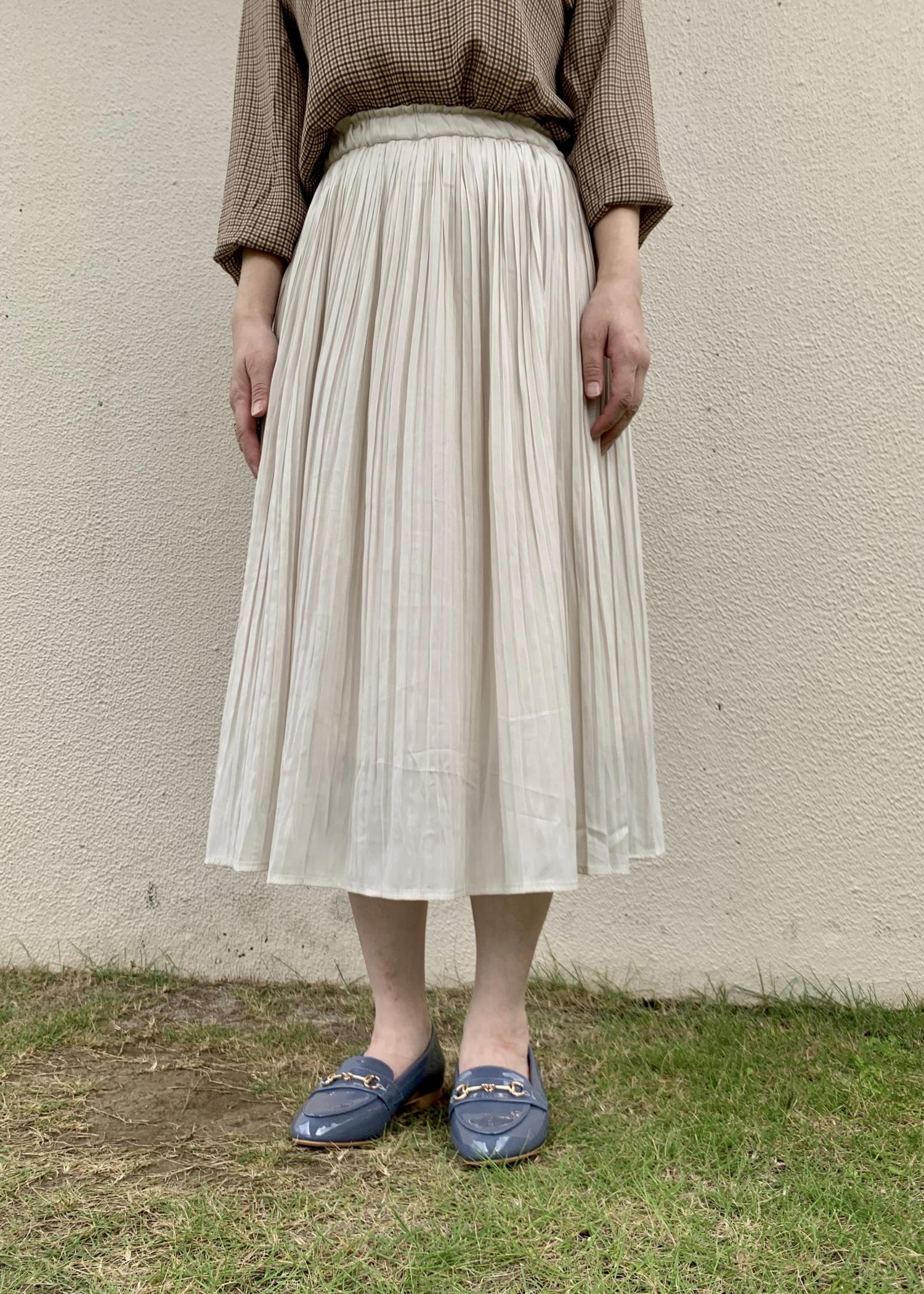 シンプルなデザインのチェック柄ブラウスに楊柳プリーツスカートを合わせたコーディネートにしました。