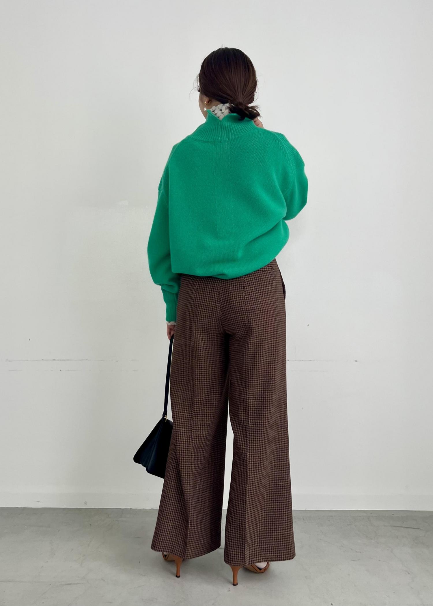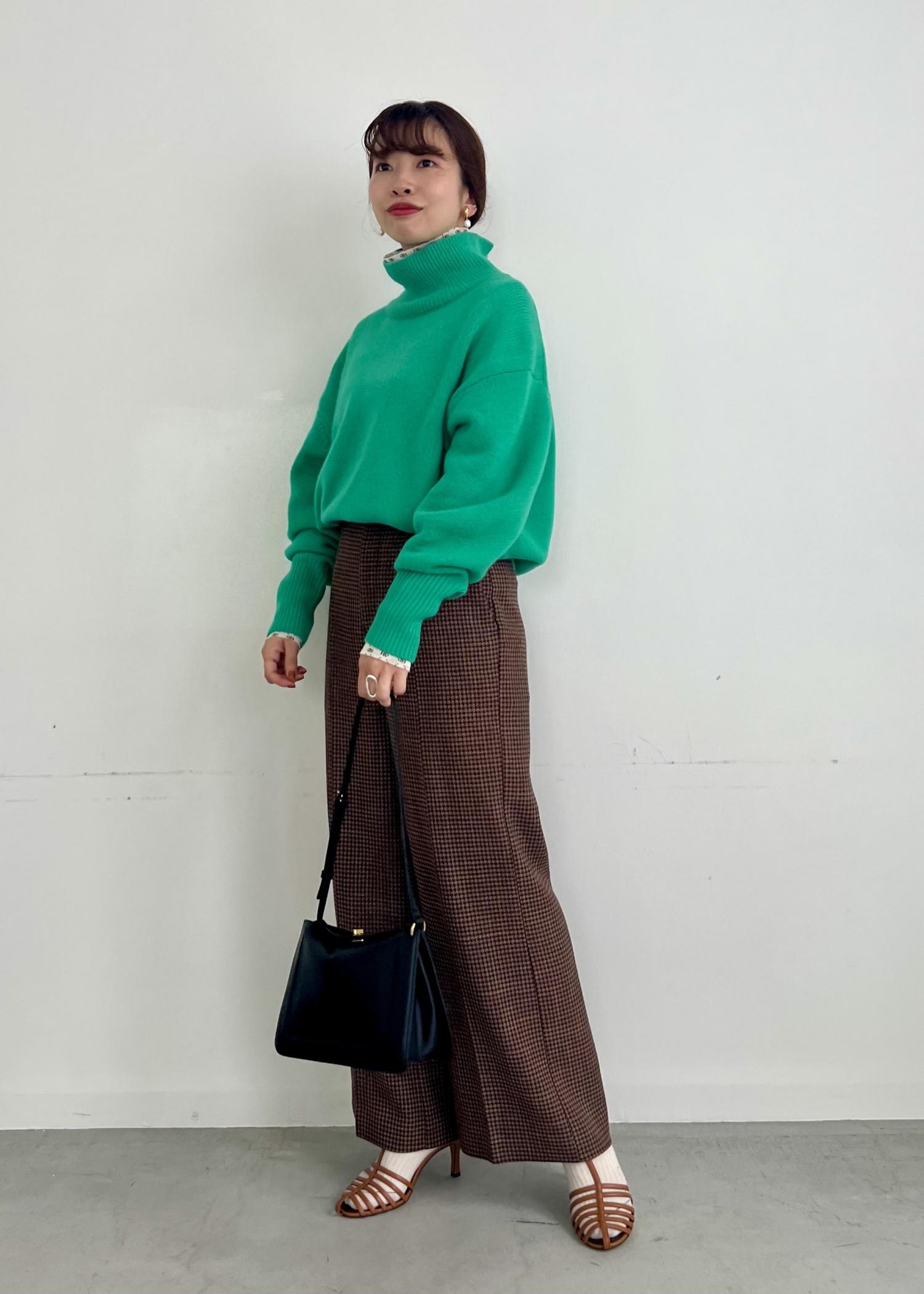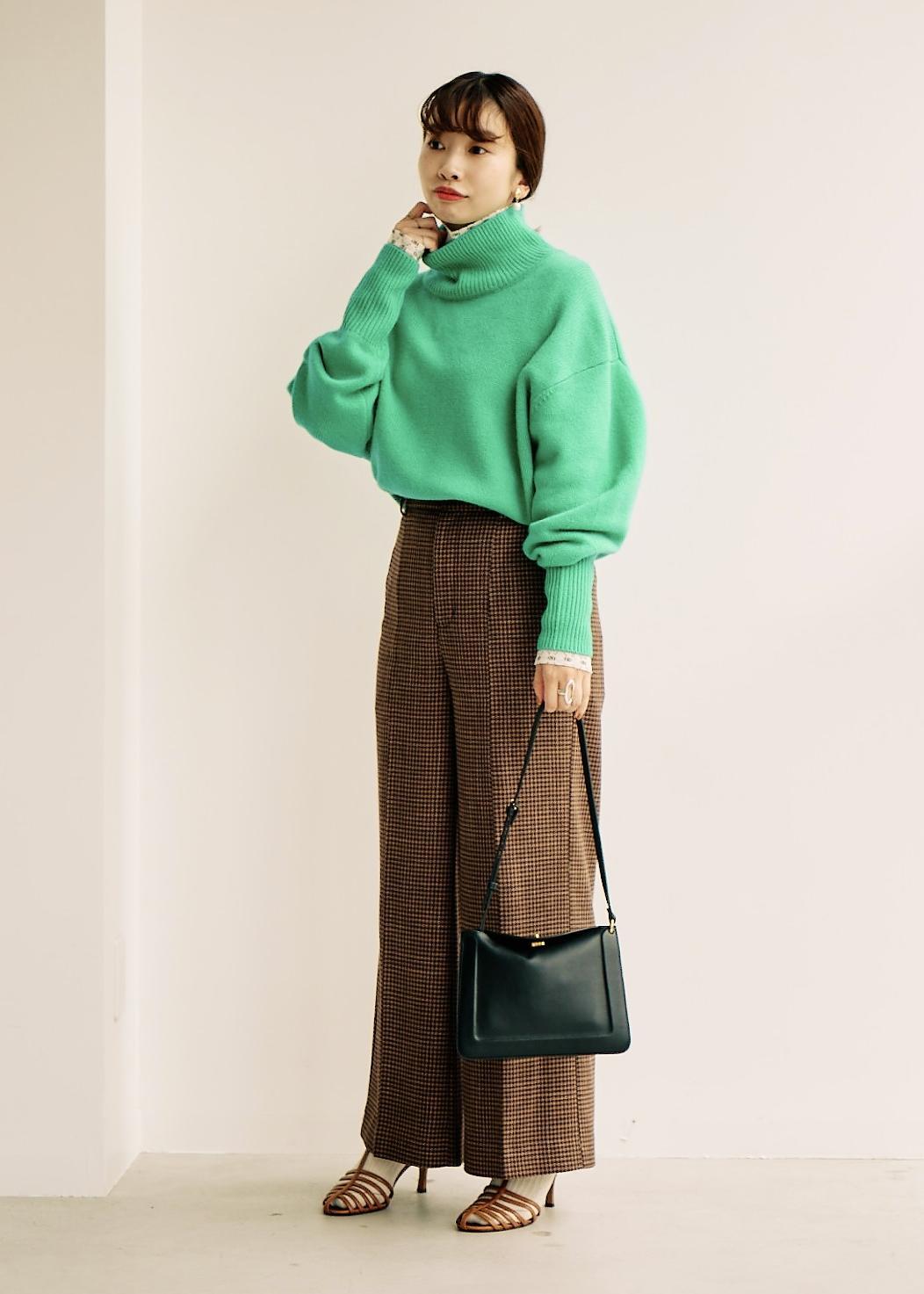 鮮やかなグリーンのニットを大人フェミニンな雰囲気で着たかったので、ブラウンのパンツで柔らかい色合わせに。