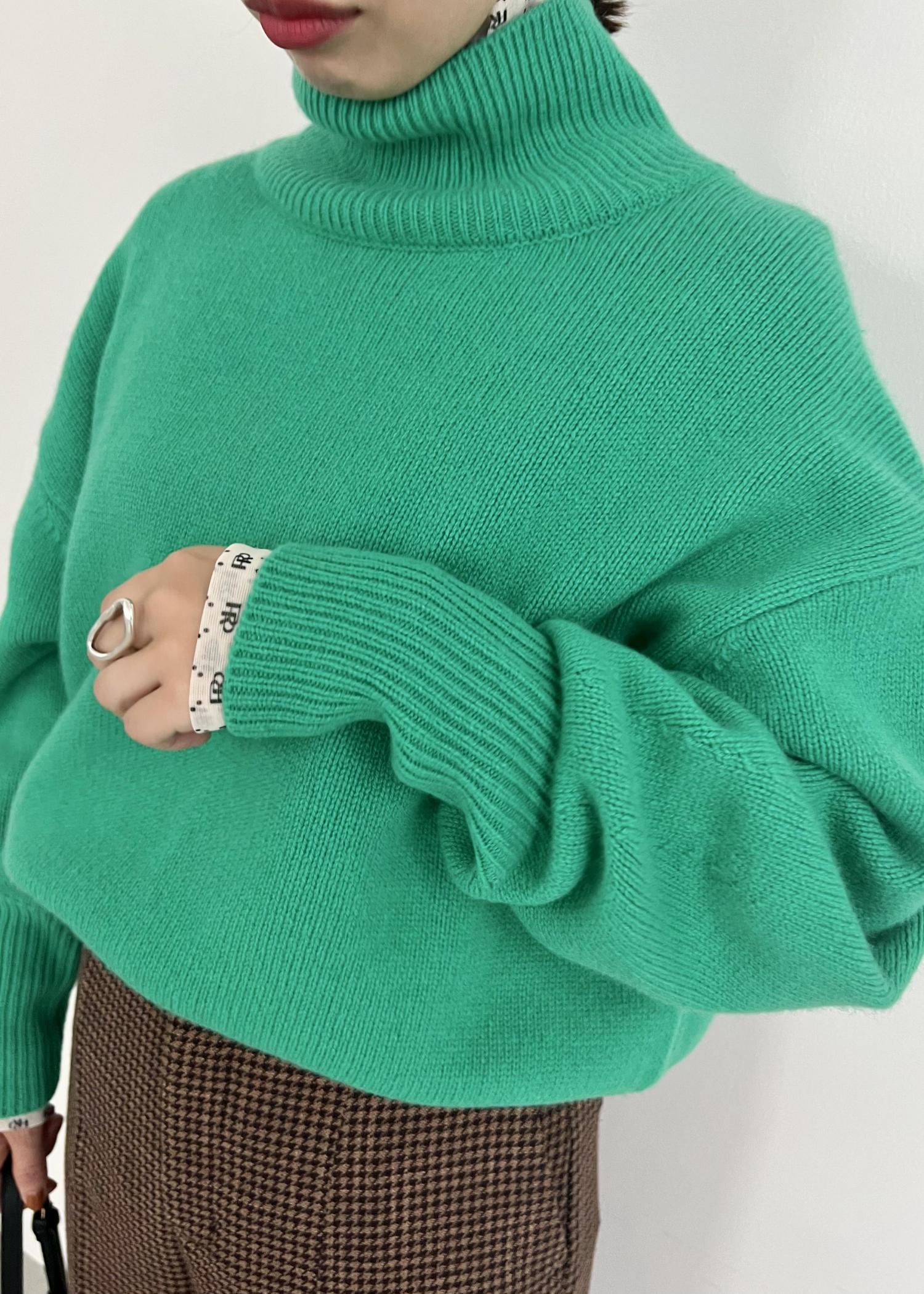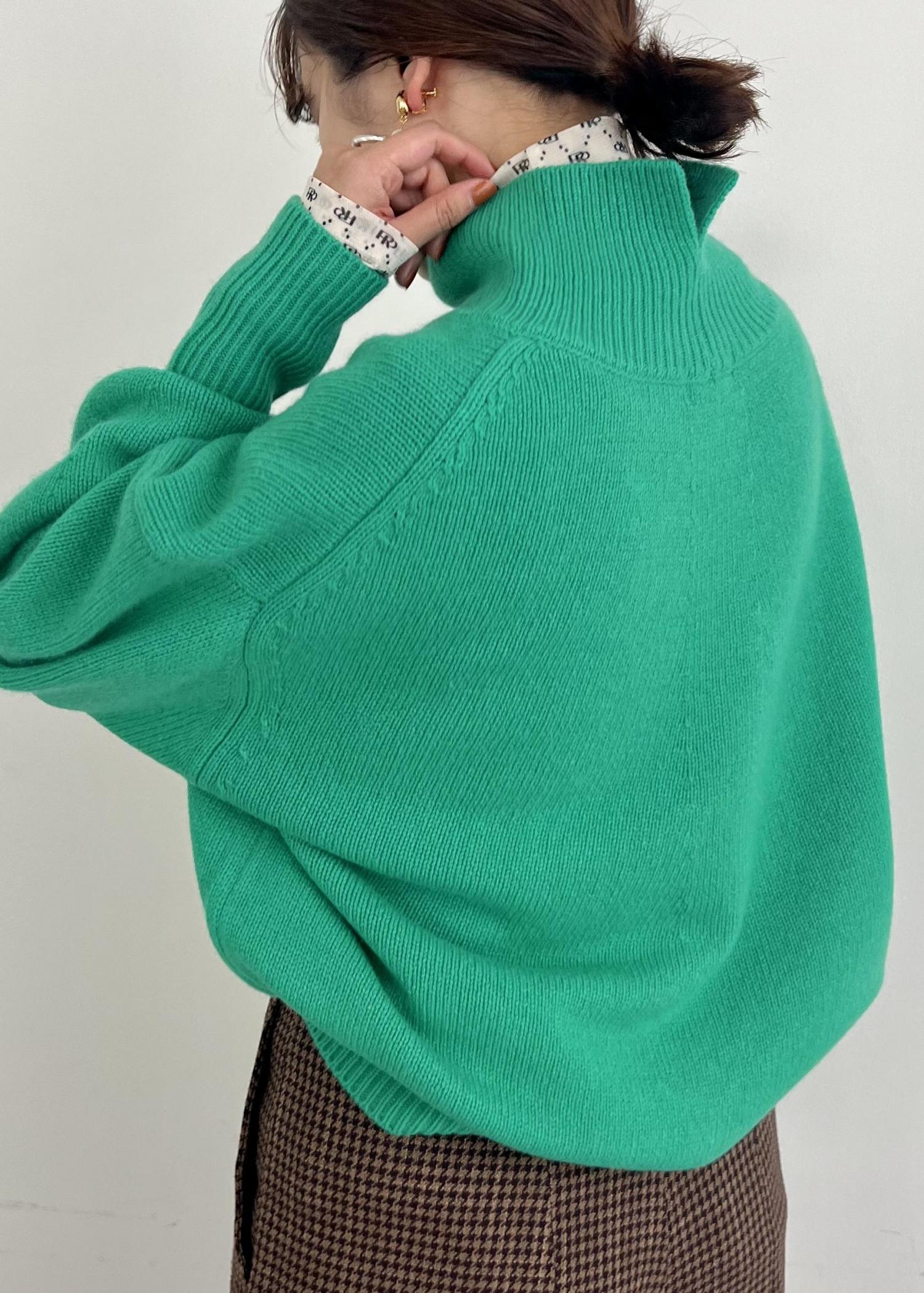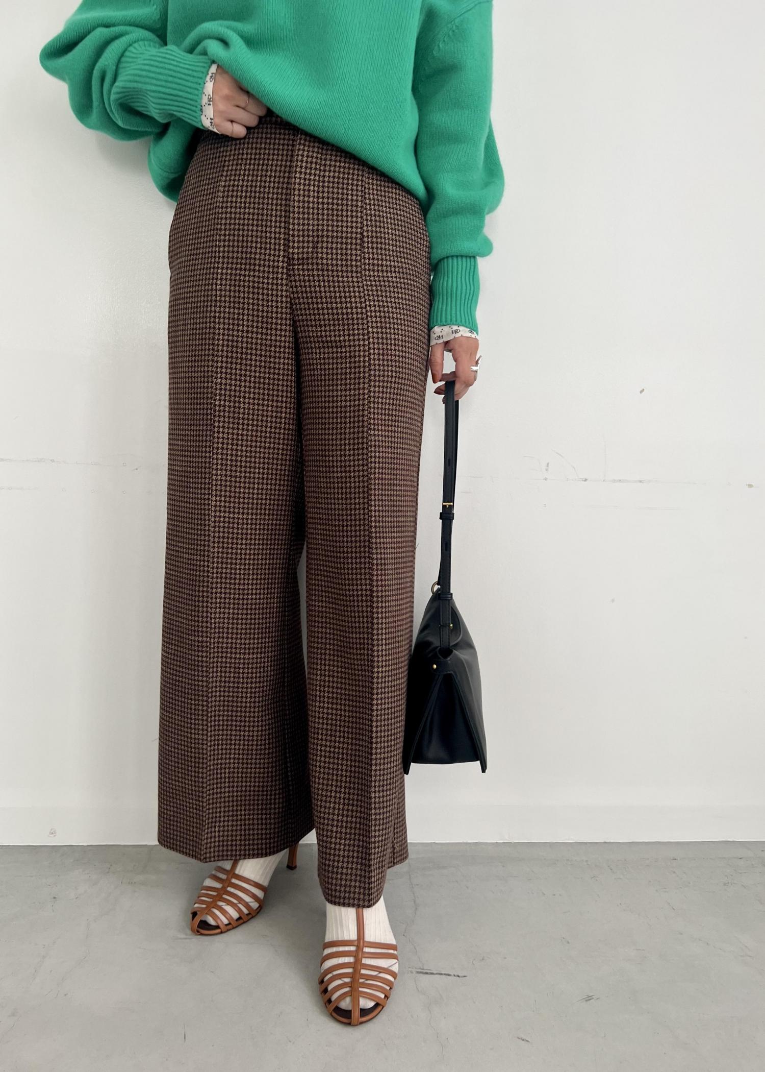 鮮やかなグリーンのニットを大人フェミニンな雰囲気で着たかったので、ブラウンのパンツで柔らかい色合わせに。