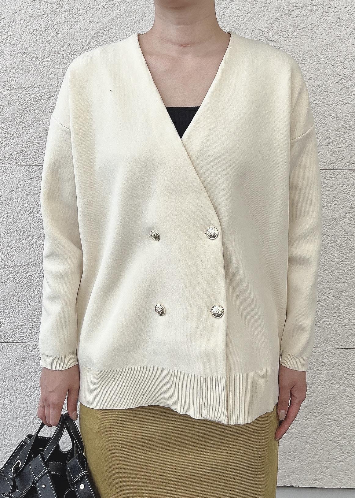 金ボタンがポイントなジャケット風ニットカーディガンを主役にしたコーディネートです♪