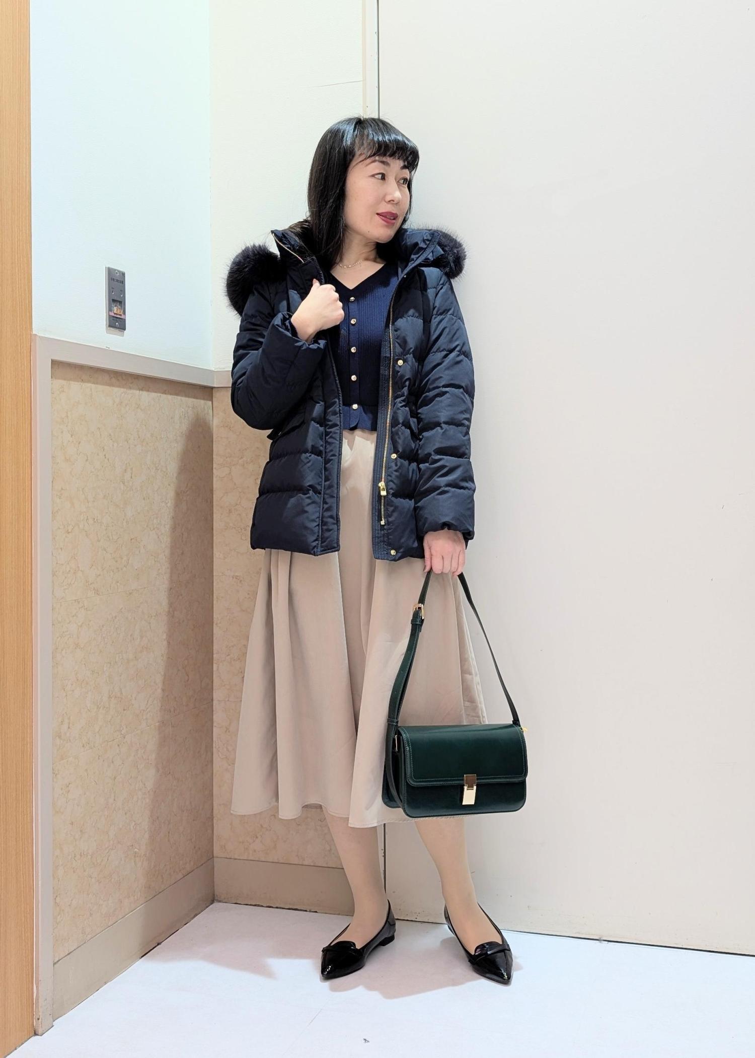 トレンドのボウタイワンピースが映えるようにアウターはノーカラーを選びました。