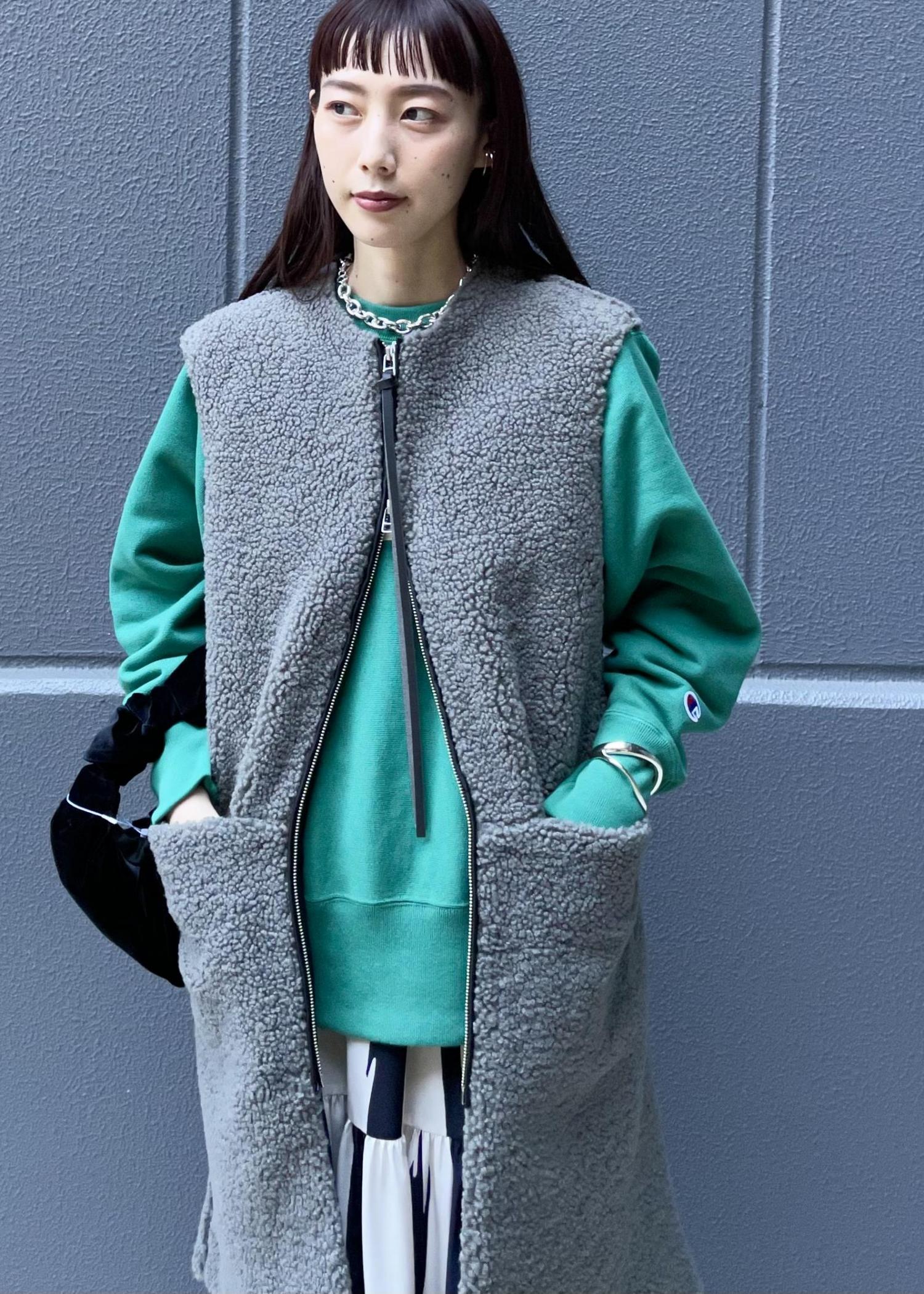 ボアベストのフロントはダブルジップになっているので前を開けても、下だけ開けて着るのも雰囲気が変わり様々な着方を楽しめます。