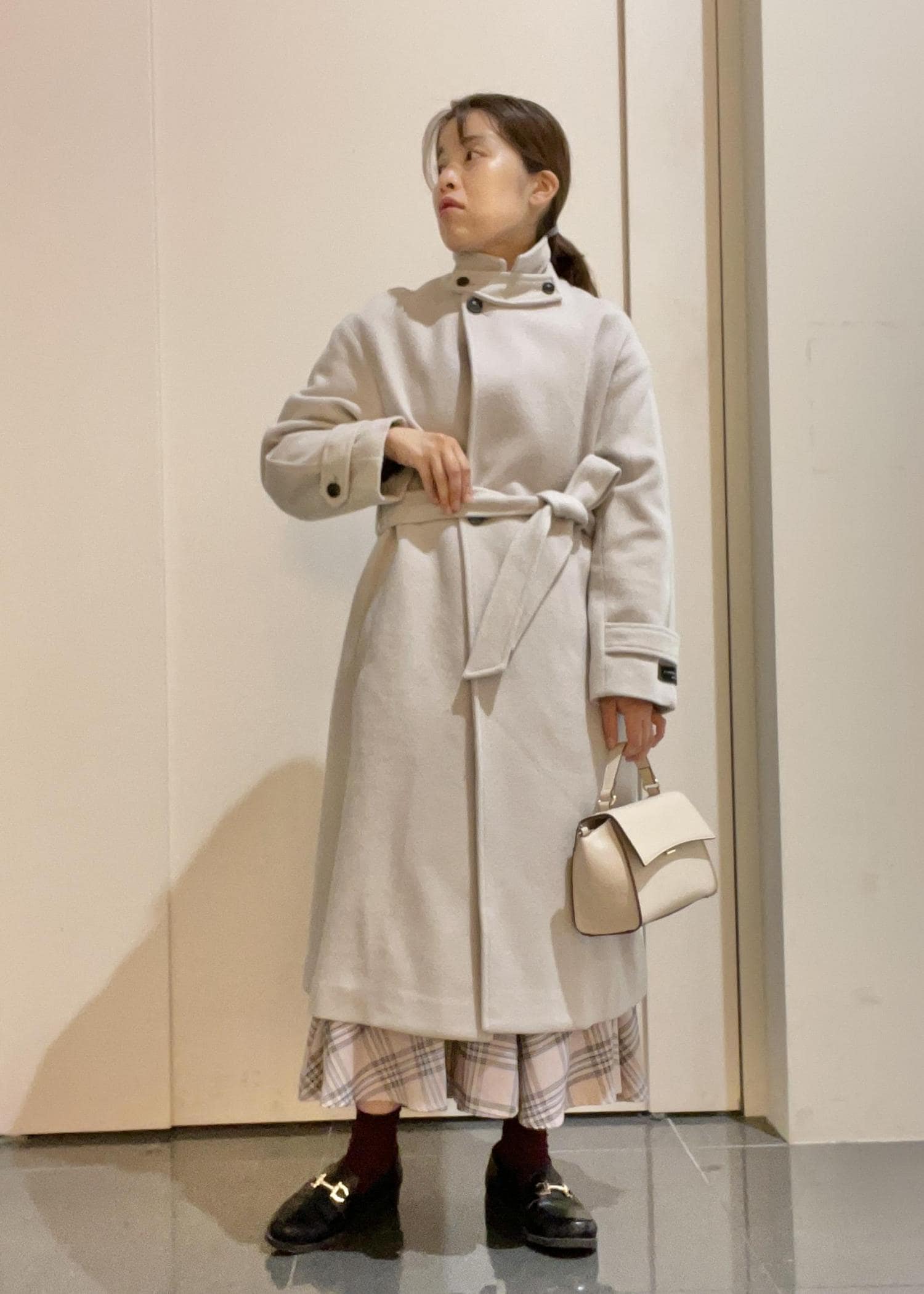 淡いカラーのスタイルだったので、コートインのトップスはチャコールグレーのニットを合わせて、メリハリを付けました。