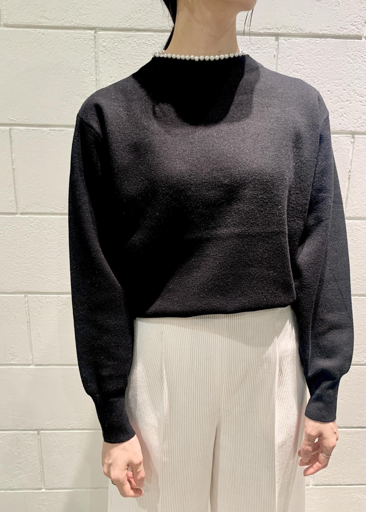 襟元のパールが目を惹く、アクセサリー要らずで簡単にスタイリングがきまる着回し力抜群のニットです。