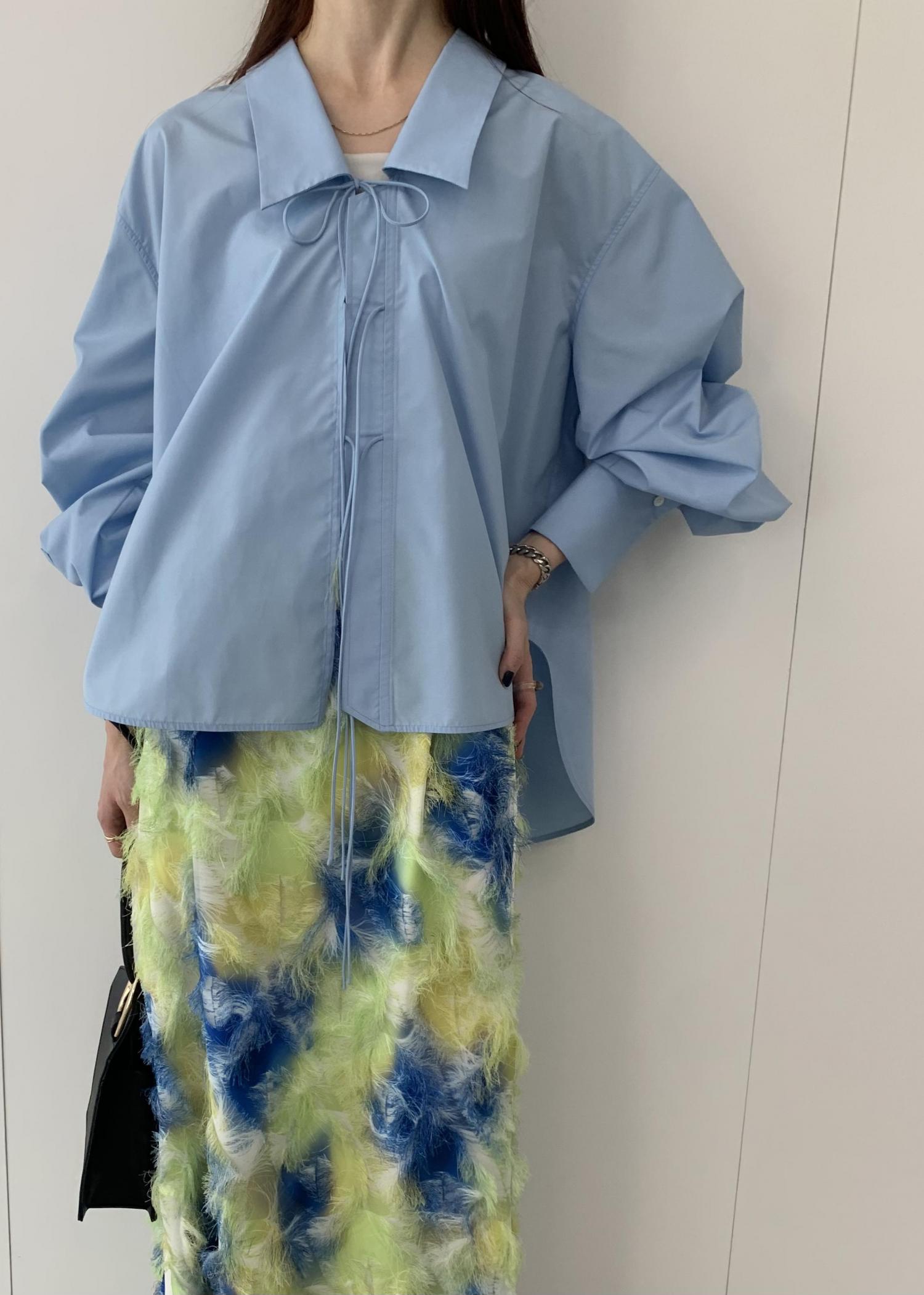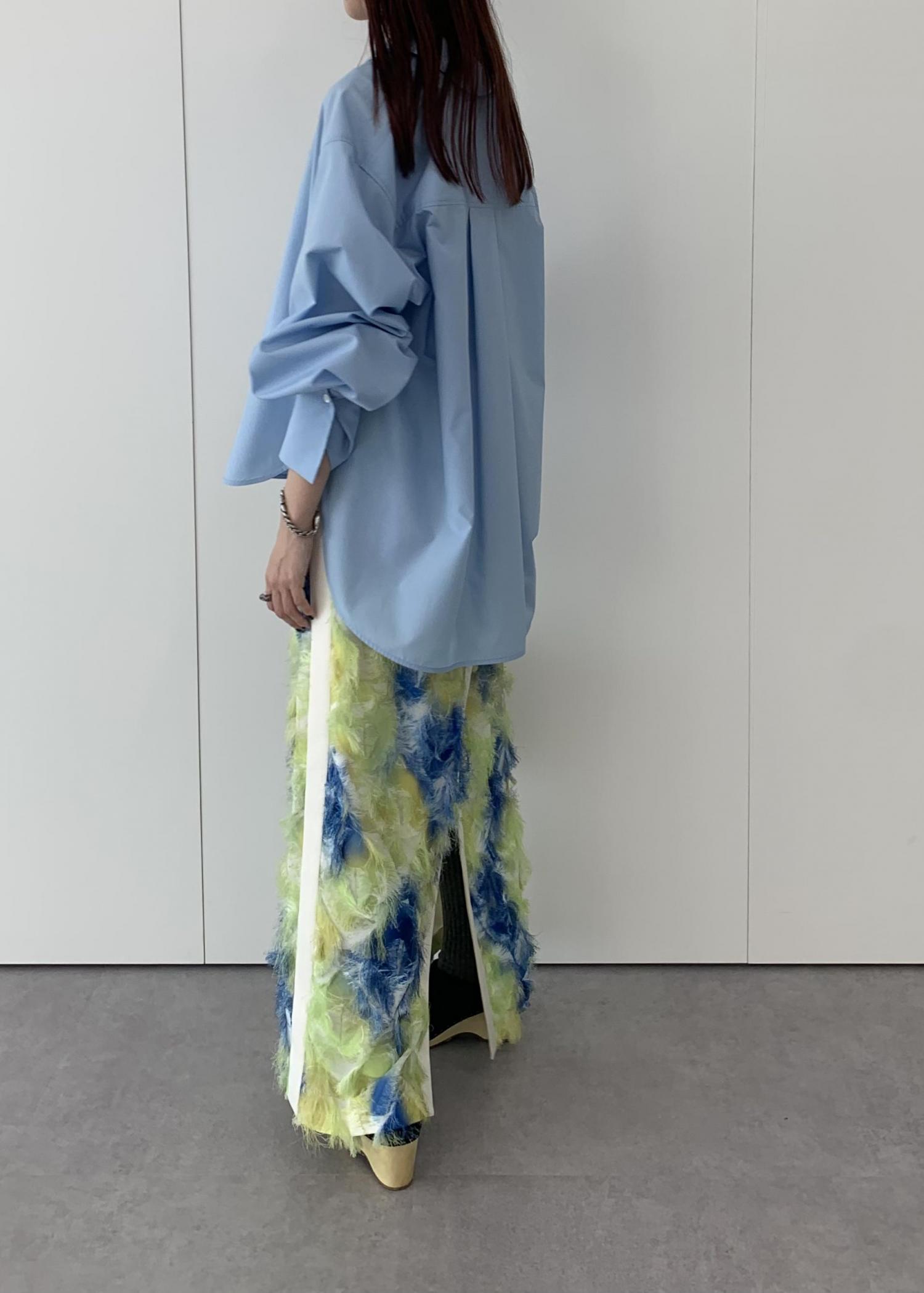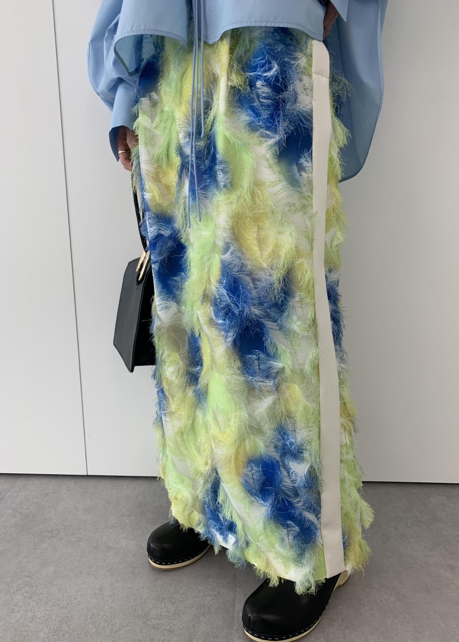 鮮やかなカラーが目を引くスカートは、表面がフリンジで立体感のある珍しいデザイン。