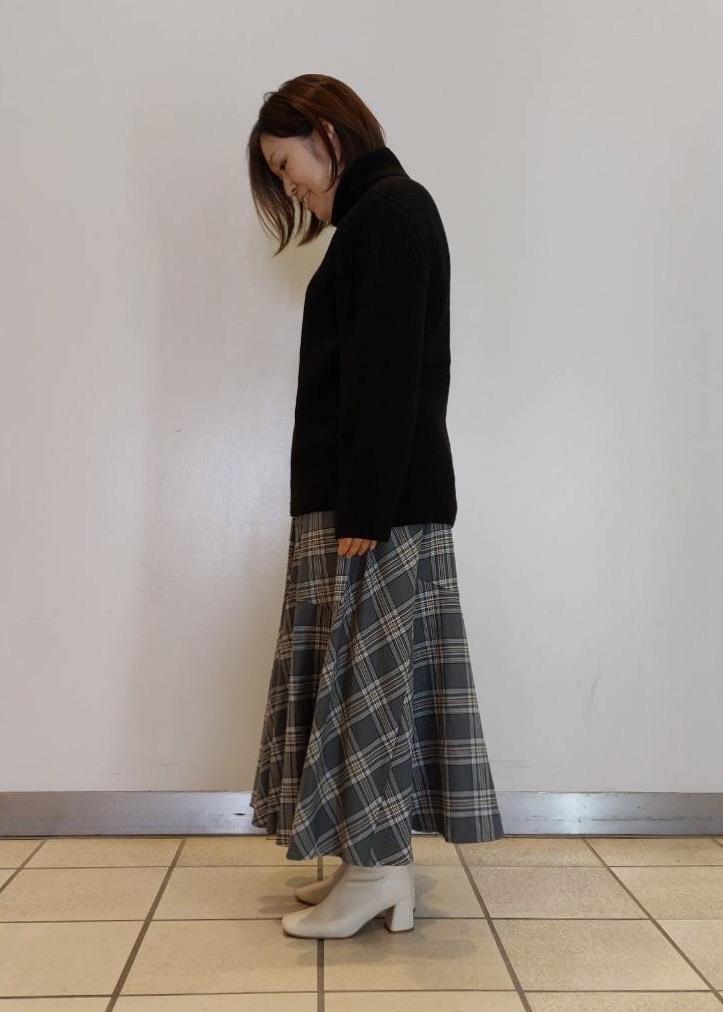 ニットをシンプルにブラックにしたので スカートはチェック柄を選び、シンプル過ぎない大人コーデにしました。
