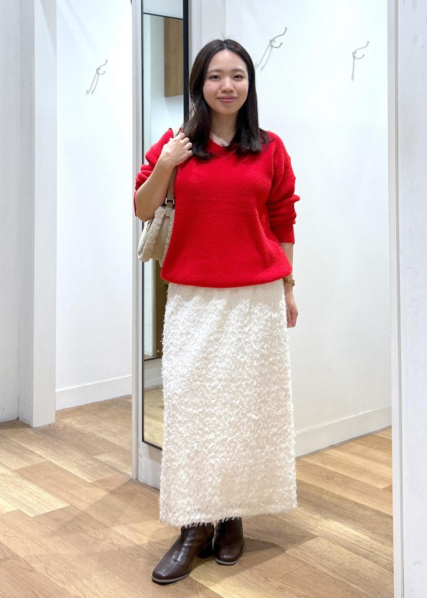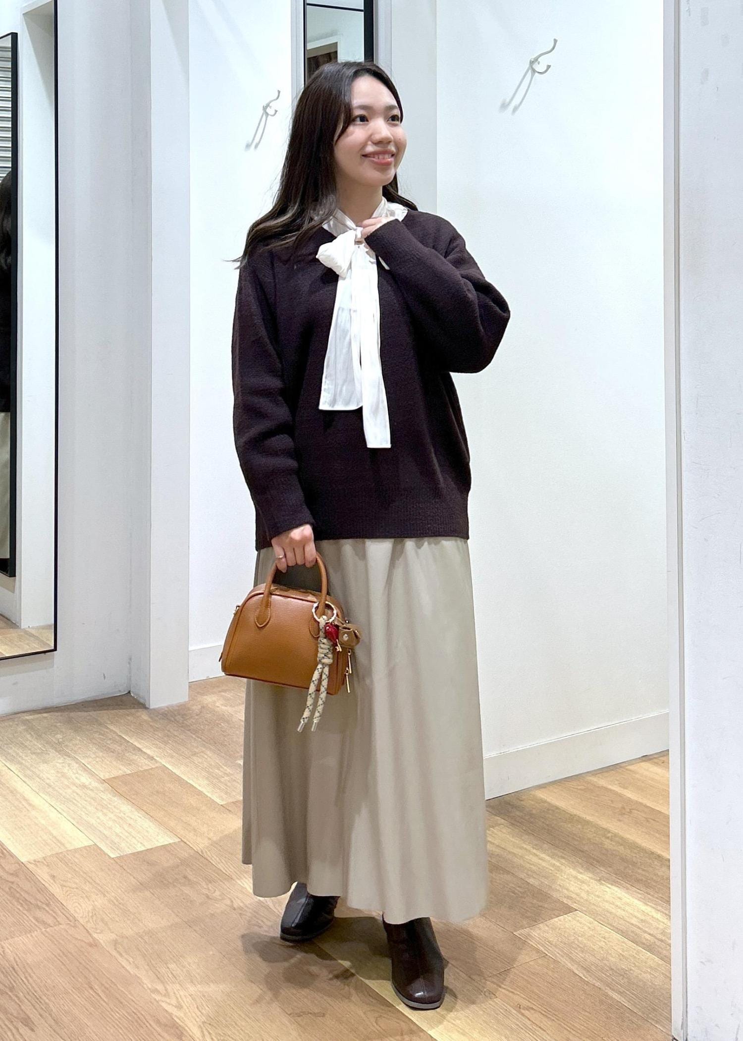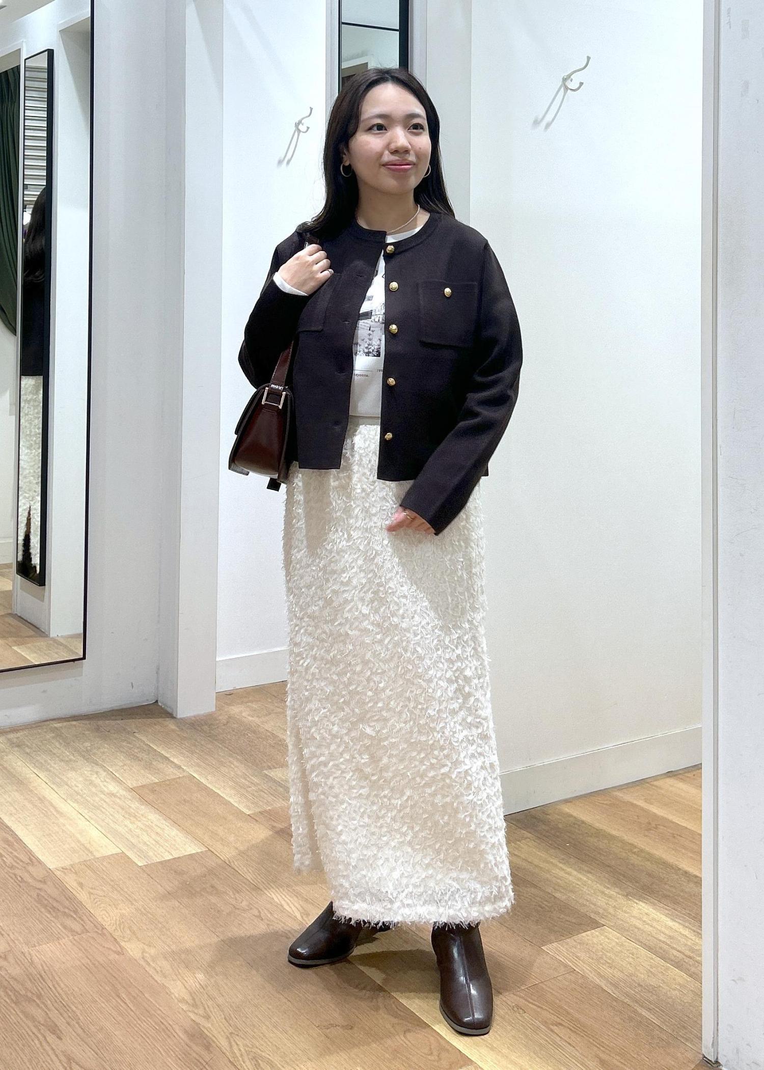 お勧めコーデ:ニット等トップスを重ねて着用頂いてプラスαのコーデになり一枚あると嬉しいアイテムです。