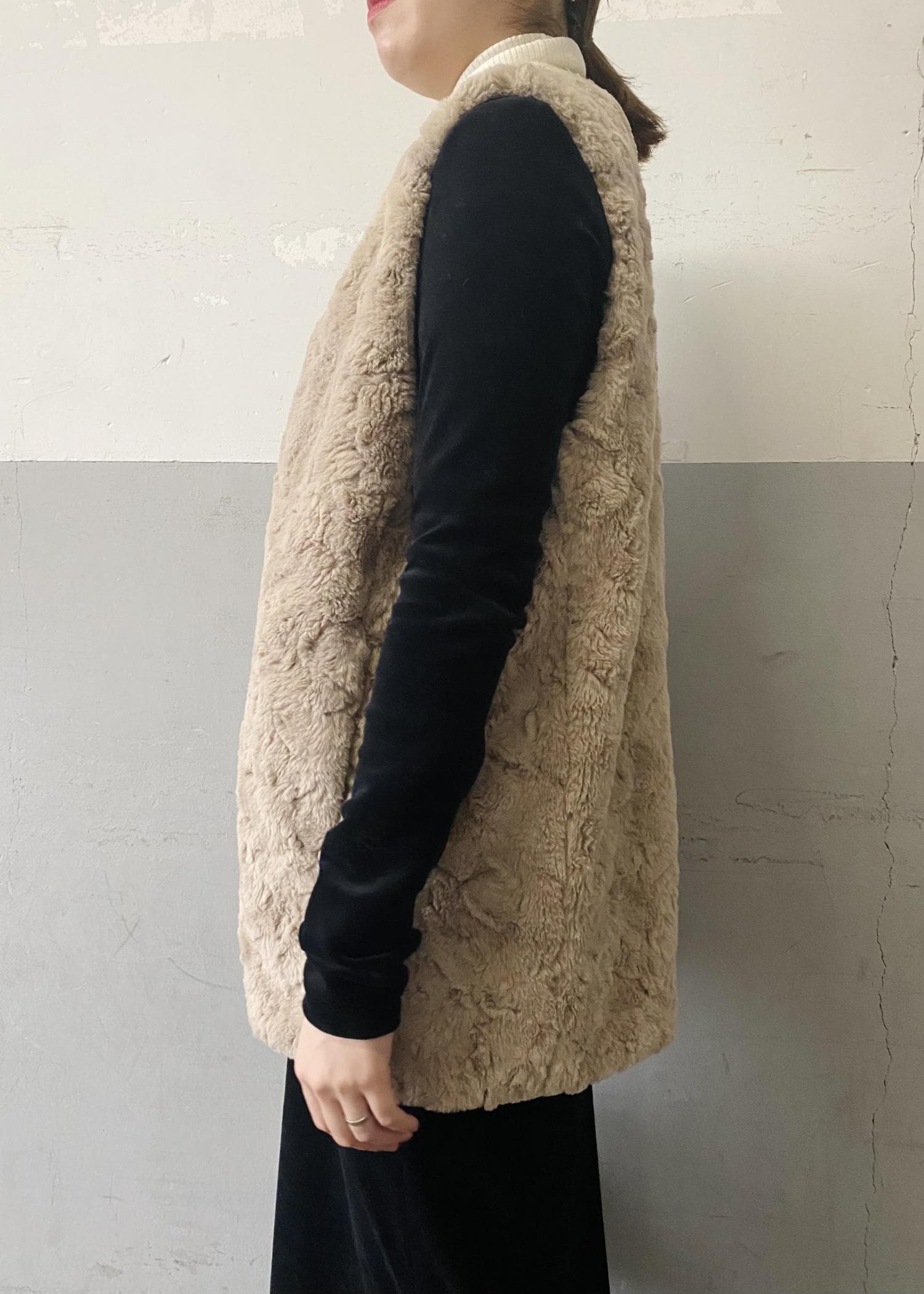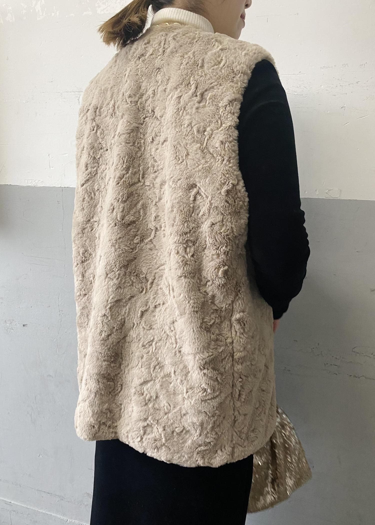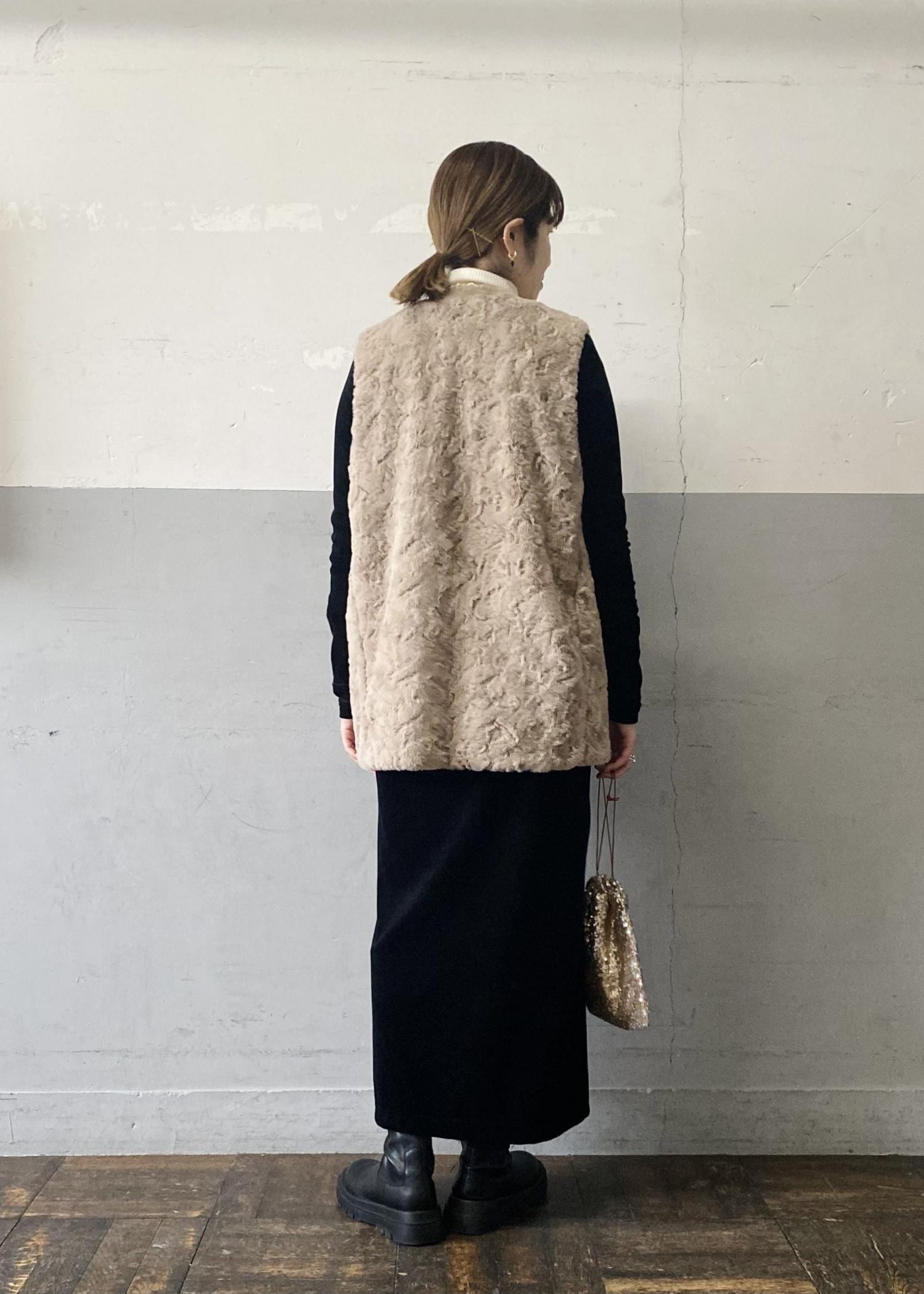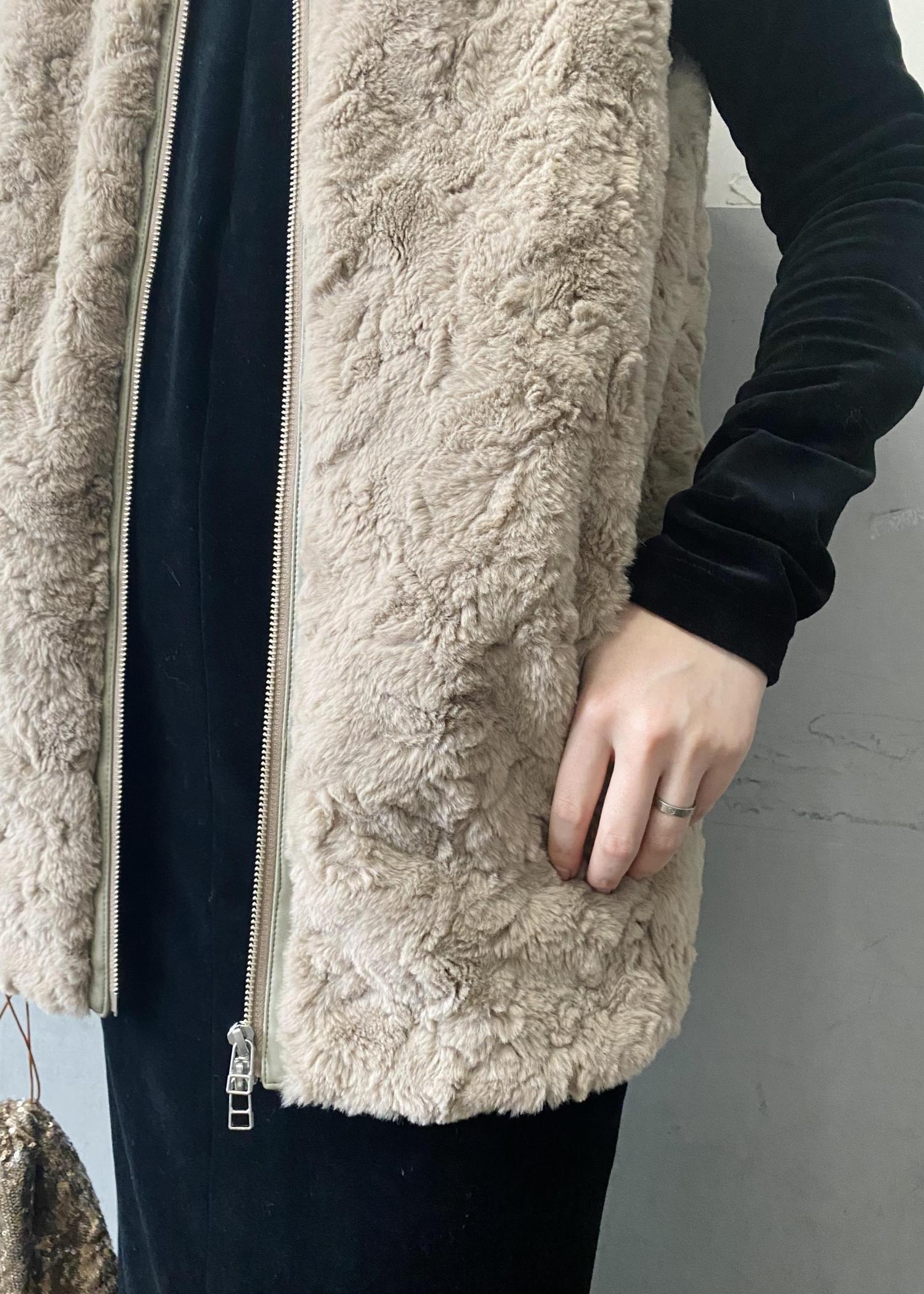 程よいボリューム感で、着膨れせずに普段使いしやすい、フェイクファー素材です。厚みがあるのですが、非常に軽いので、肩も凝らず、着心地抜群です♪