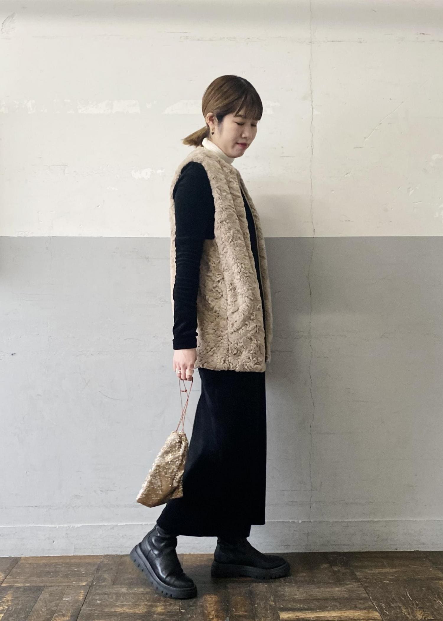 落ち着いたトーンのベージュなので、ブラックと合わせてメリハリのあるカラー合わせにしました。