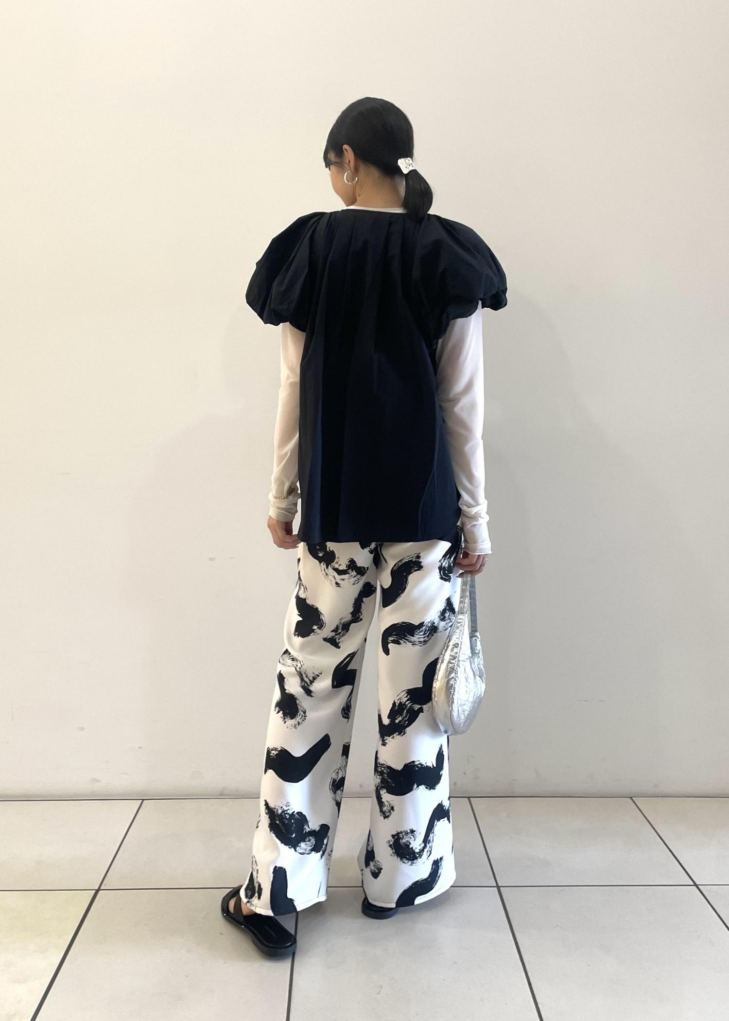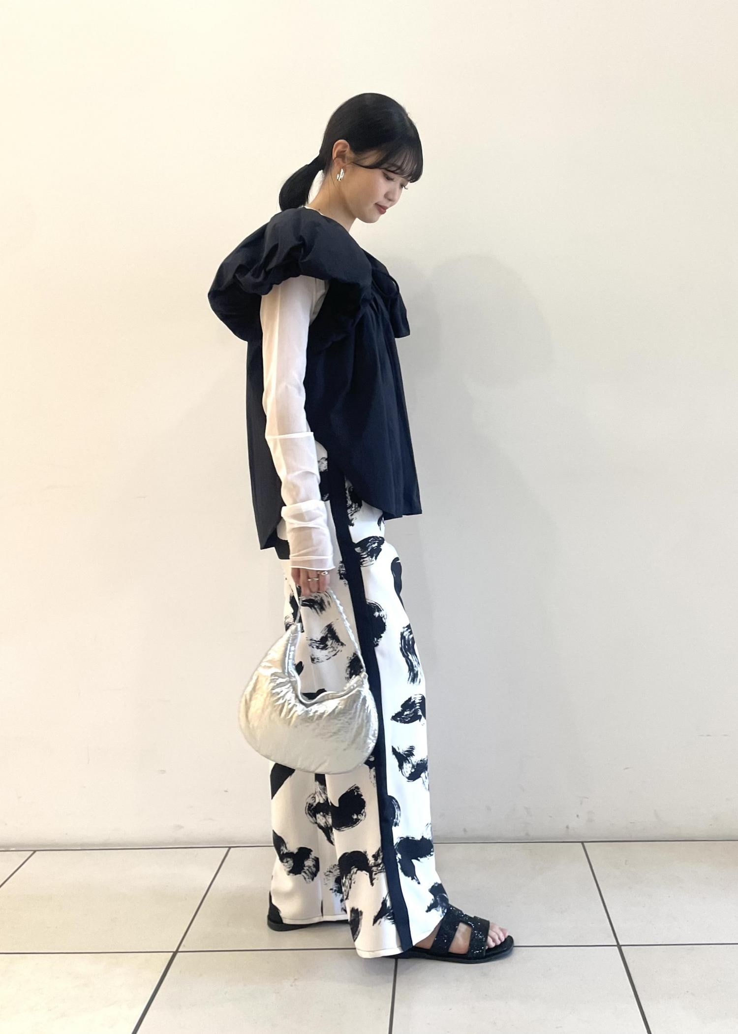 今回は、モードフェミニンなブラックを使って、甘さ×大人っぽいコーディネートを組んでみました。バルーンスリーブにインパクトがあるので、ボトムスは大きめの柄などのデザインを選ぶとバランス◎です!