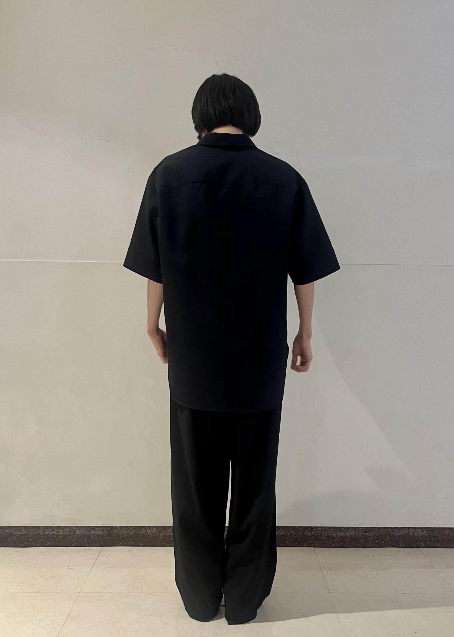 今回は黒のワイドスラックスと合わせて落ち着いた雰囲気でまとめてみましたが、このシャツにモードな雰囲気があるので敢えてカジュアルなパンツと合わせるスタイリングなどもおすすめです!