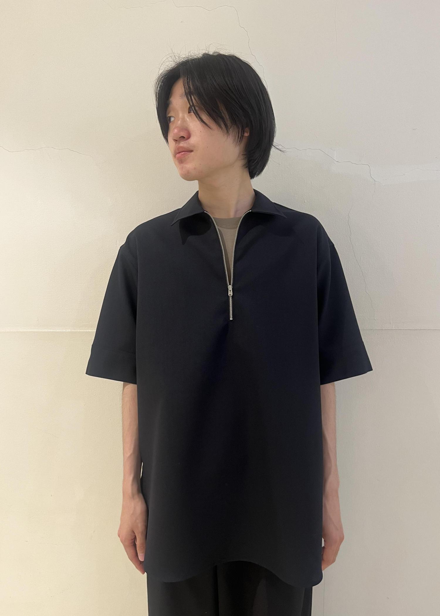 着用しているNIKKEのシャツはハーフジップのプルオーバー型なのが特徴的で、ジップの開閉によってインナー見せなども楽しめるので、シンプルでありながらスタイリングに幅を持たせてくれる万能なアイテムになっています!