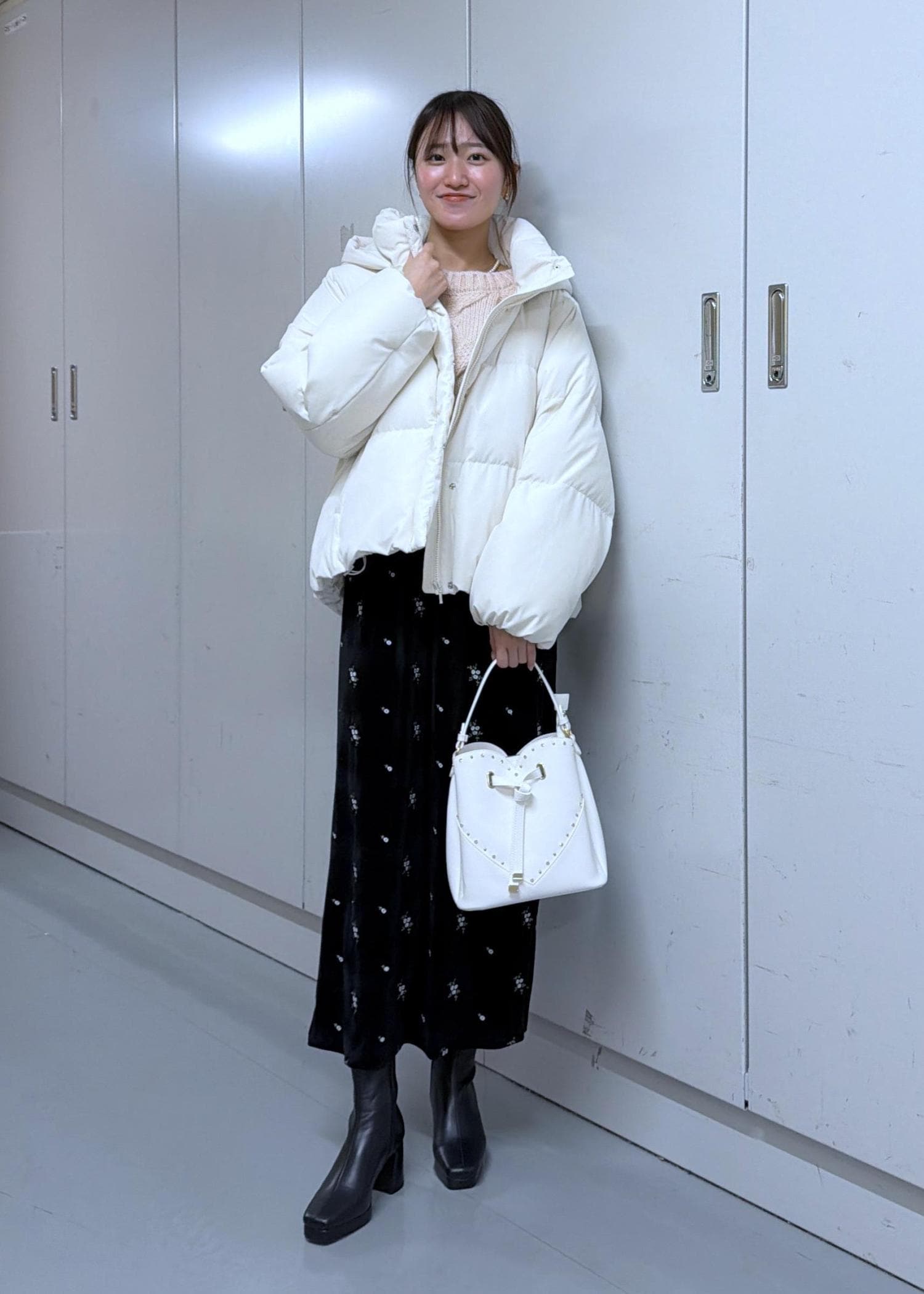 骨格ウェーブなので目線が上がるようにカーディガンを羽織ったり、大きめ粒のパールネックレスを合わせました。
