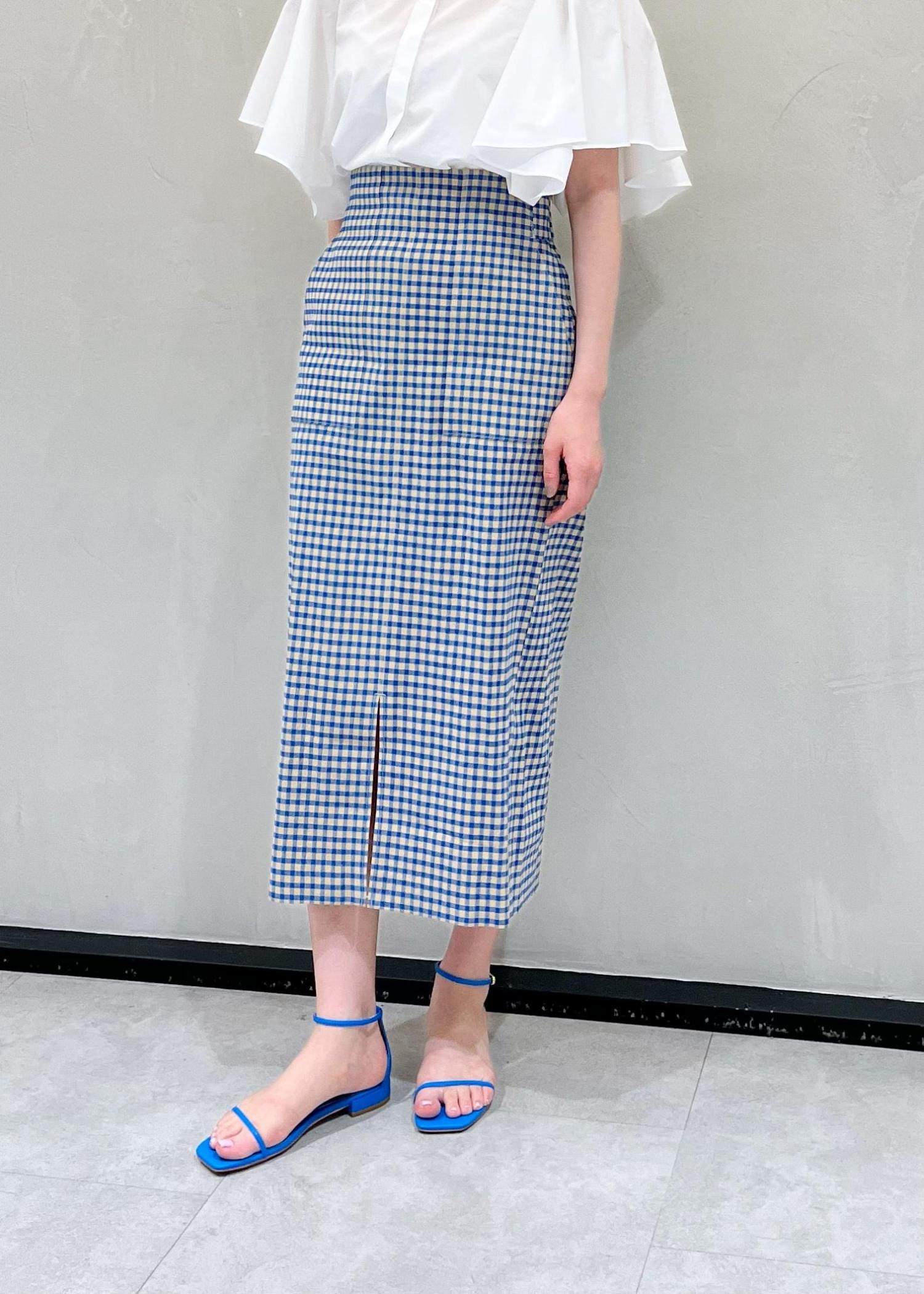 ブラウスにチェック柄のタイトスカートを合わせて、