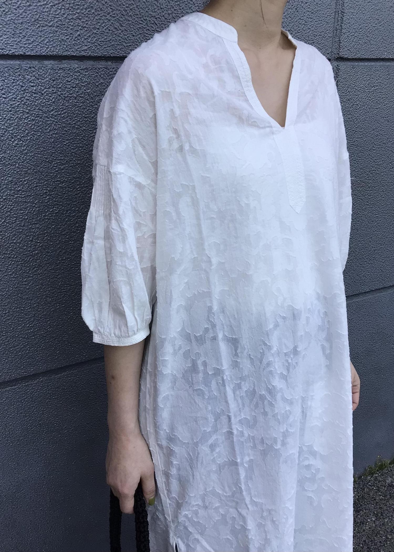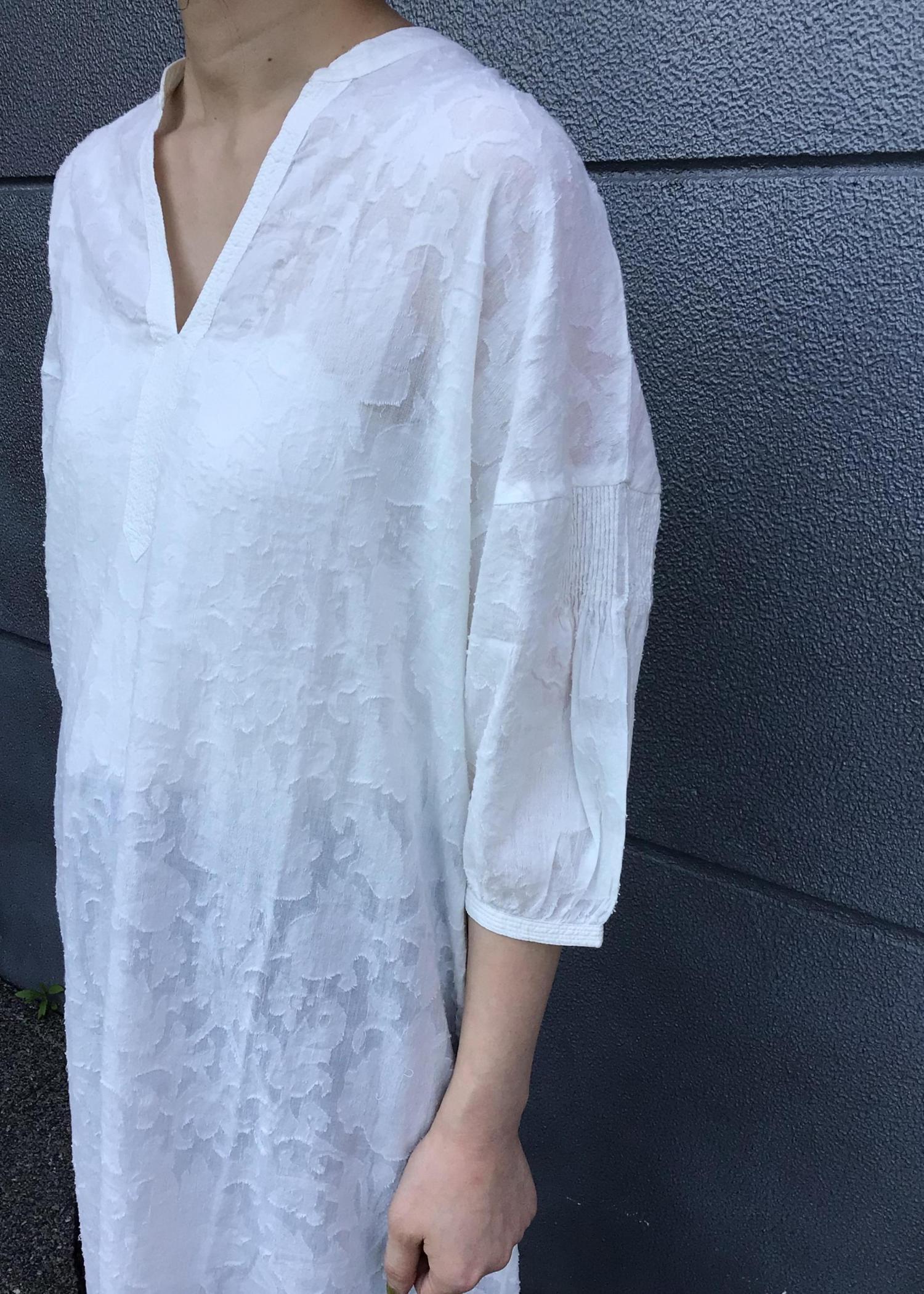 フラワー柄のジャガード素材が目を引く涼しげなワンピースのご紹介です。