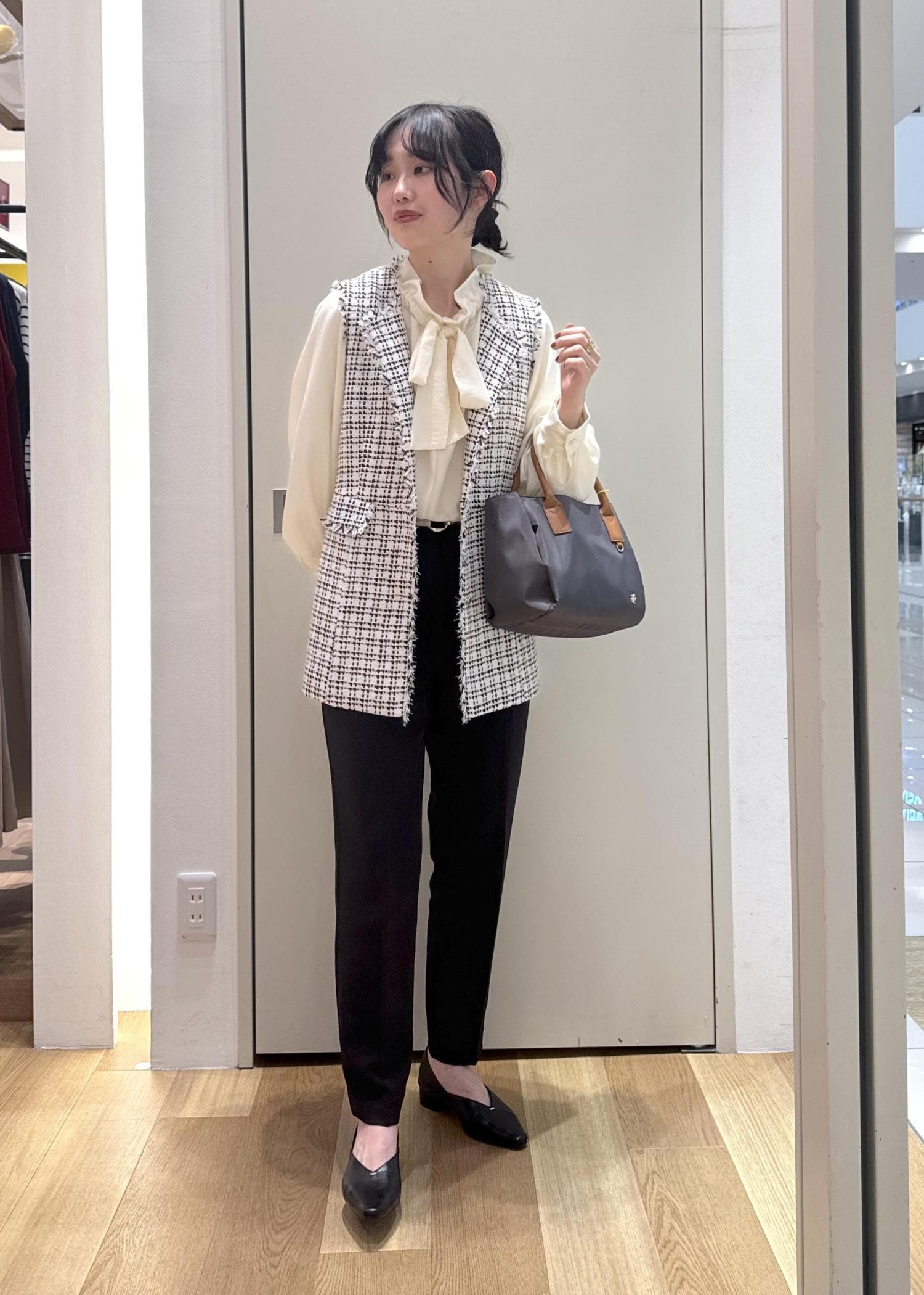 ボウタイ風ブラウス×麻調テーパードパンツ