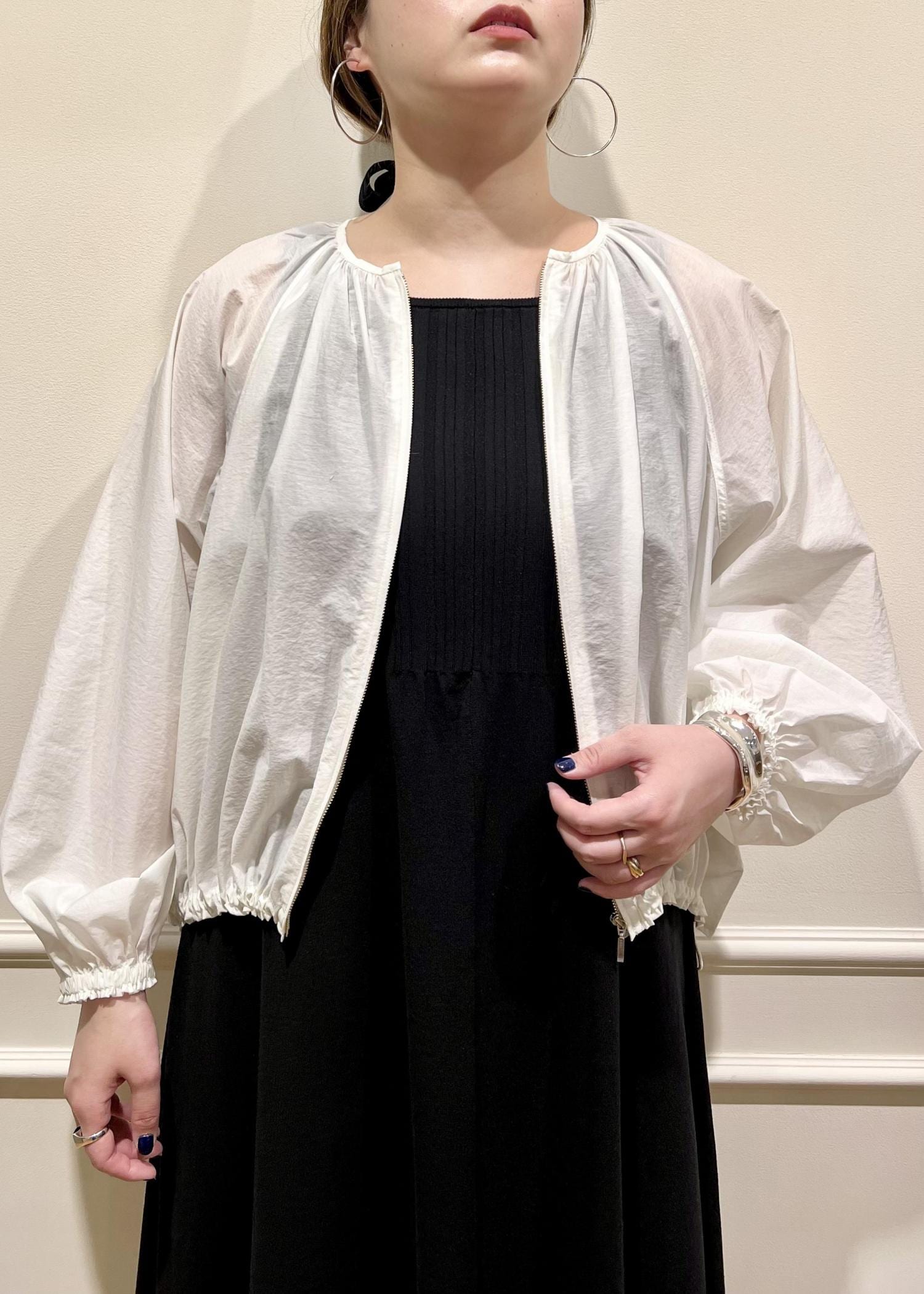 透け感のある白のブルゾンも清涼感UP!