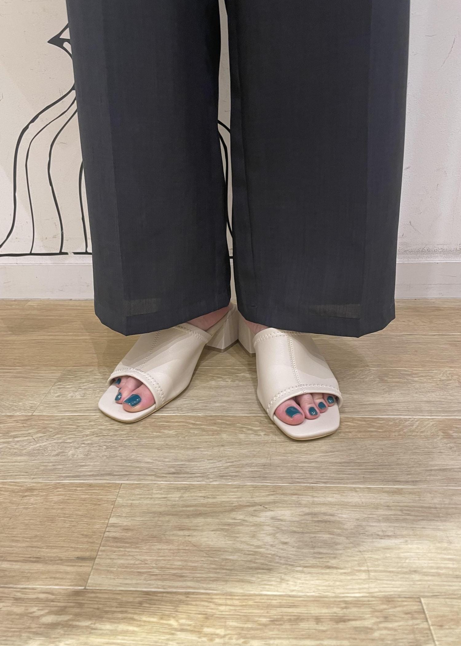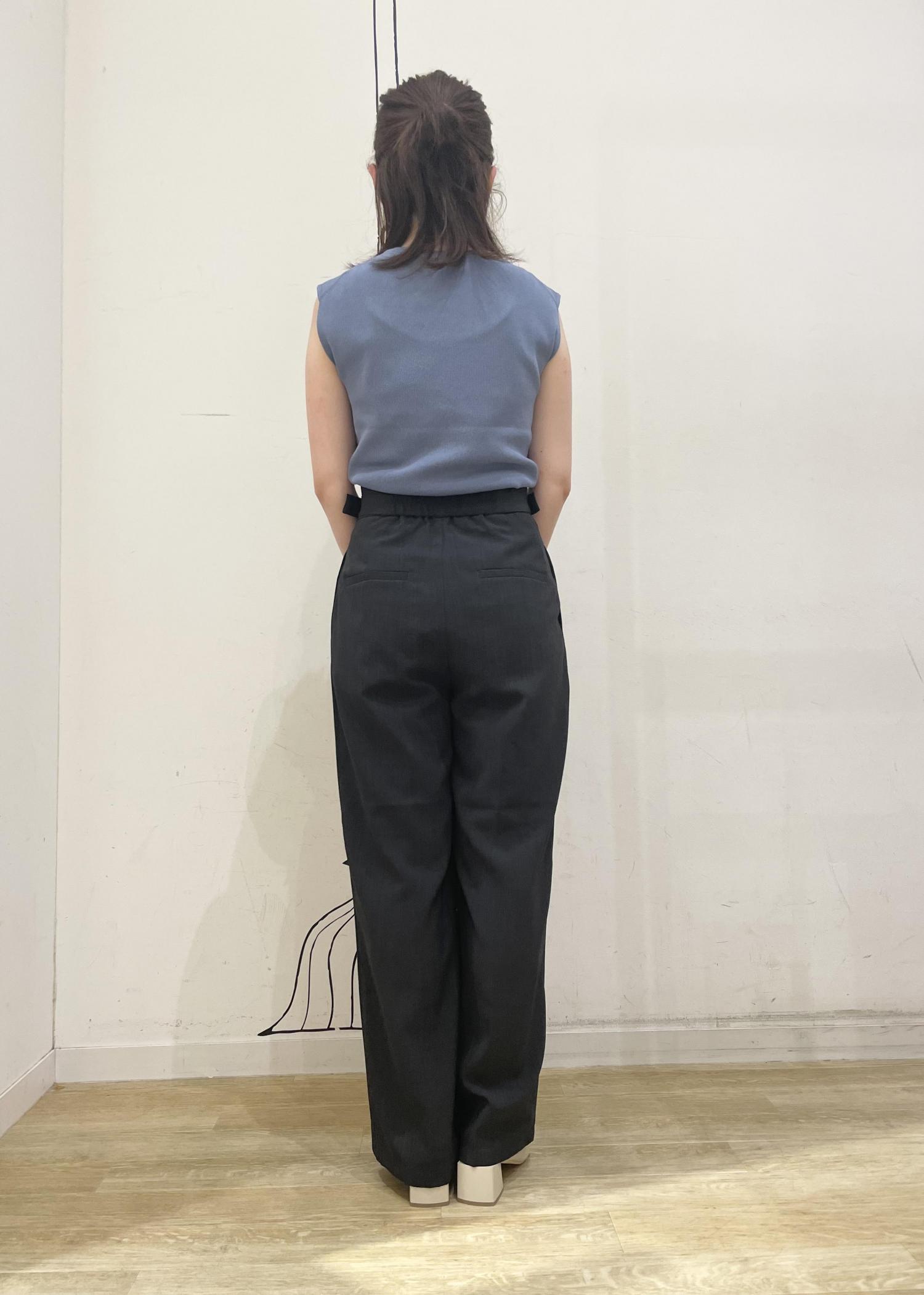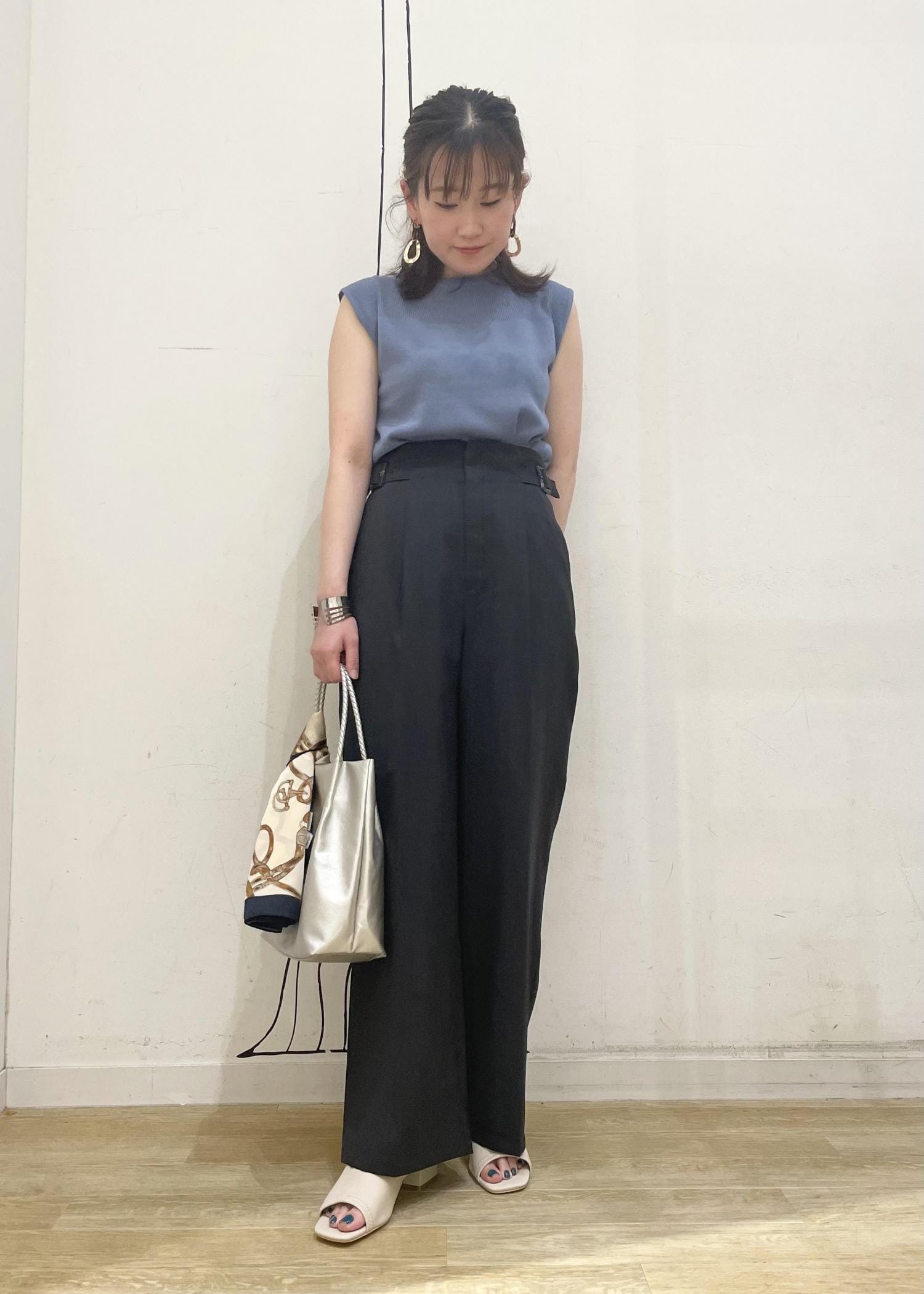 夏らしいブルートップスを主役にスミクロワイドパンツを合わせて、エレガントさを意識しました。洋服が無地なのでカバンにスカーフを巻いてポイントをおきました。