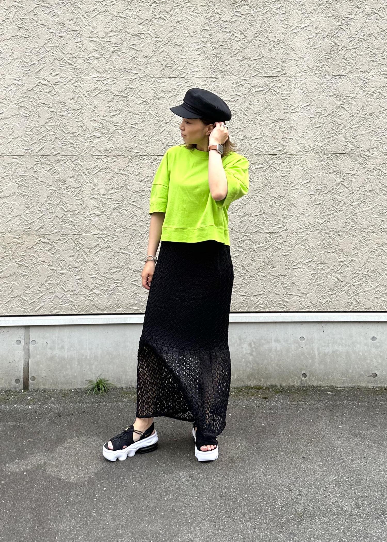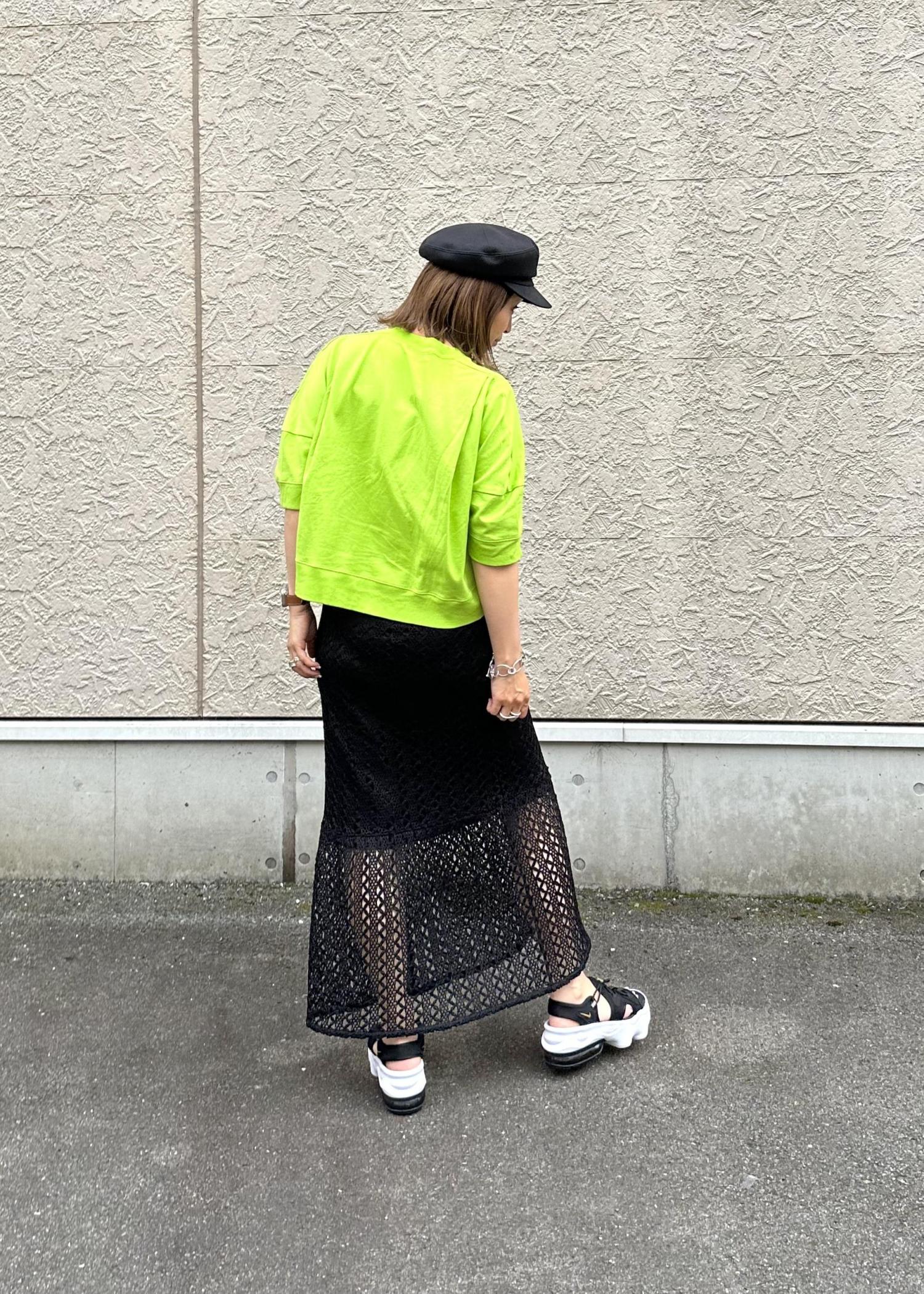 単品で見ると、かなり甘めのレーススカートをあえてスニーカーサンダルとTシャツでメンズルックに外しました。