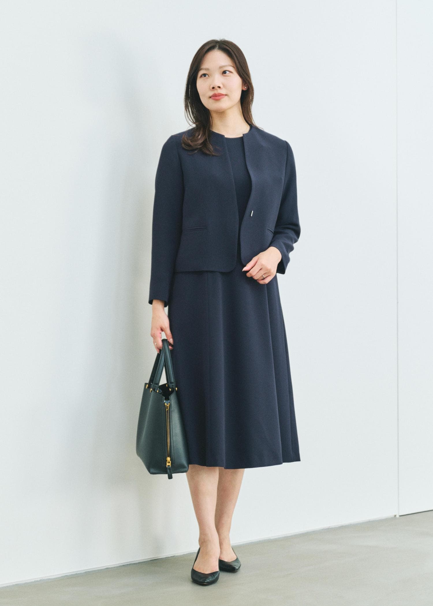 バックスタイルも抜かりのないデザイントップスを合わせて夏の通勤スタイルを楽しんでください