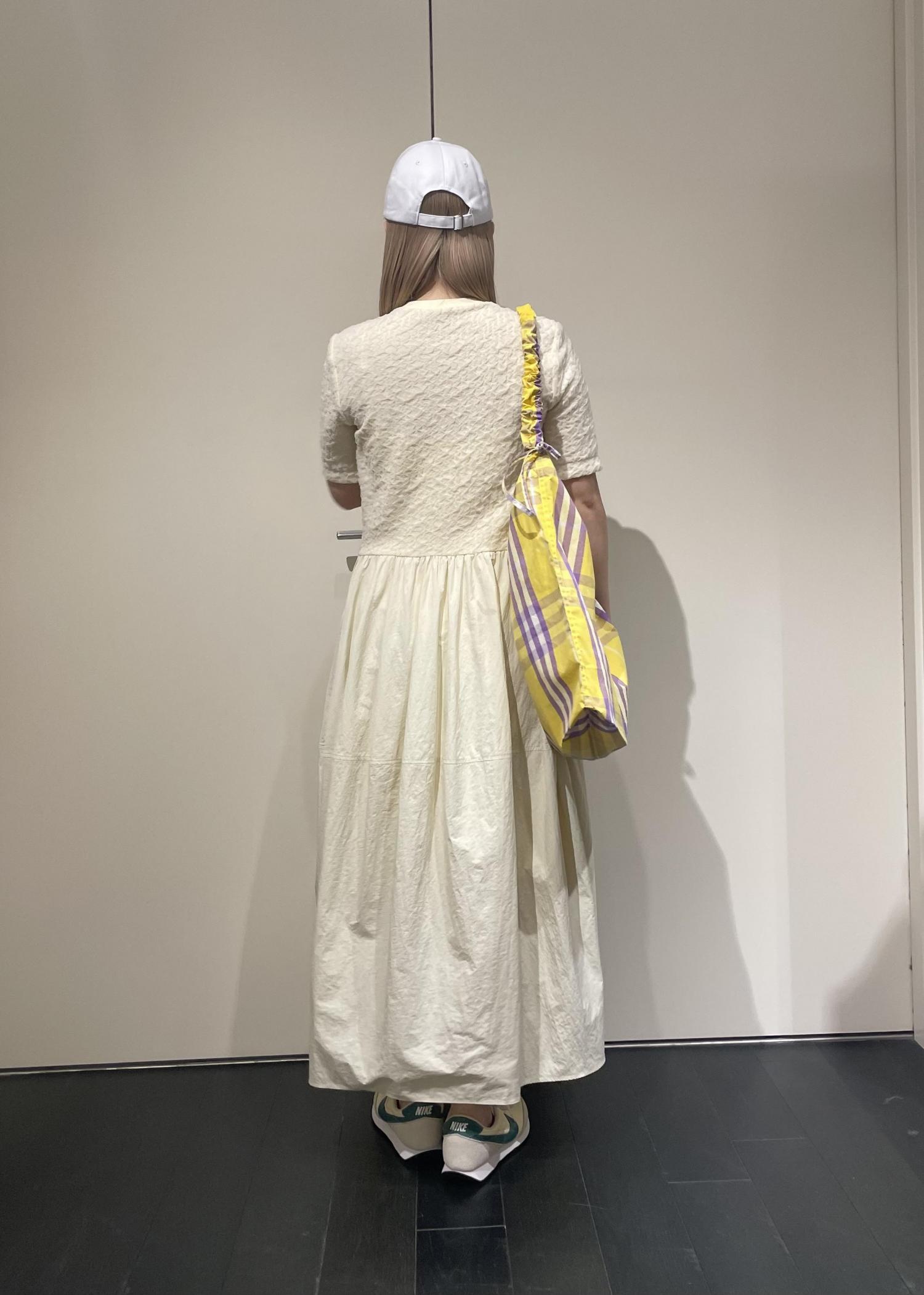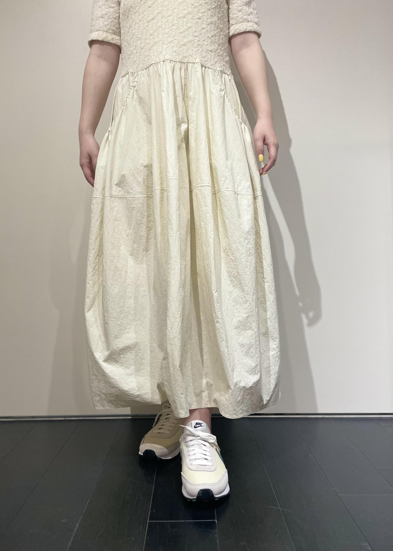 シアーとジャージ素材の表情のある伸縮性のある生地とワッシャー加工の施されたナイロンスカートの1枚で様になるワンピースです◎