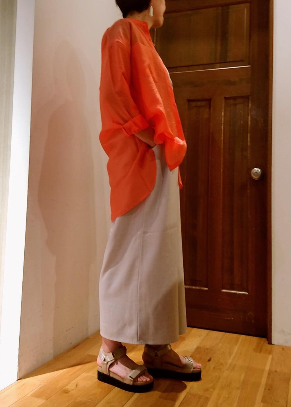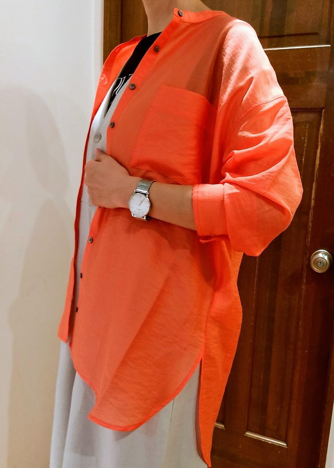 シアーシャツのおすすめコーデです。シンプルなサロペットスタイルに、ビビッドカラーのオレンジを合わせポイントにしました。シャツは、タイトスカートやワンピの羽織としても素敵です。冷房対策にも使えるので、この夏に一押しアイテムです。