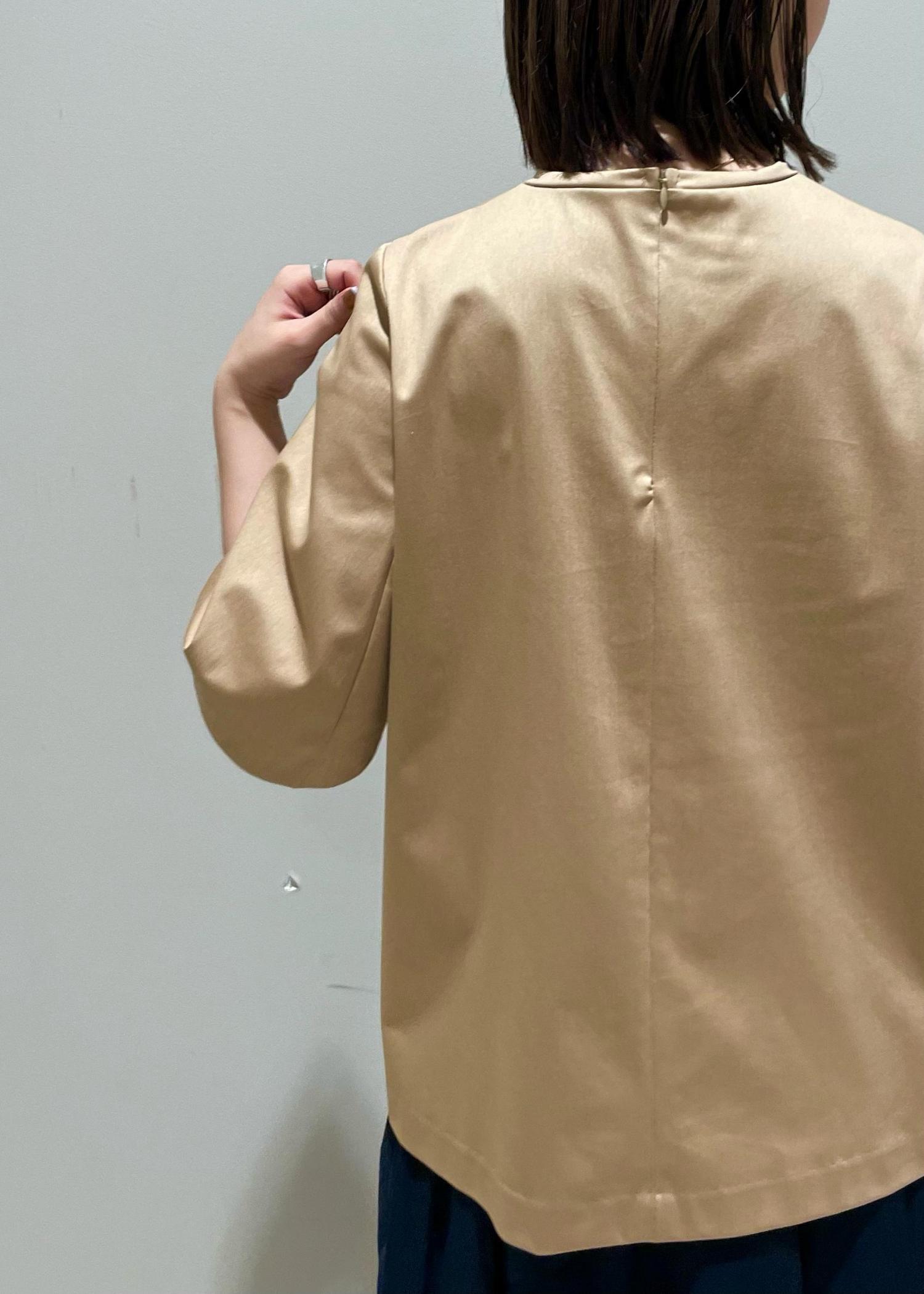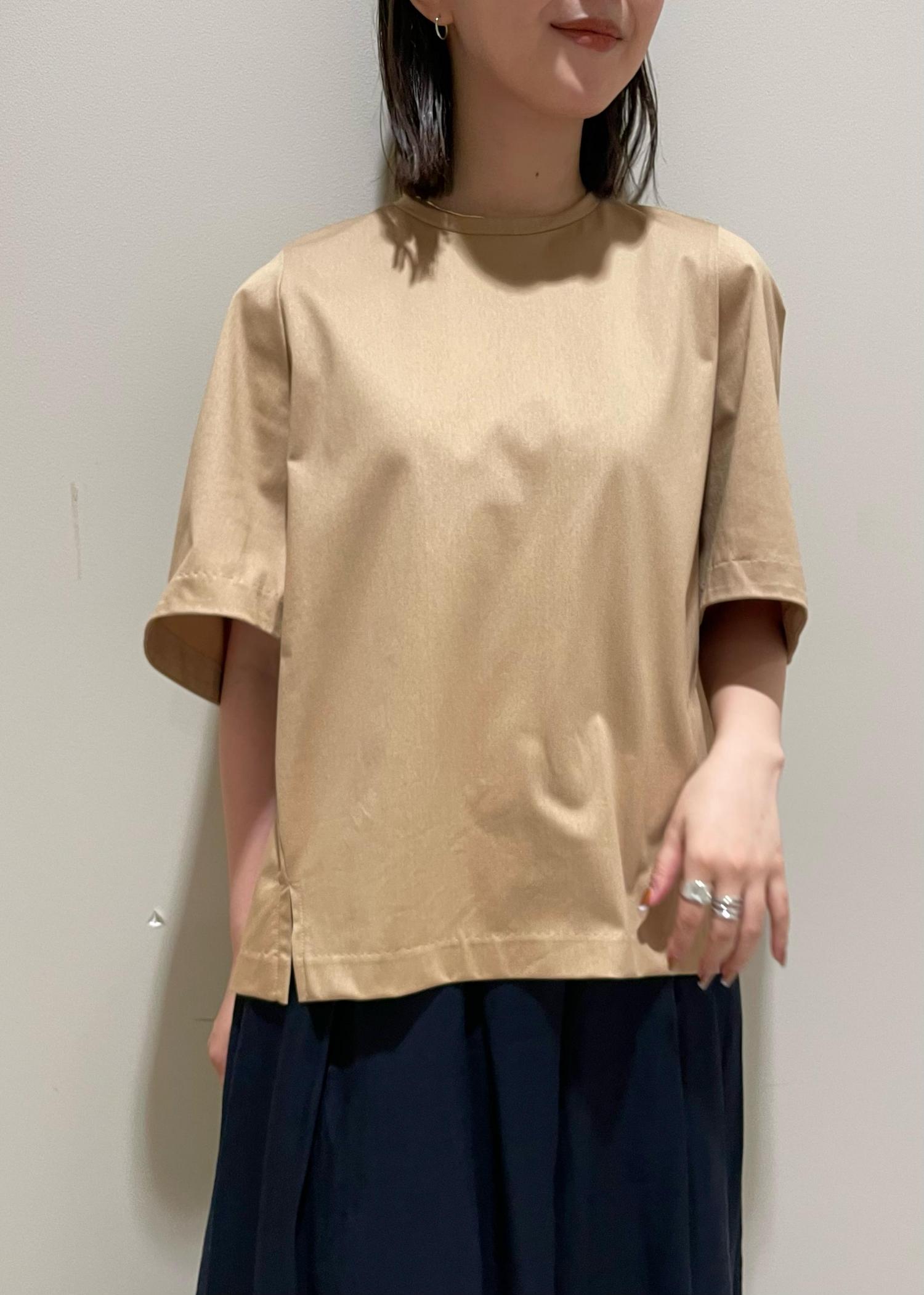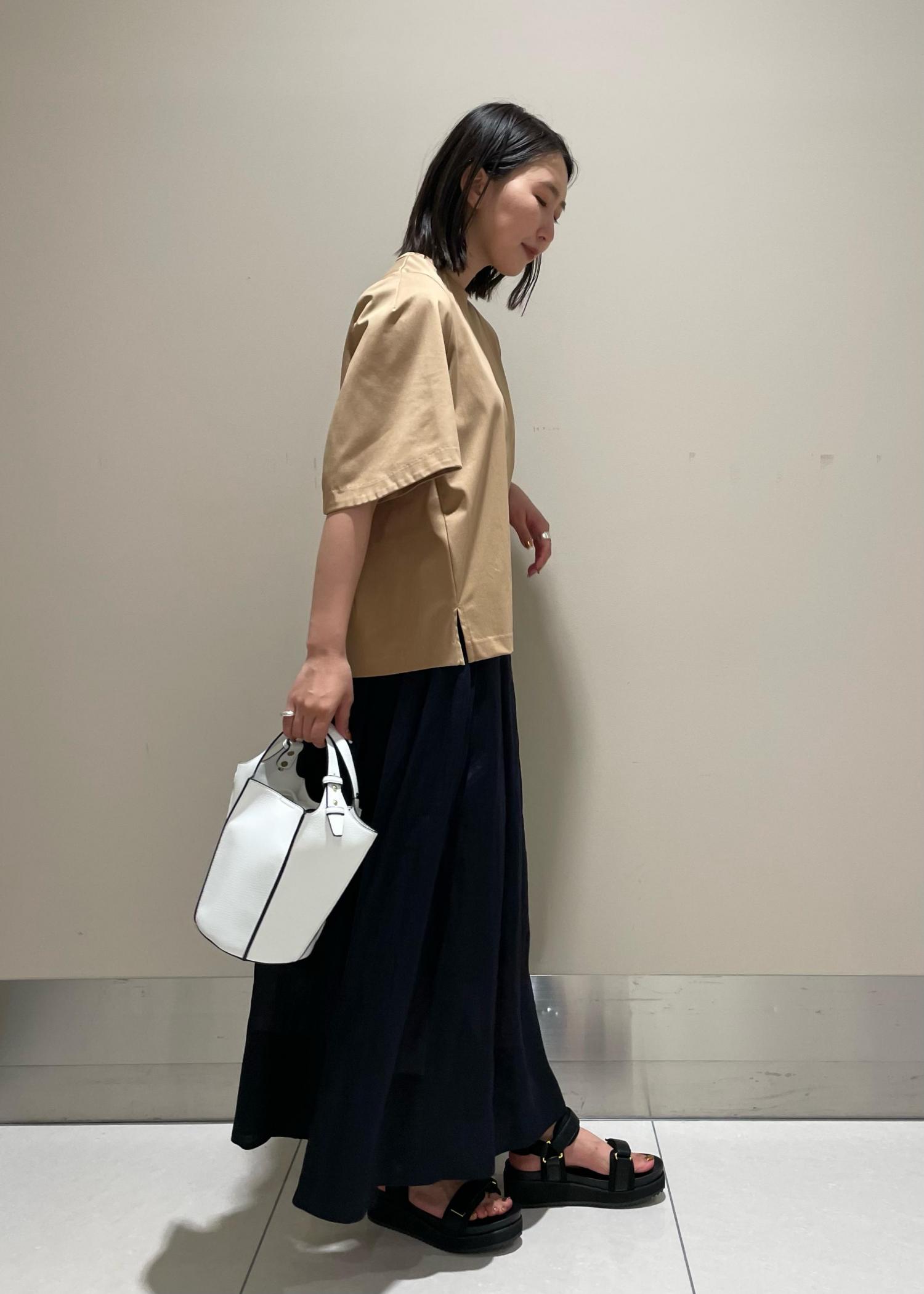 ベージュ×ネイビーで落ち着きのある上品な印象にしつつ、お洋服は身体のシルエットを拾いづらいアイテムでストレスフリーに。
