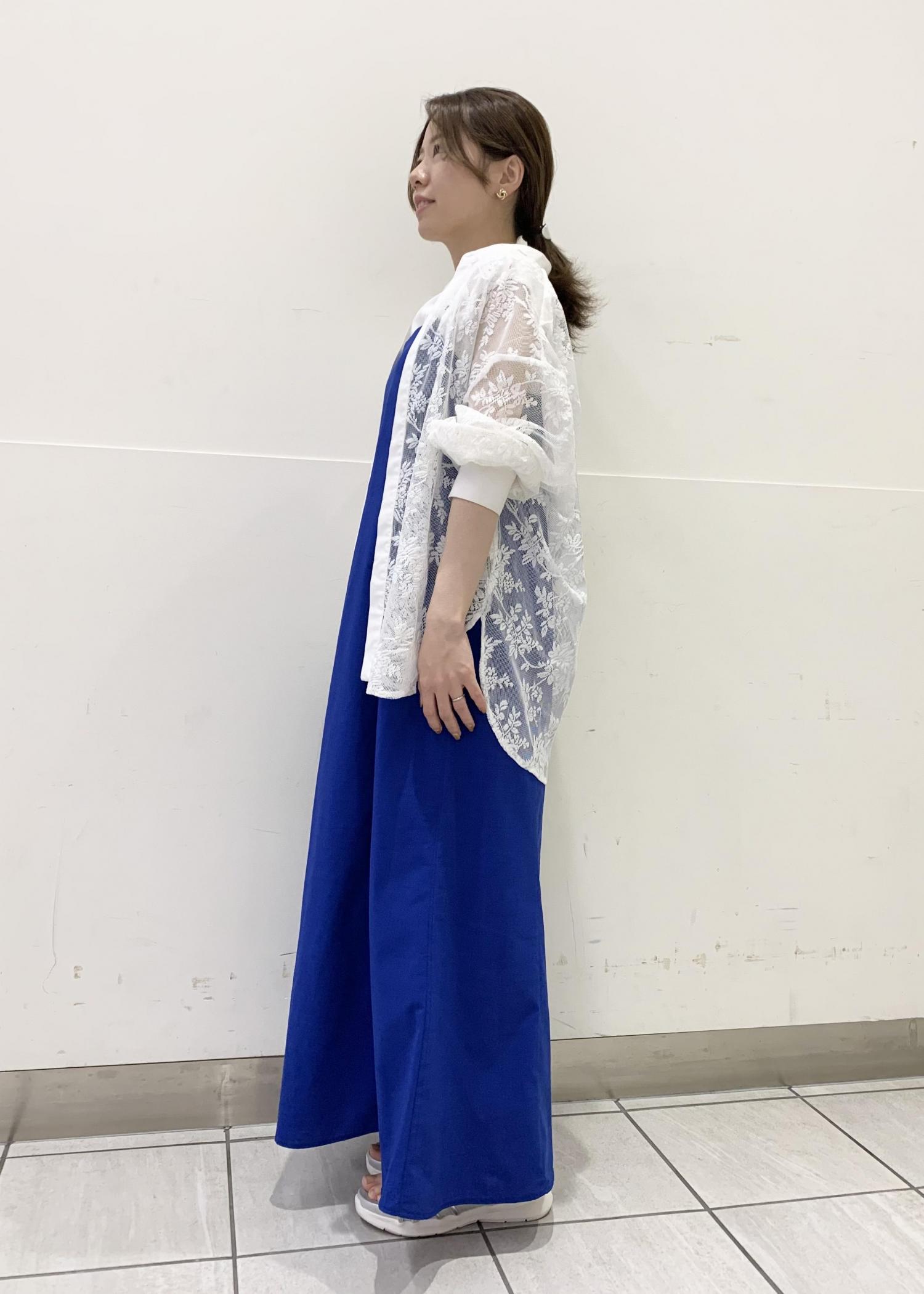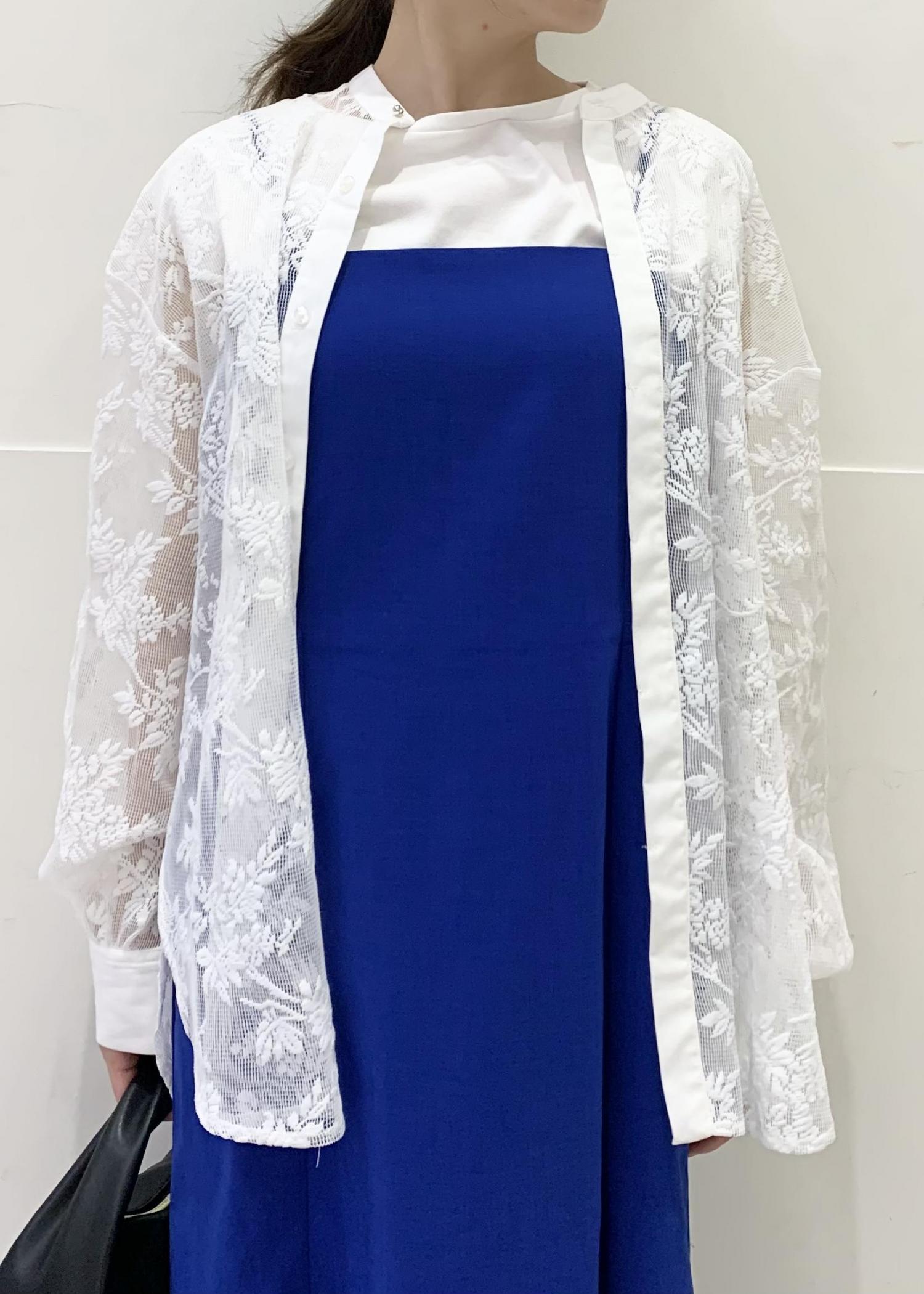 ブルーのキャミワンピースにレースシャツを合わせることで、グッと爽やかな印象に!