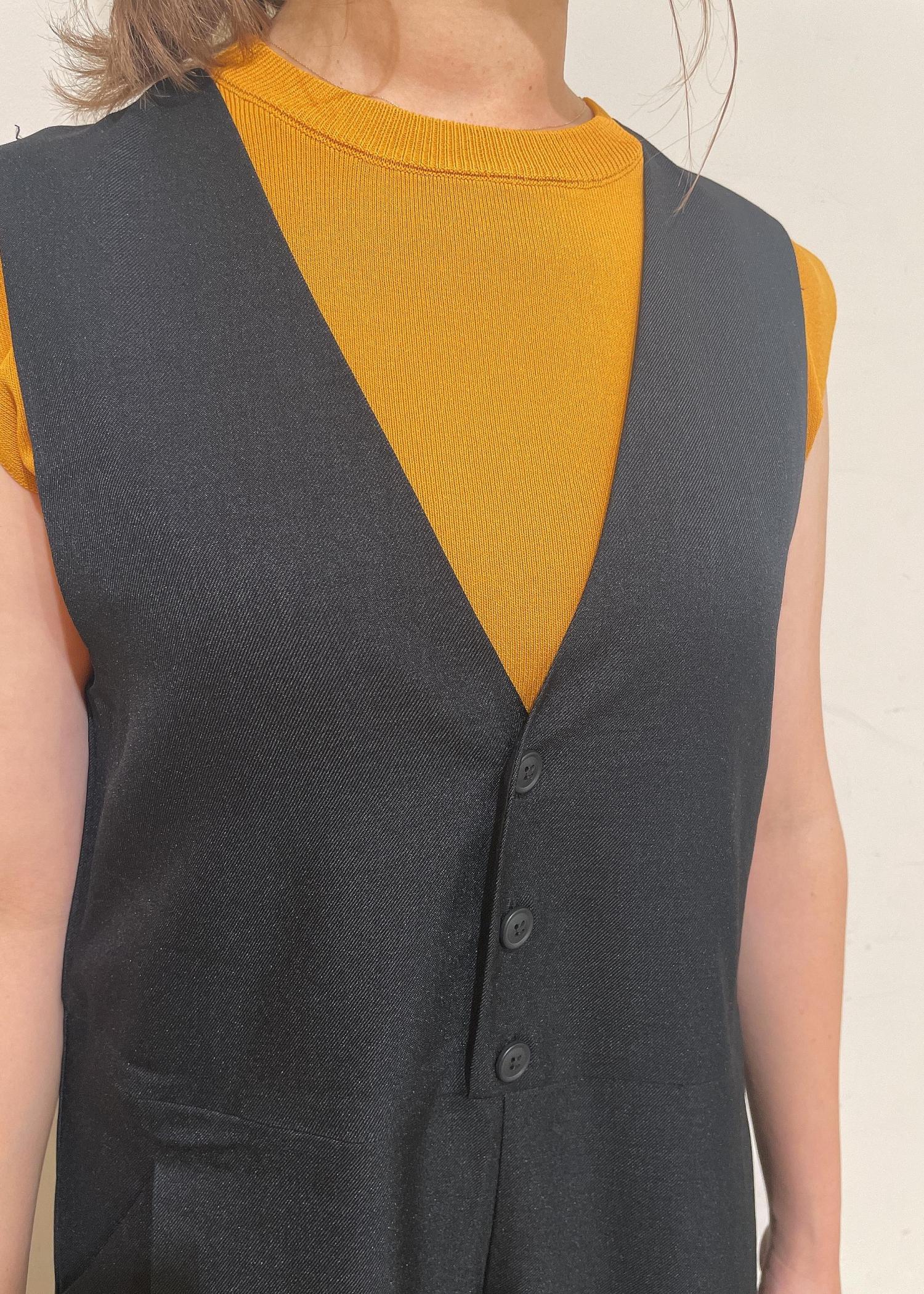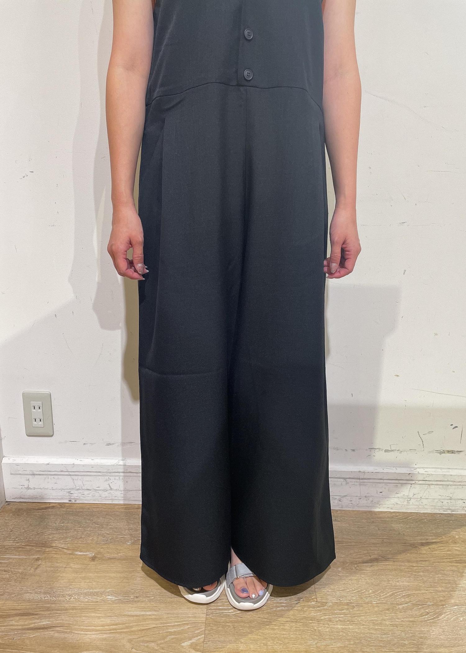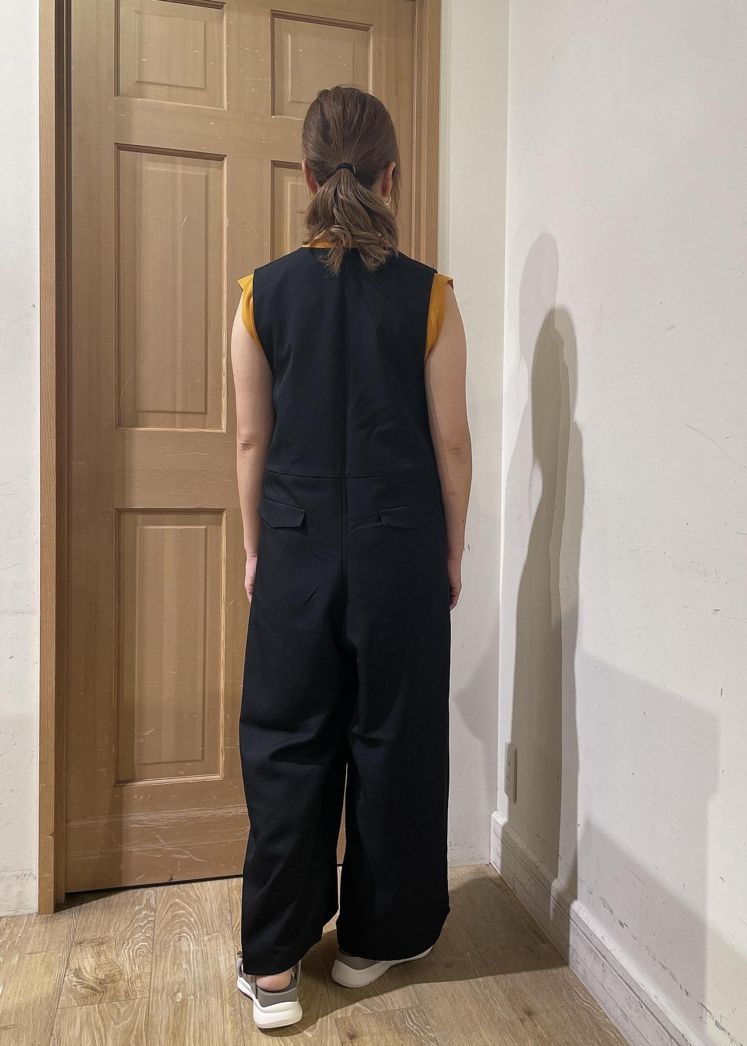 ゆったりめのシルエットのオールインワンはインナーを袖なしにするとコンパクトに見えます。