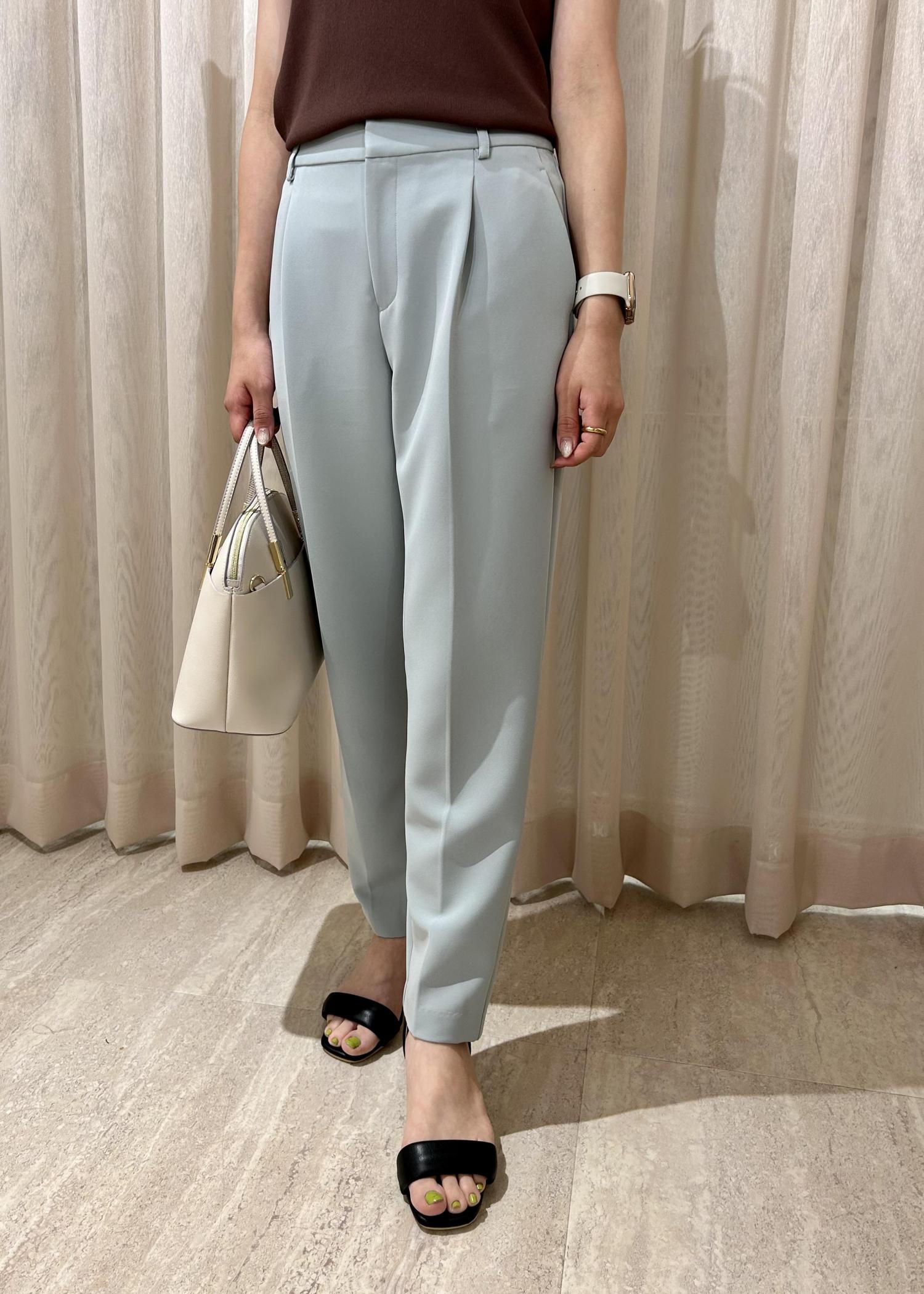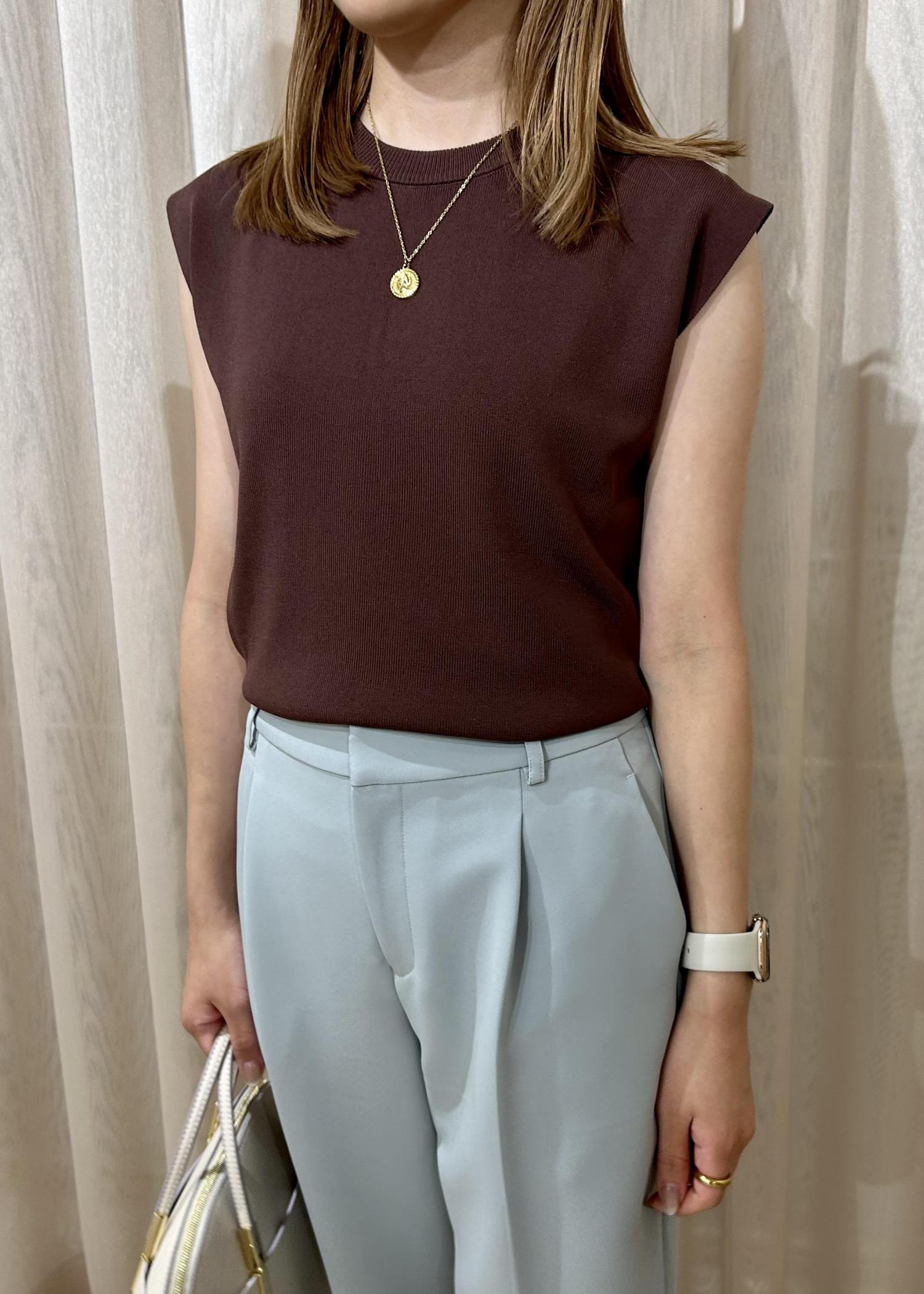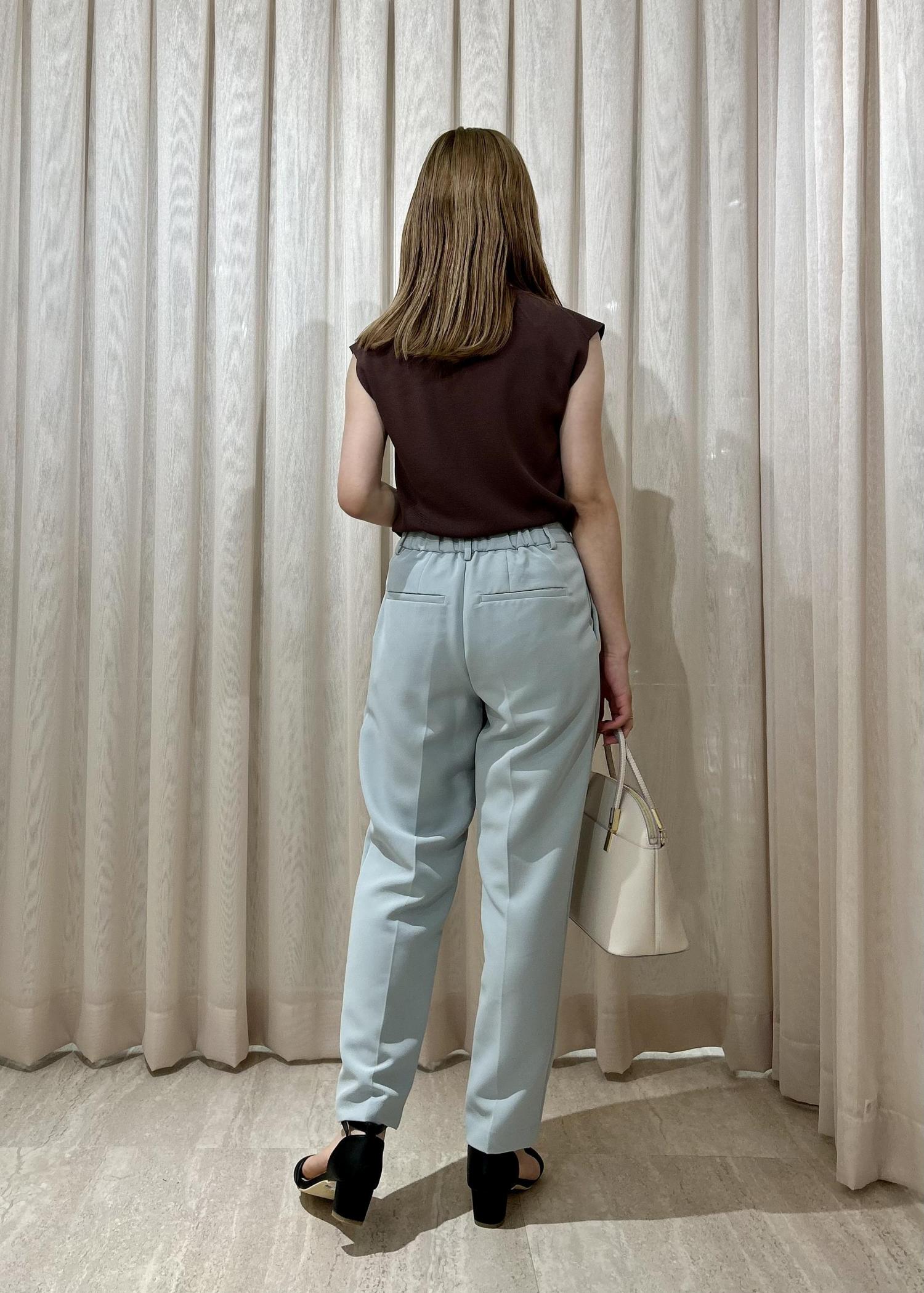毎年人気のゼロスリーブニットにグリーンのテーパードパンツを合わせたオフィスカジュアルコーデ。