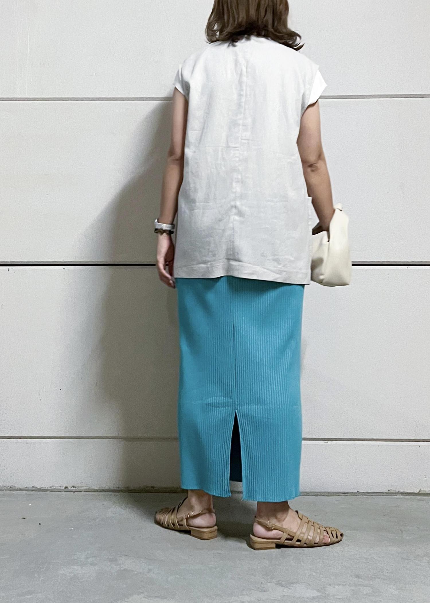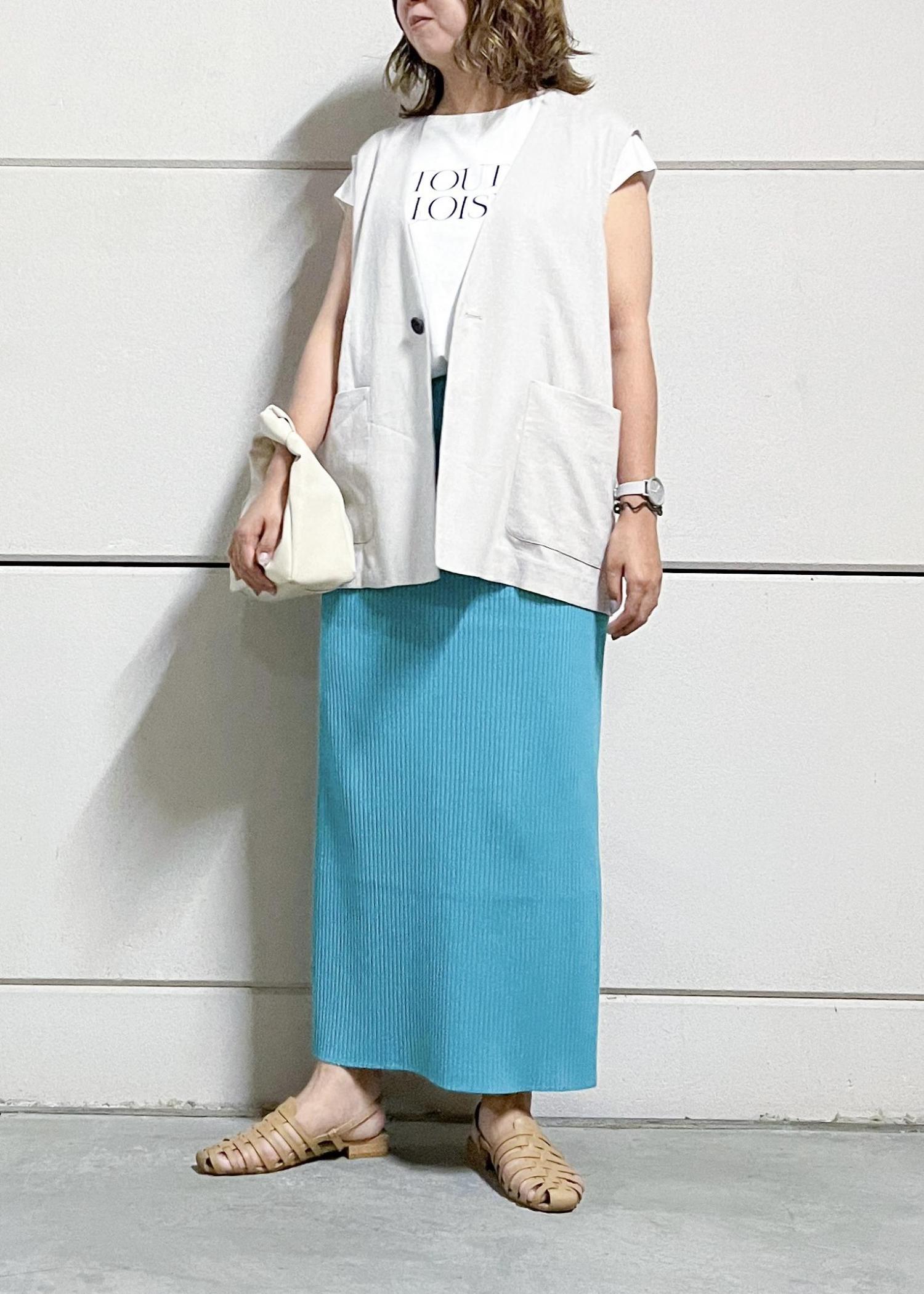 Tシャツにリブスカートの夏の定番コーデにジレを合わせて今年らしく。ジレは1枚あるとパンツスタイル、スカートスタイル、ワンピースなどコーディネートのプラス1アイテムとして着回し抜群です◎