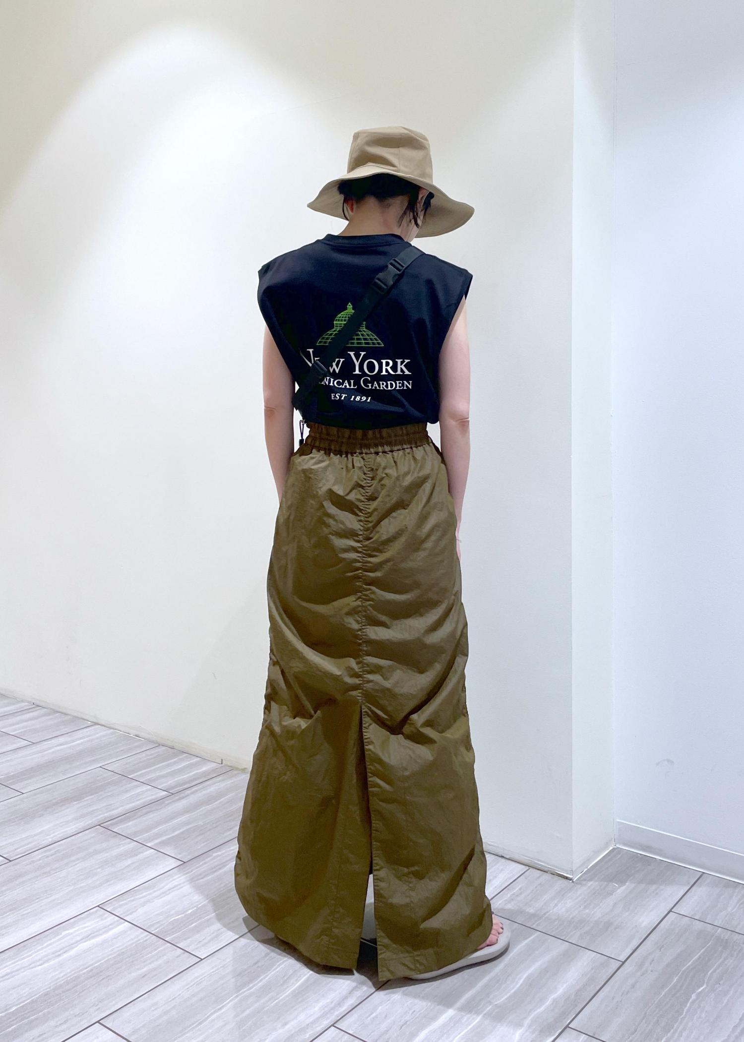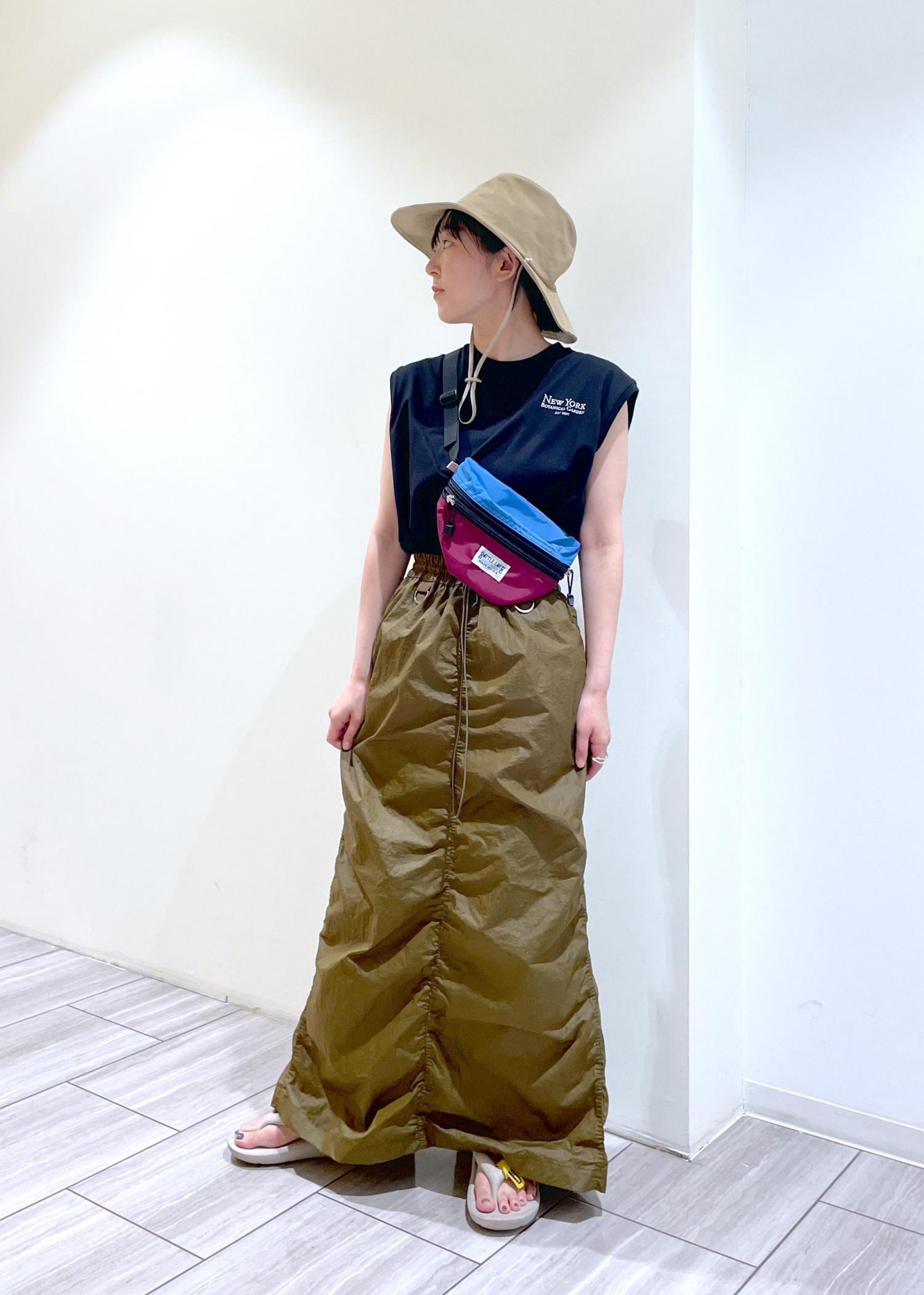 シャカシャカした素材のデザインスカートにTシャツを合わすと、スタイリングのアクセントになりおすすめです◎