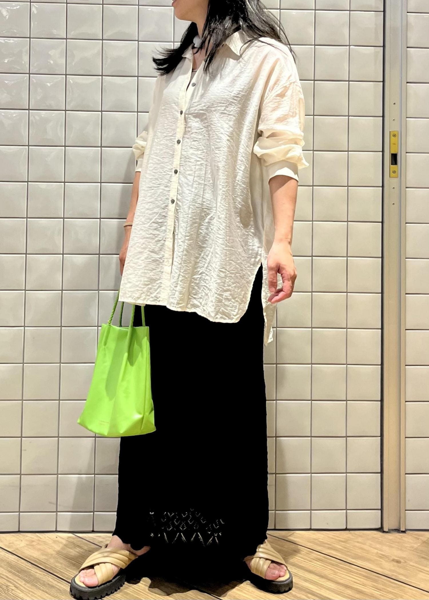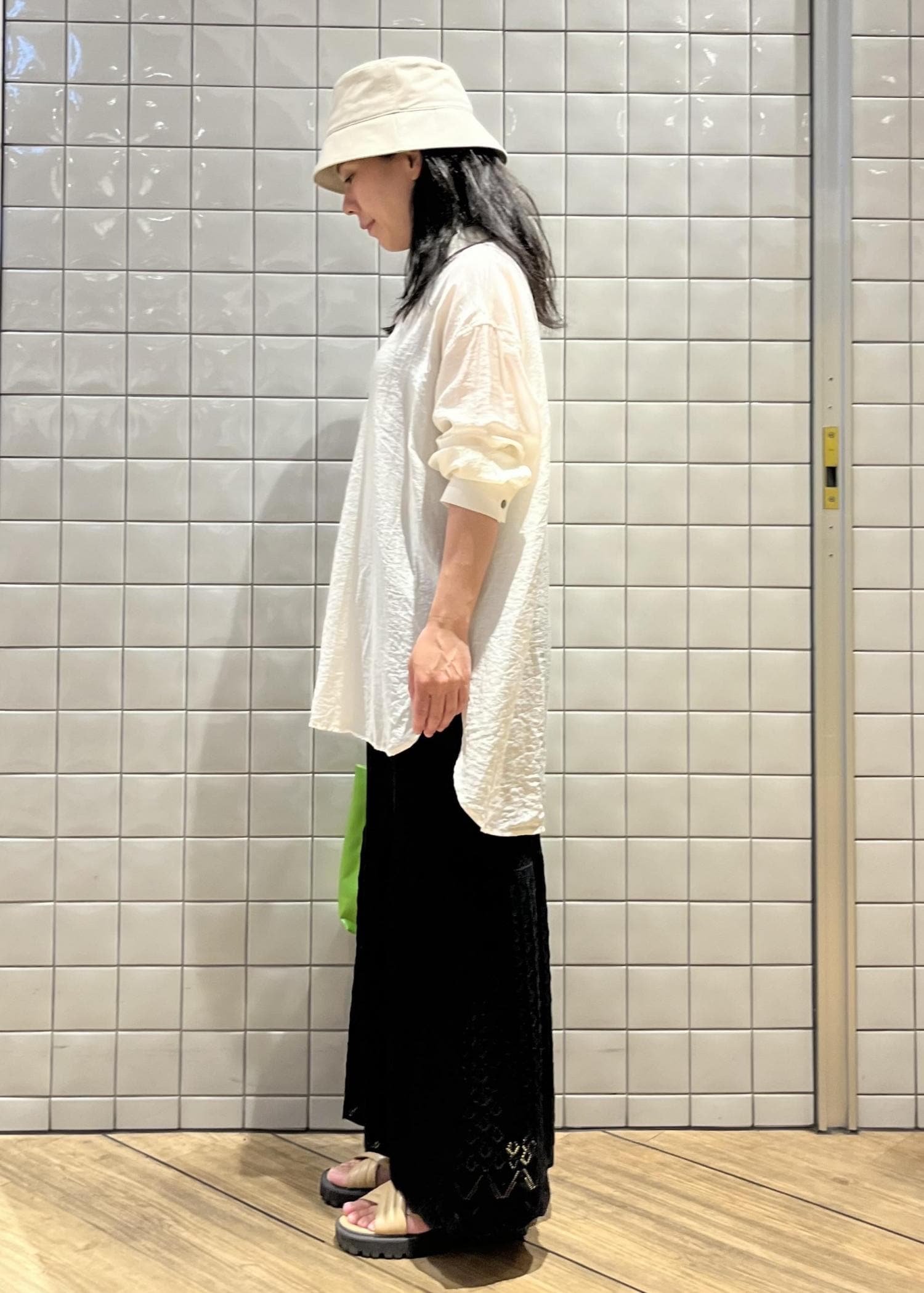 UVカット機能付きのバケットハットとシアーシャツでUV対策バッチリのコーデです(^_^)