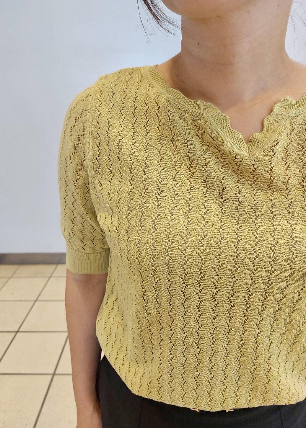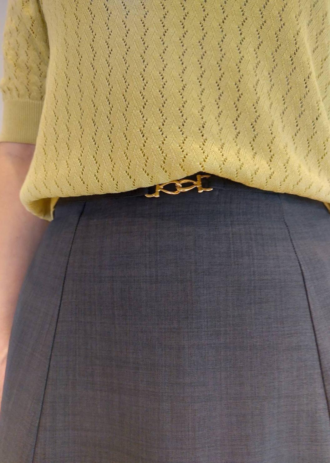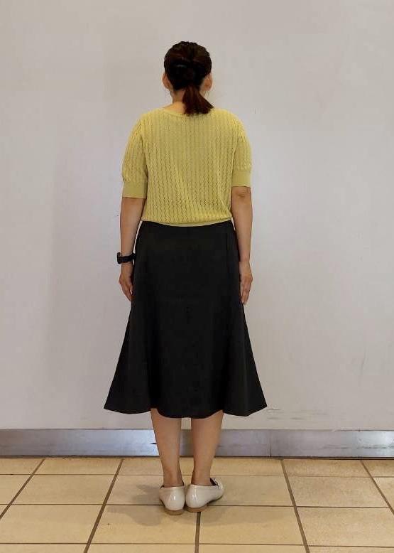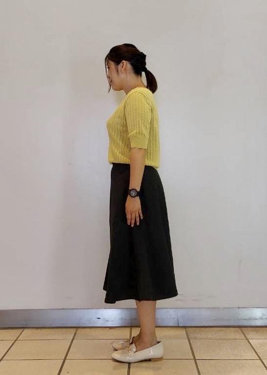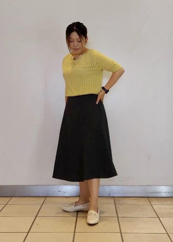 イエローのすかし網が可愛いニットに ゴールドパーツが付いたきれい目のスカートを合わせました。