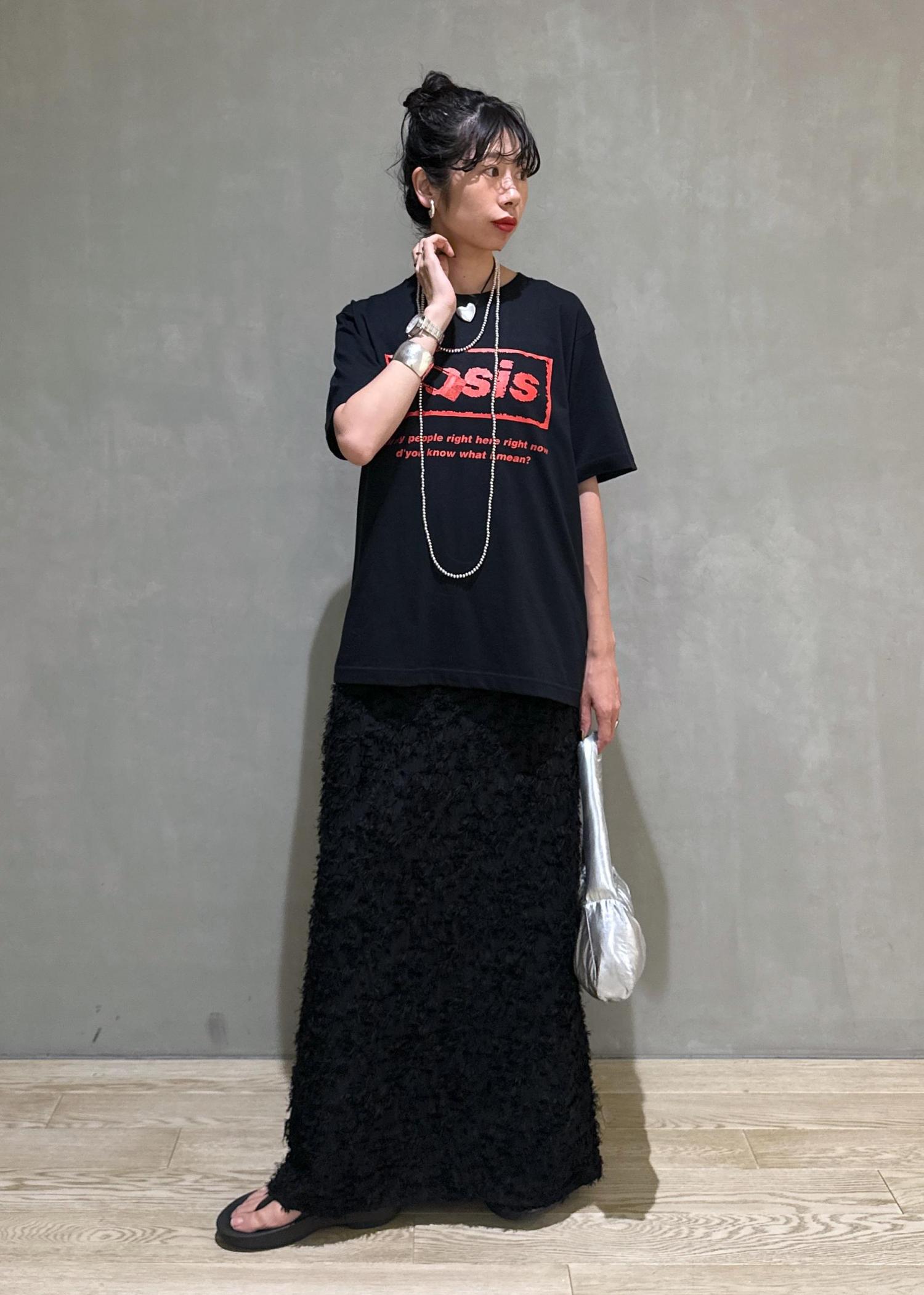 トップスは、oasisのTシャツ。ユニセックスで使えるアイテムでMサイズを着用しています!