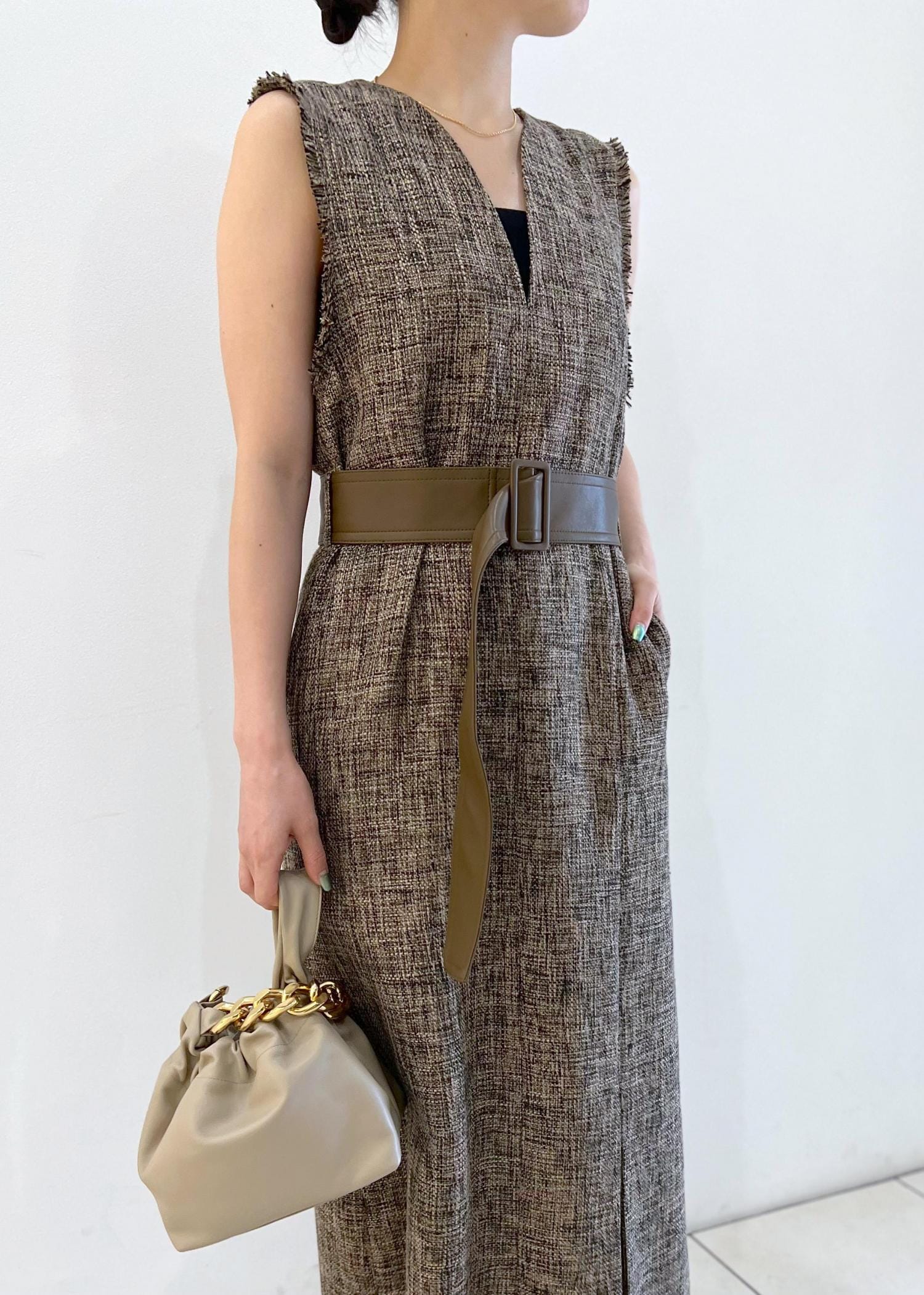 首元の少しカーヴィーな深めVネックと、ベルトでウエストのメリハリの付く女性らしいシルエットのワンピース。