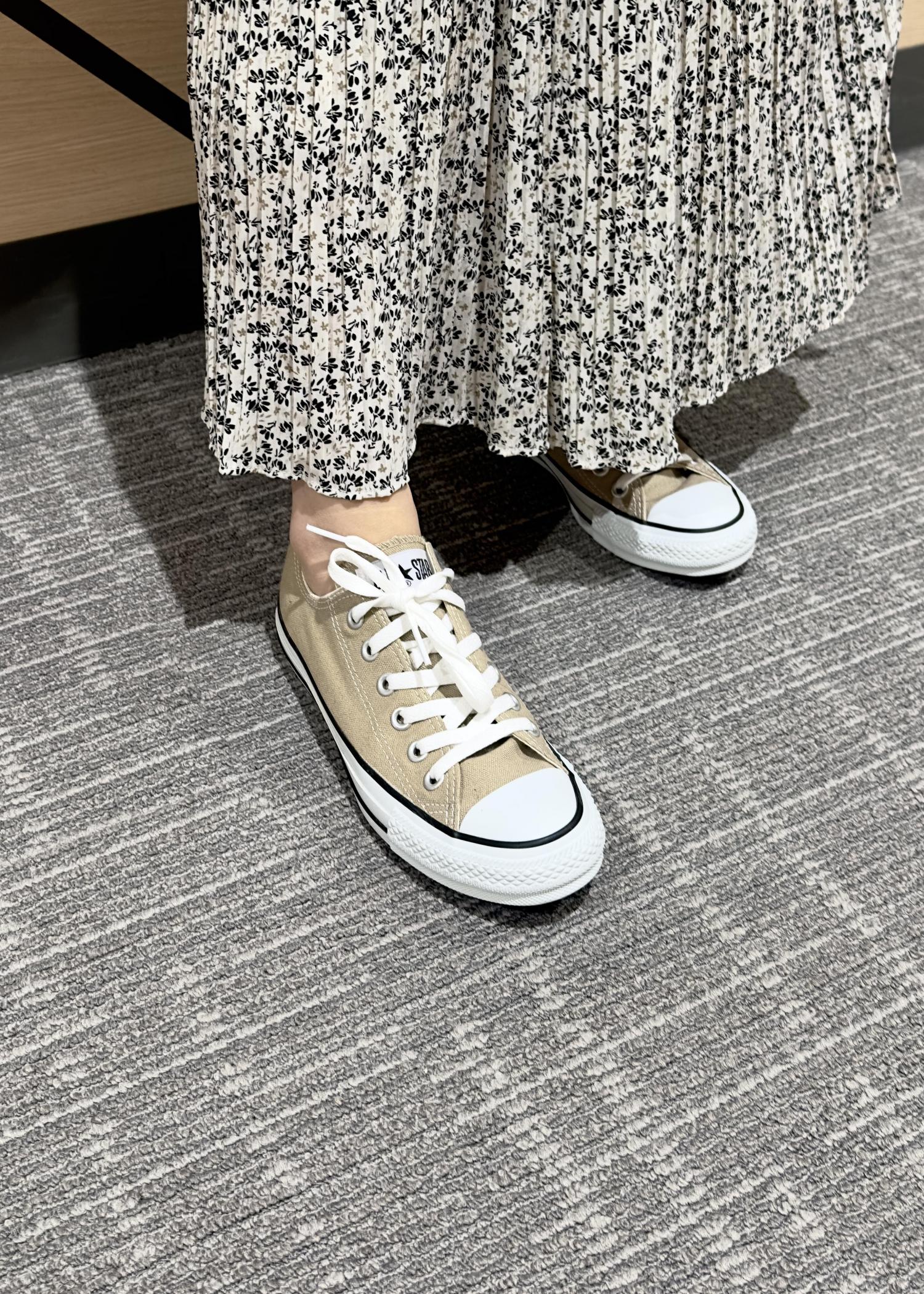 着丈が選べるプリーツスカートを使ったカジュアルコーデです。私は38の長い丈のスカートを着用しました。