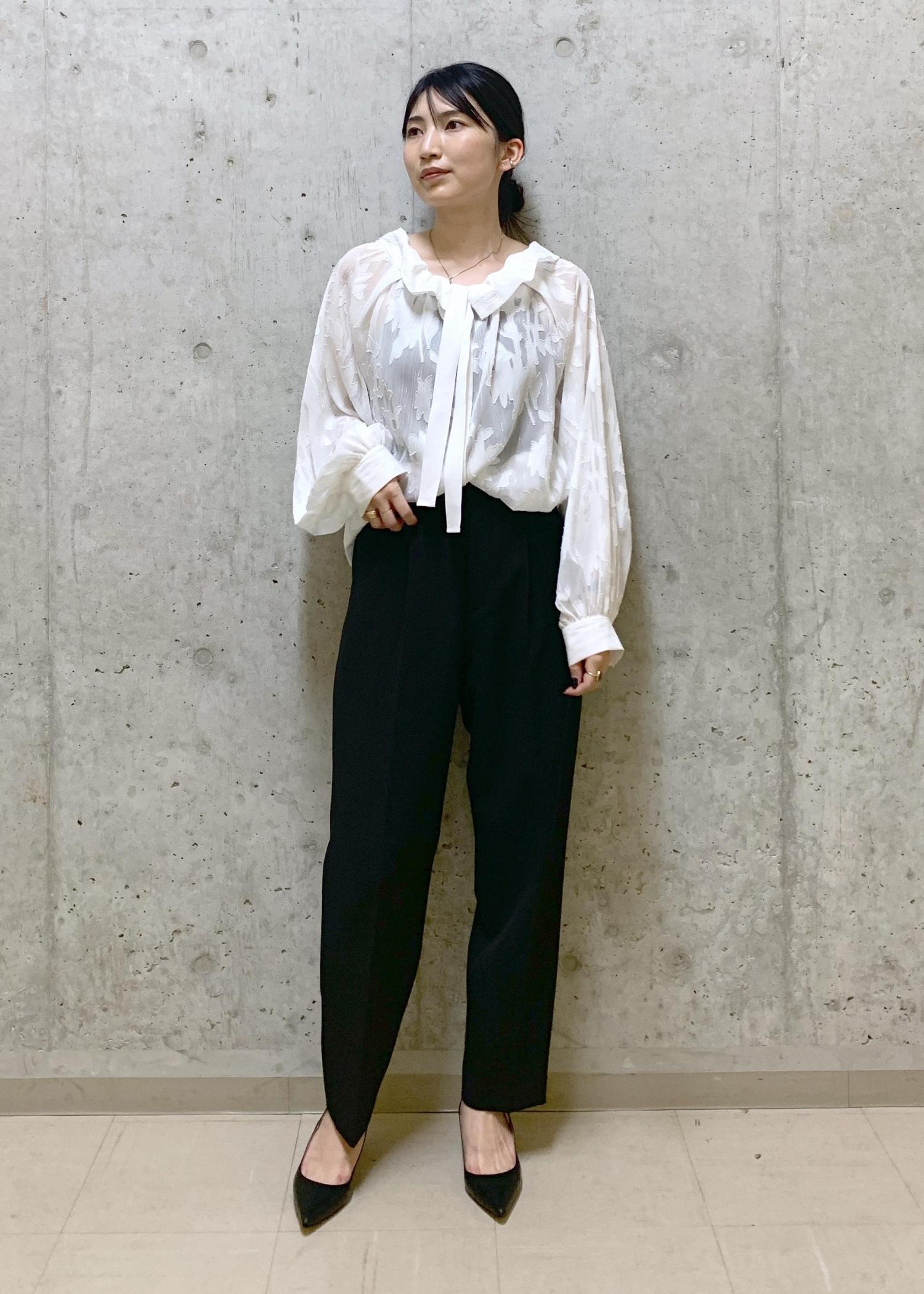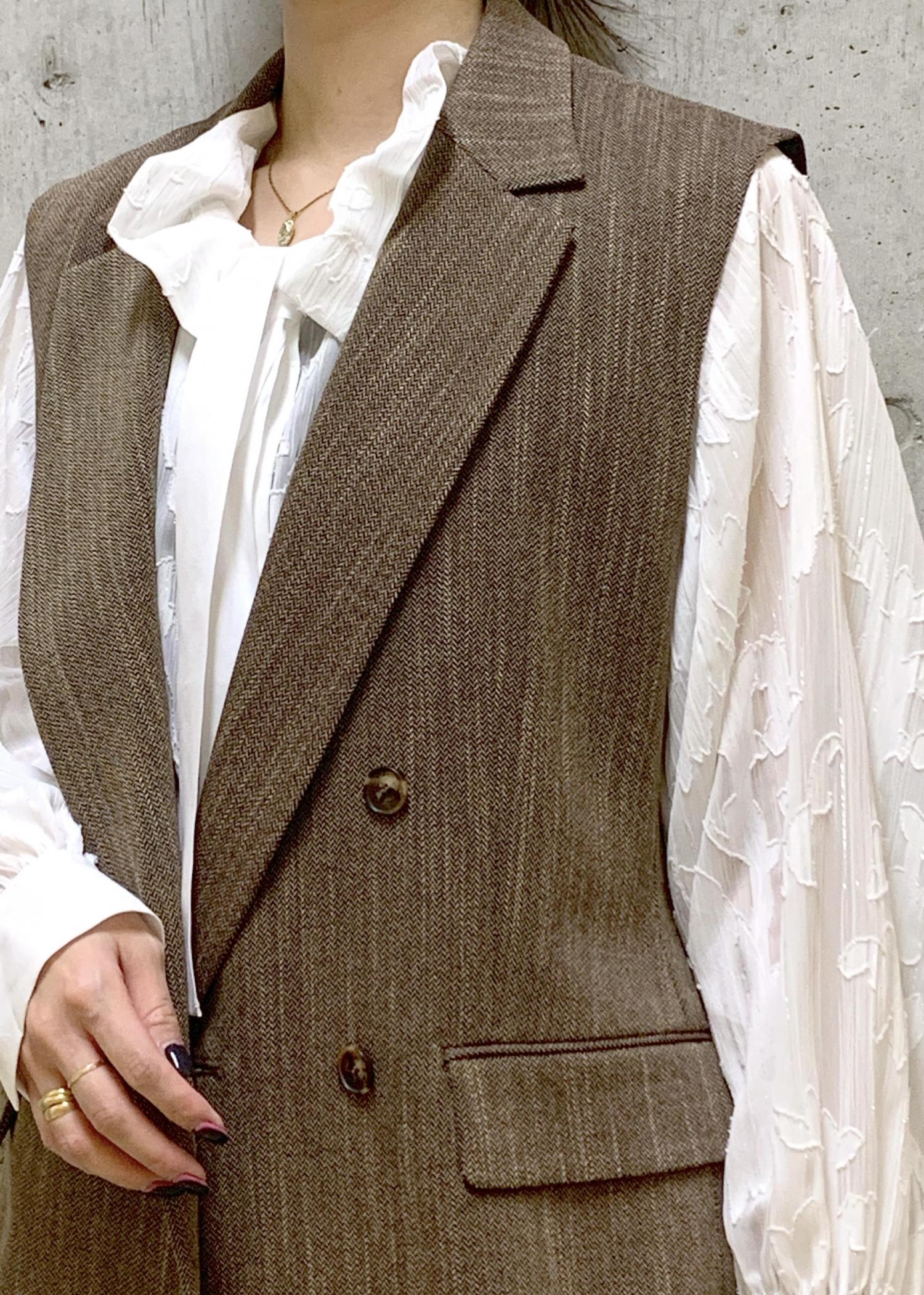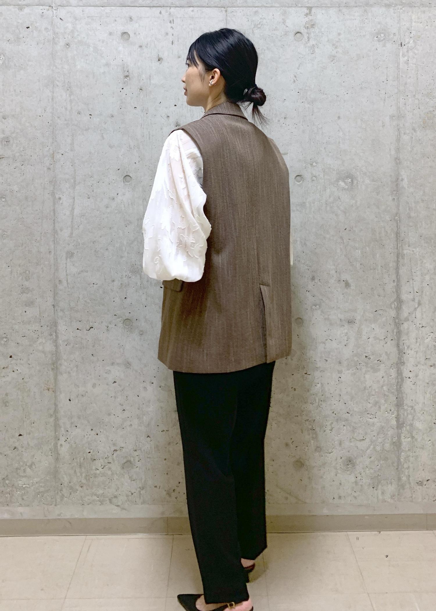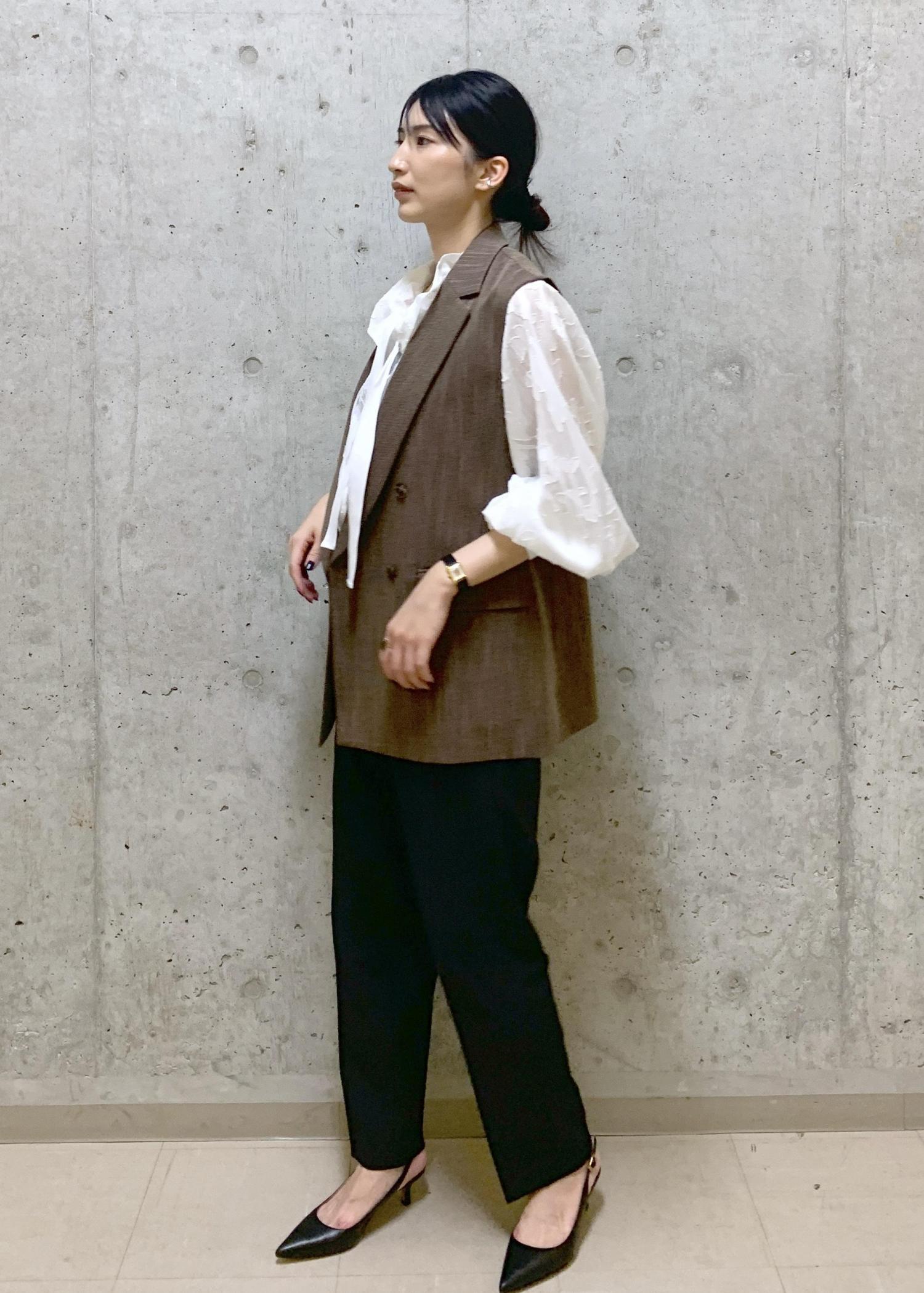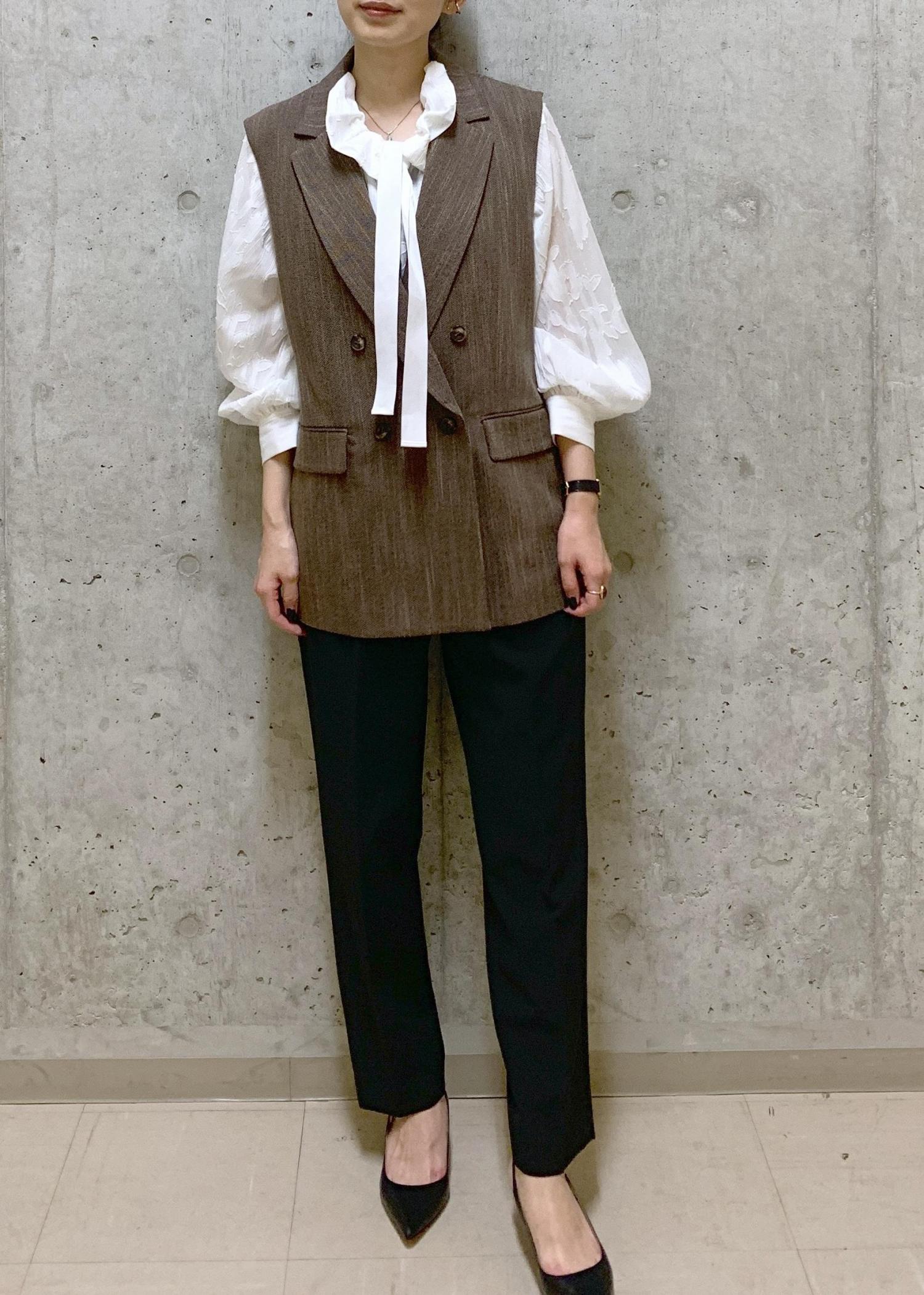 ツイード調のジレを羽織り、ブラックパンツで締めて
