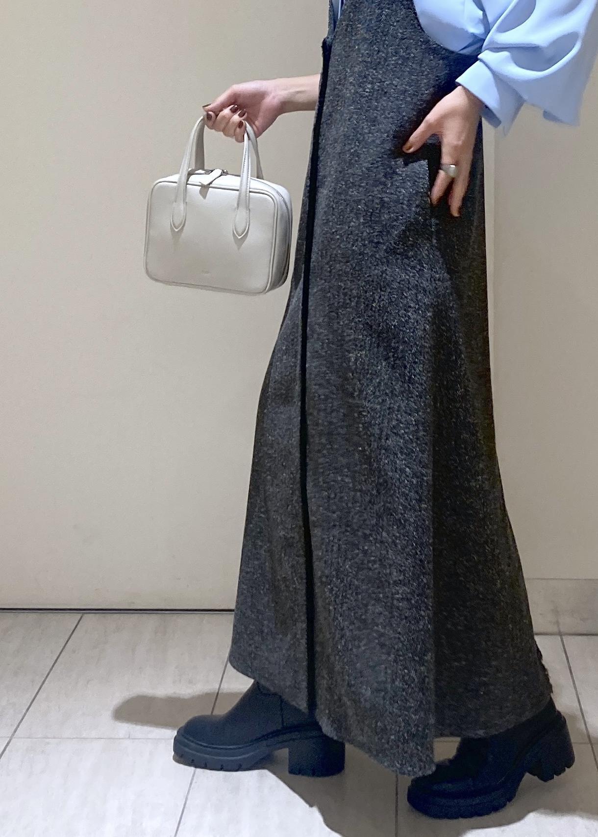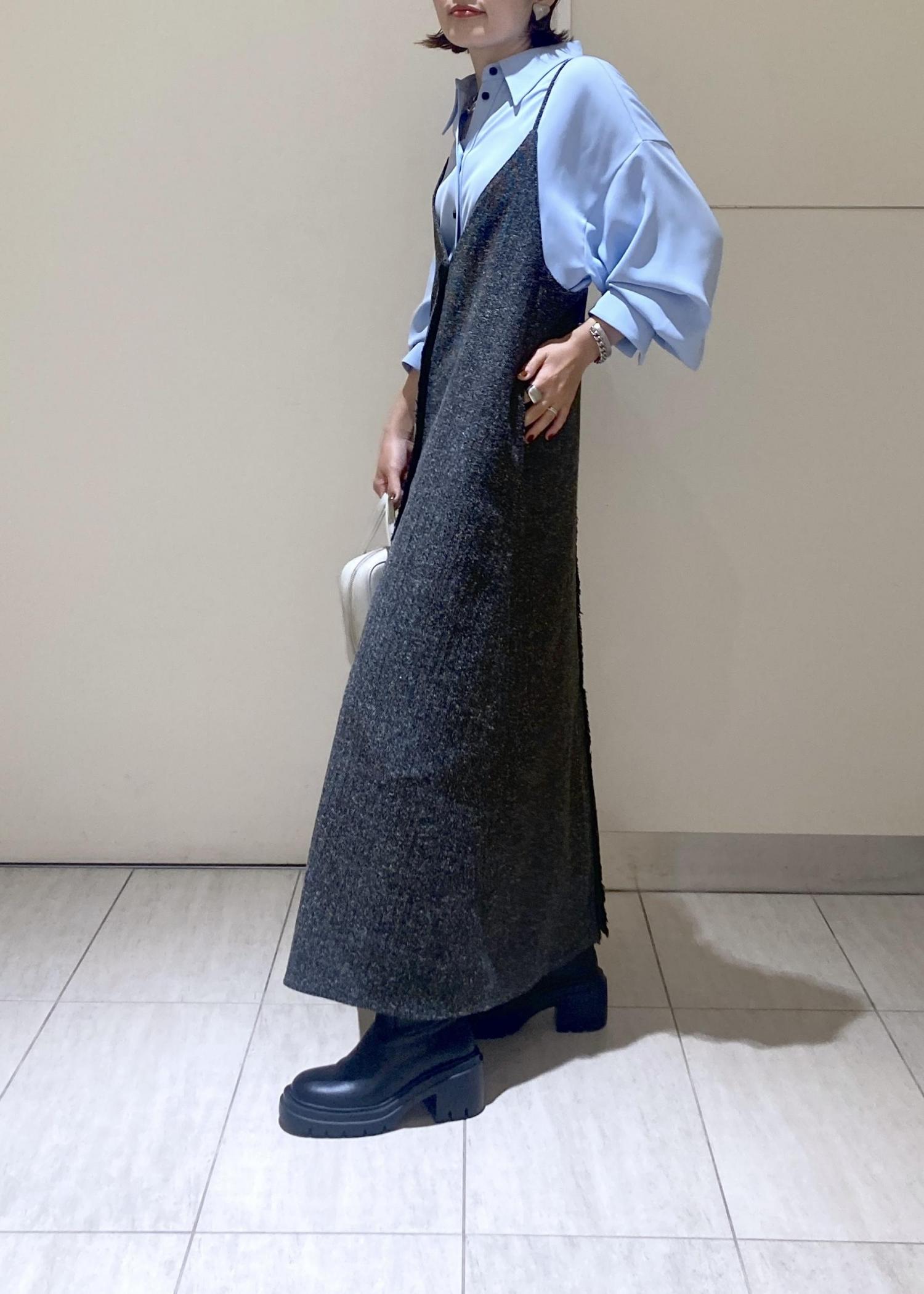 前回ご紹介のツィードキャミワンピースの丈を少し下げて、パンツの重ね着なしでご提案です。