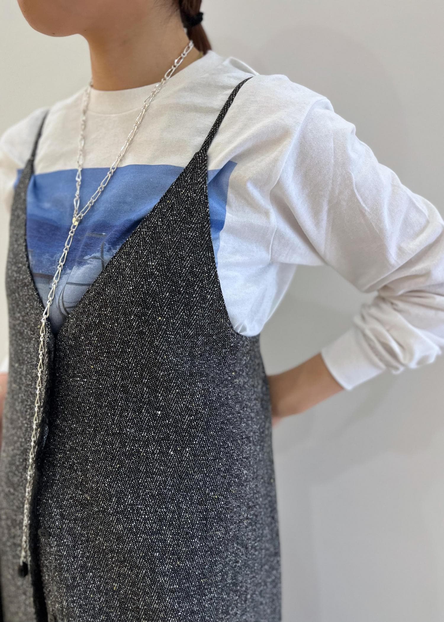 肩紐は調整可能で身長問わず着ていただけますよ。