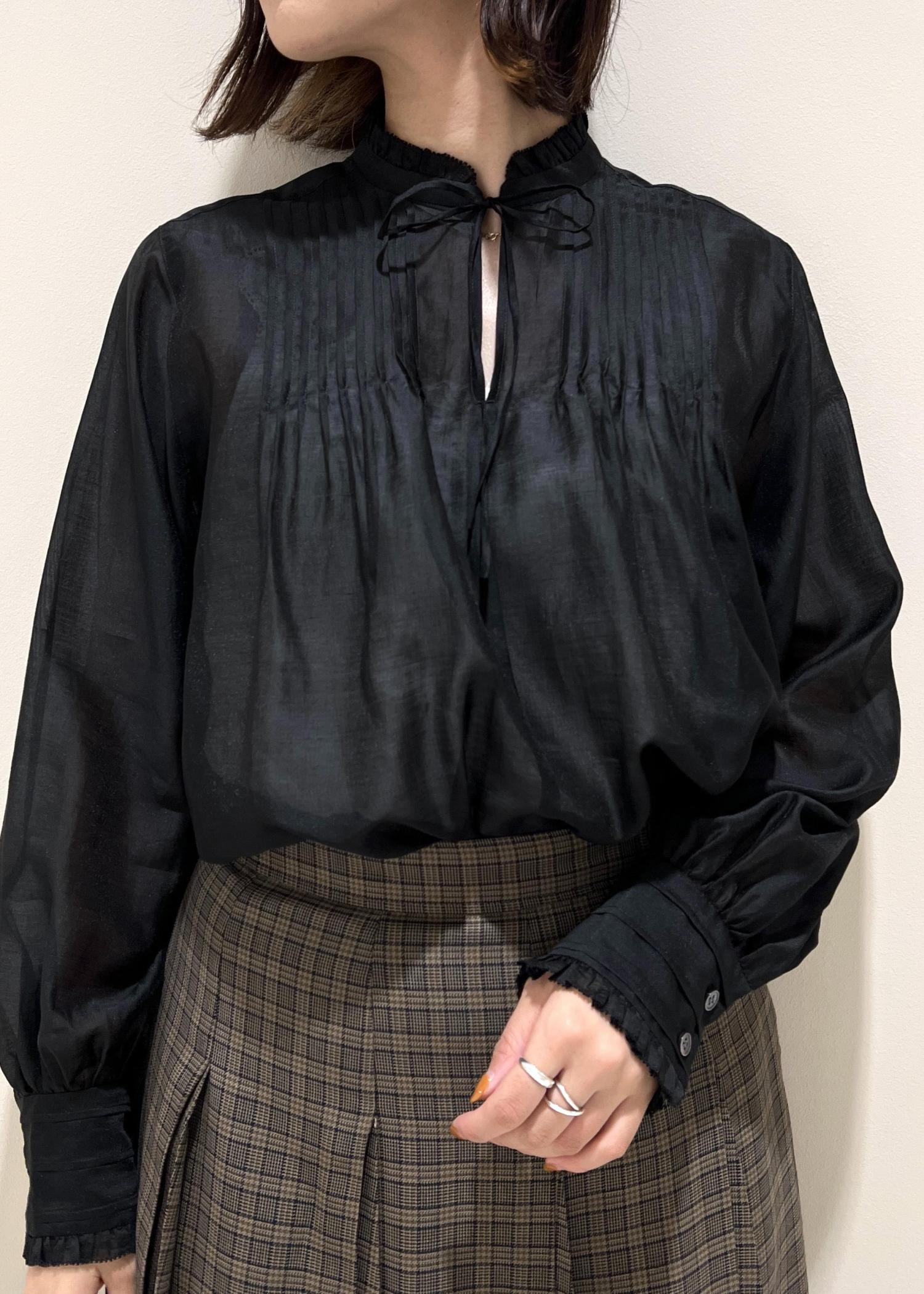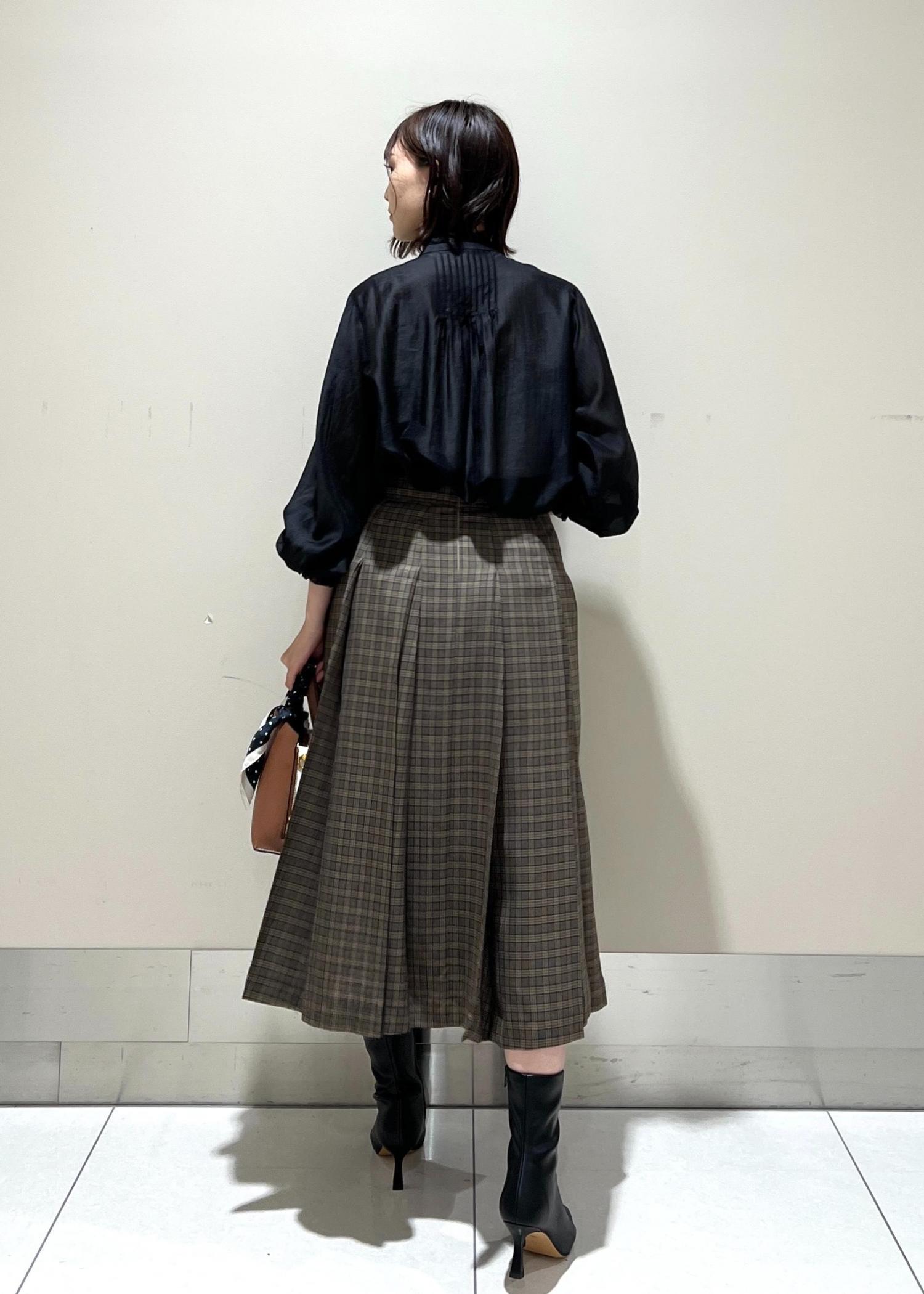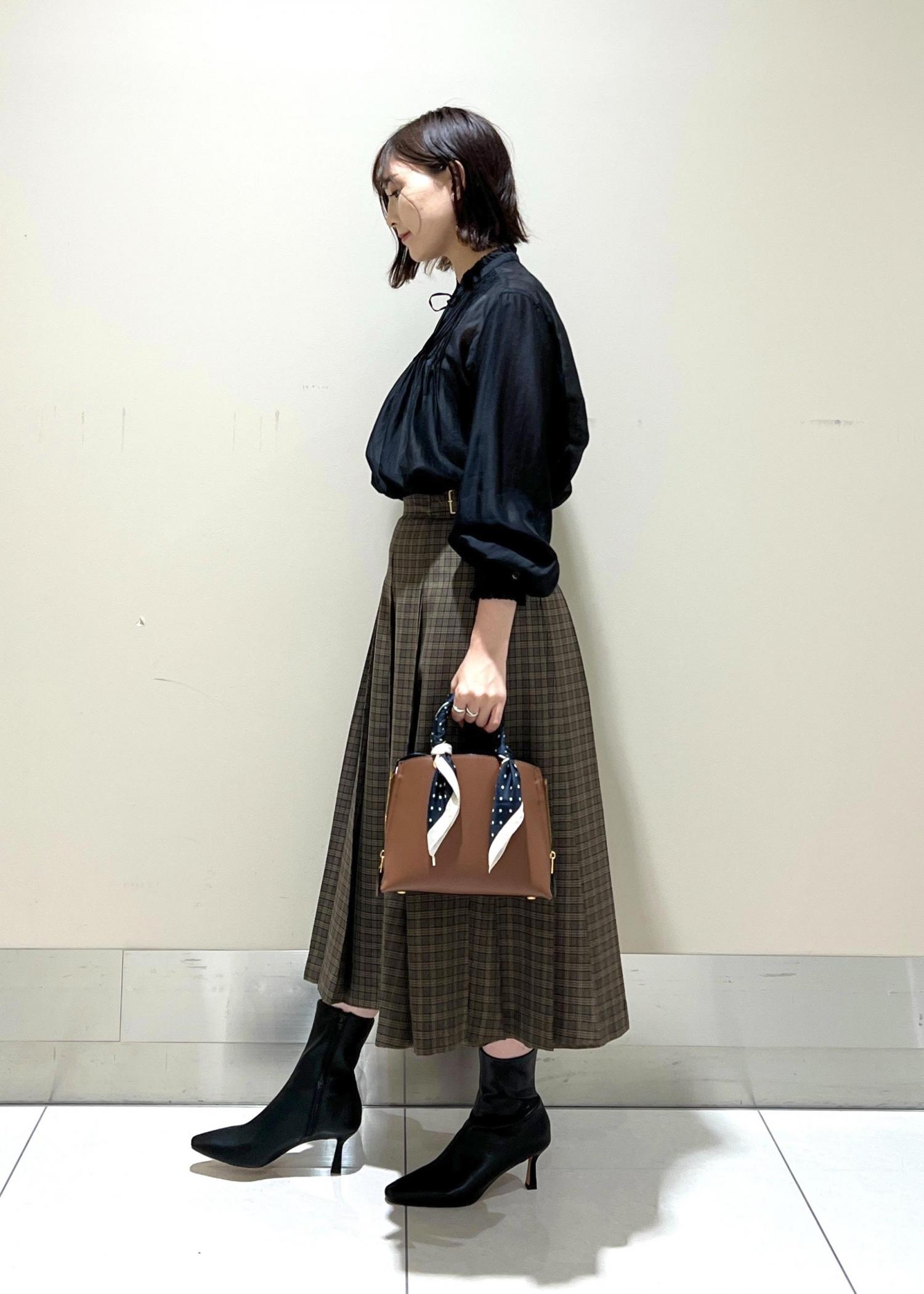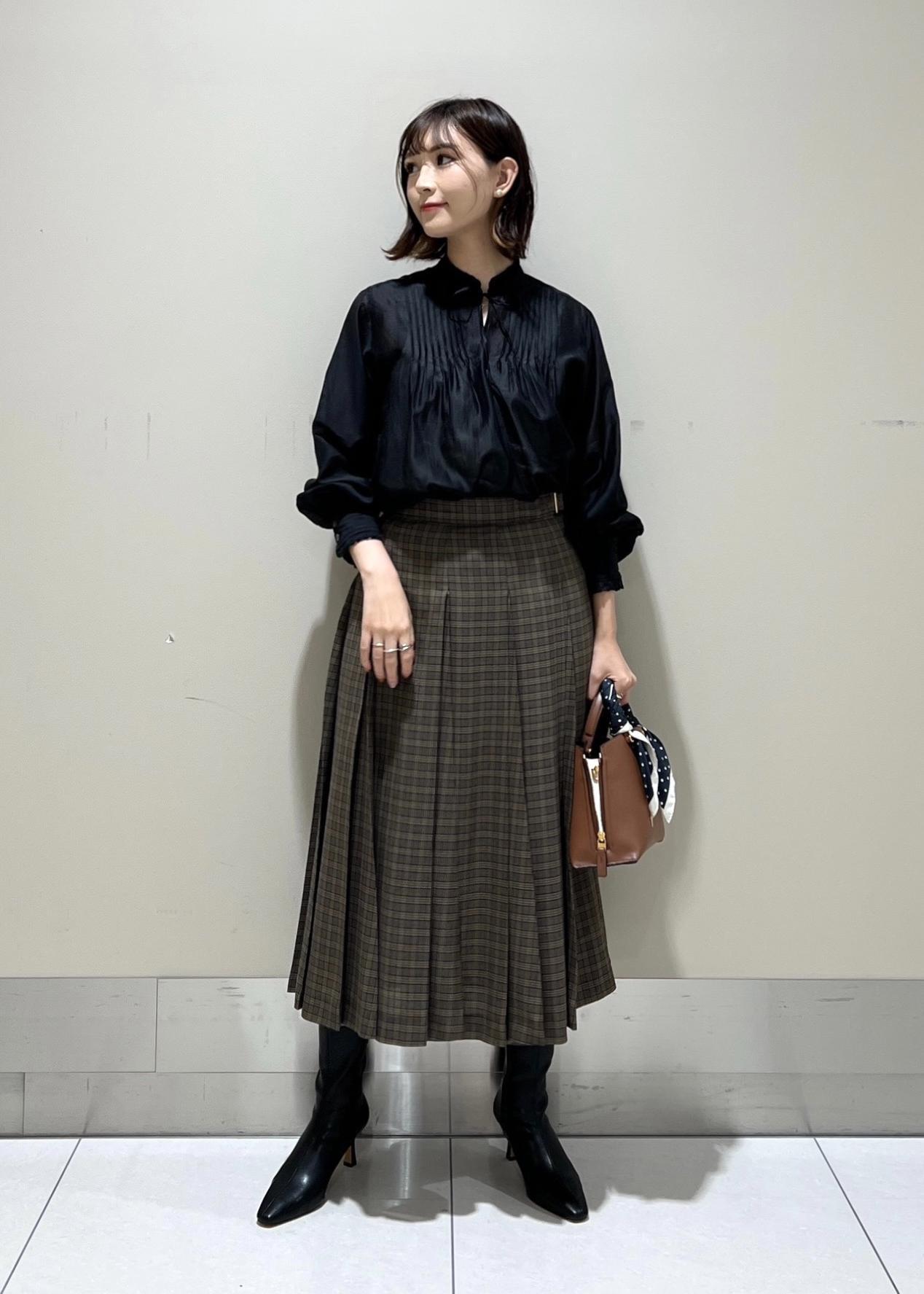 ブラックのデザインブラウスに、プリーツ感がきれいなフレアスカートを合わせ、秋のお出掛けコーデにしてみました♪
