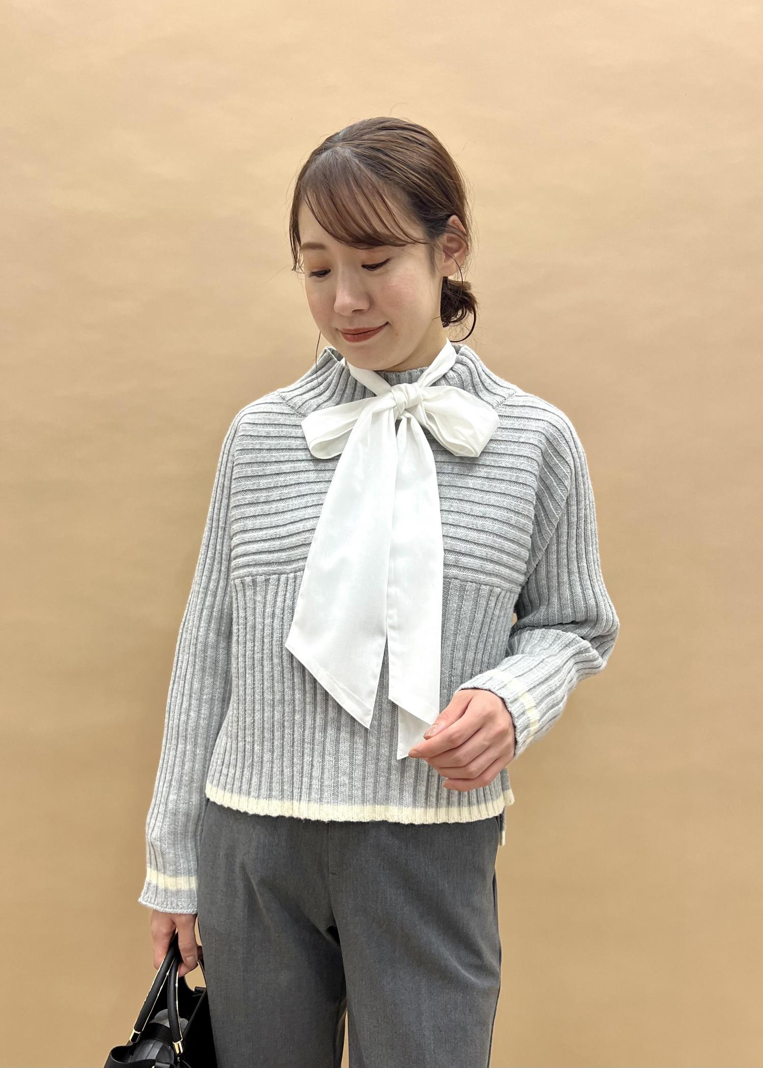 リボン付きブラウスをレイヤードして、甘めトラッドな印象にさせました。